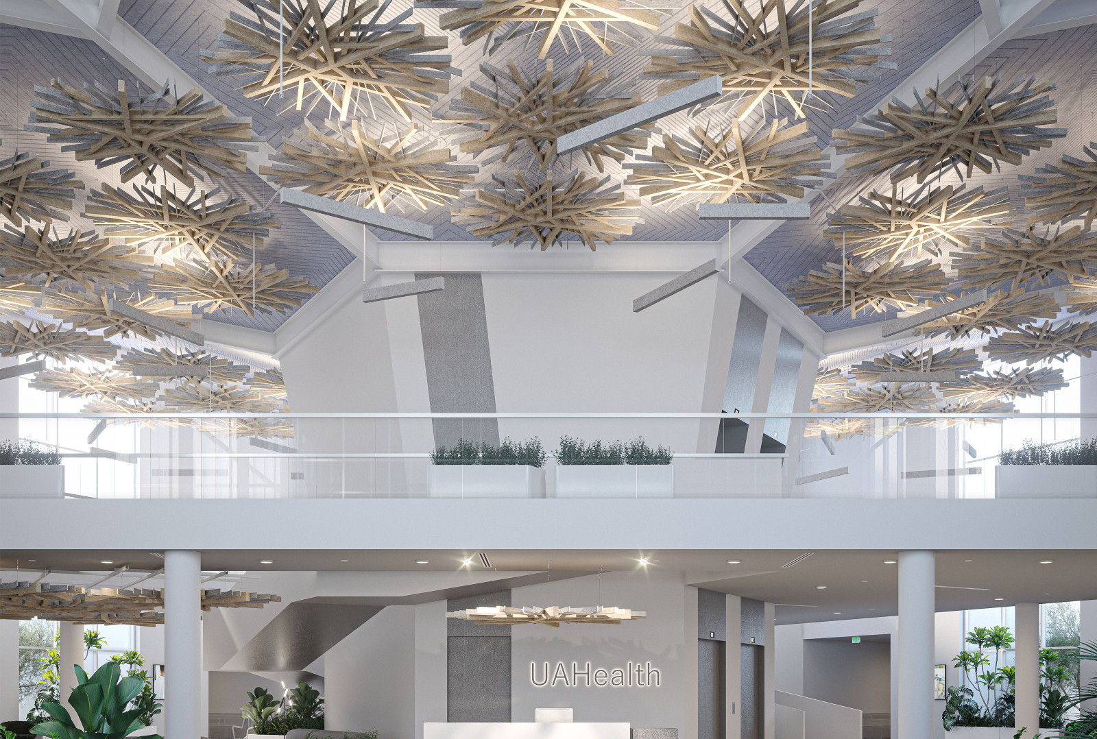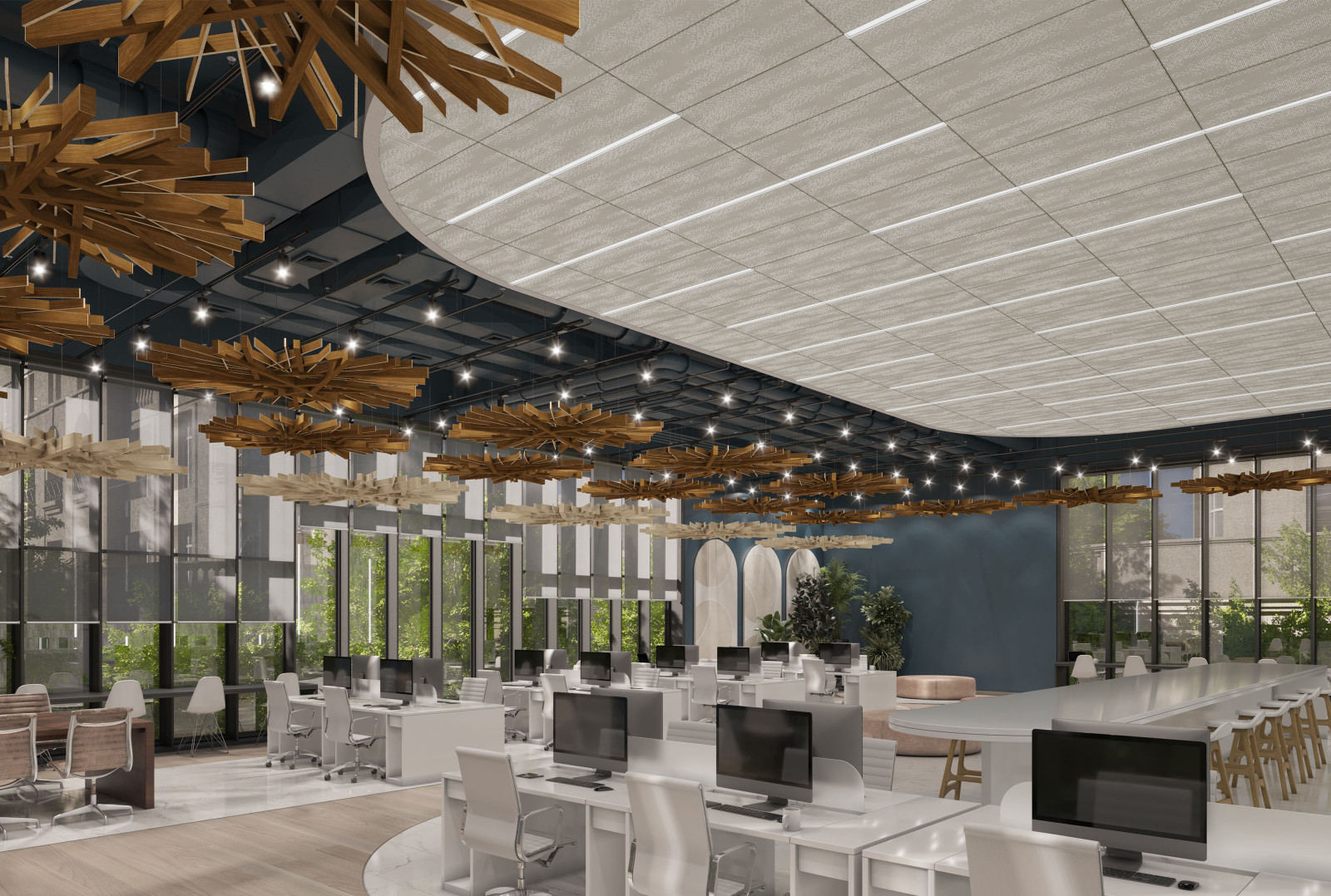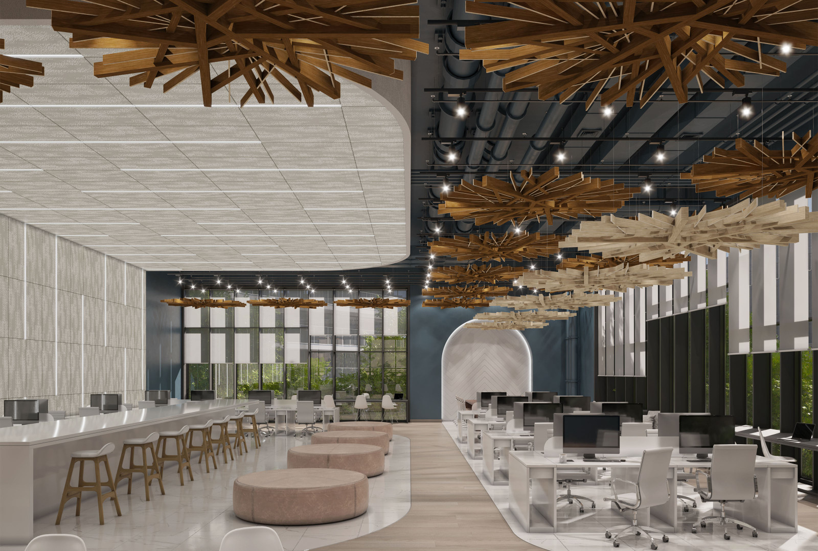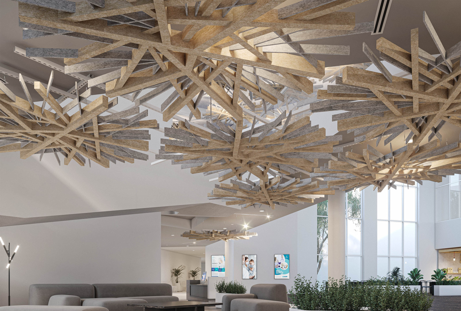 Arborisa®'s biophilic acoustic modules channel natural inspirations to craft a collection of designs that combine organically angular accents and abstract linear forms. These large-scale acoustic clouds span across spaces, providing robust auditory coverage to inhabitants below. Designed to emulate the expansive look of a tree canopy, these modules, made of our Soft Sound® acoustic material, branch off in various directions, providing an array of acoustic coverage whether as a single module or grouped together. The elevated aesthetic of this acoustic cloud system arrives in four naturally expansive designs: Arborisa® Nest, Arborisa® Axil, Arborisa® Aura, and Arborisa® Denza. Get A Quote