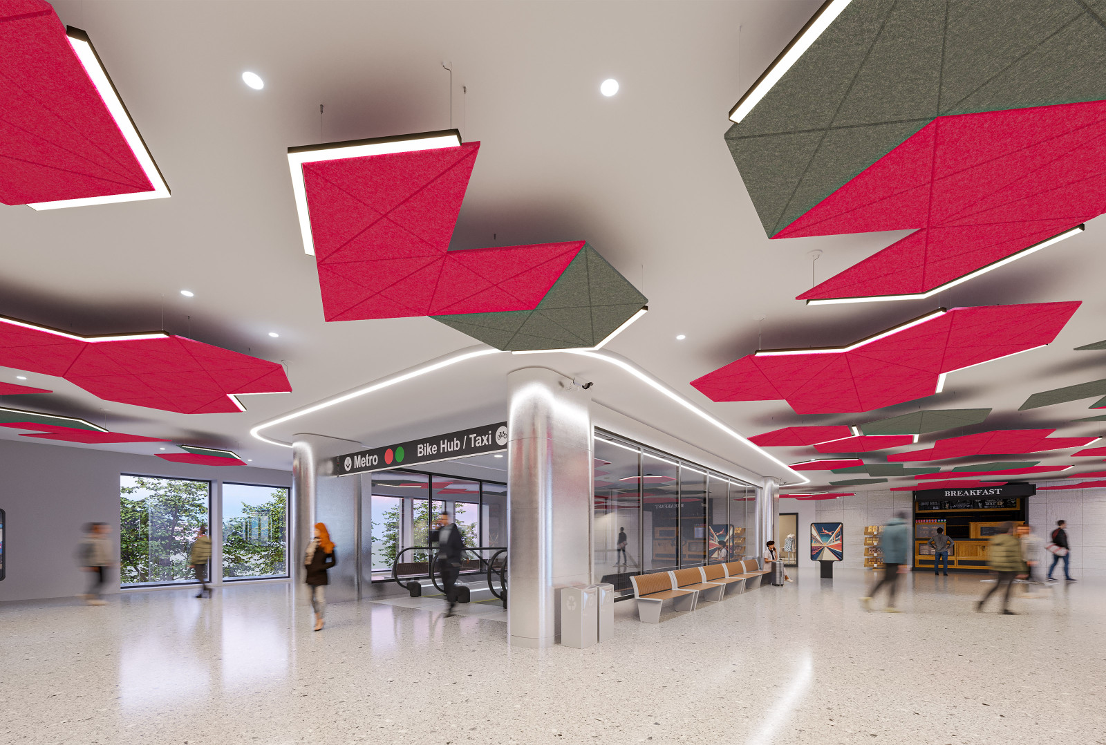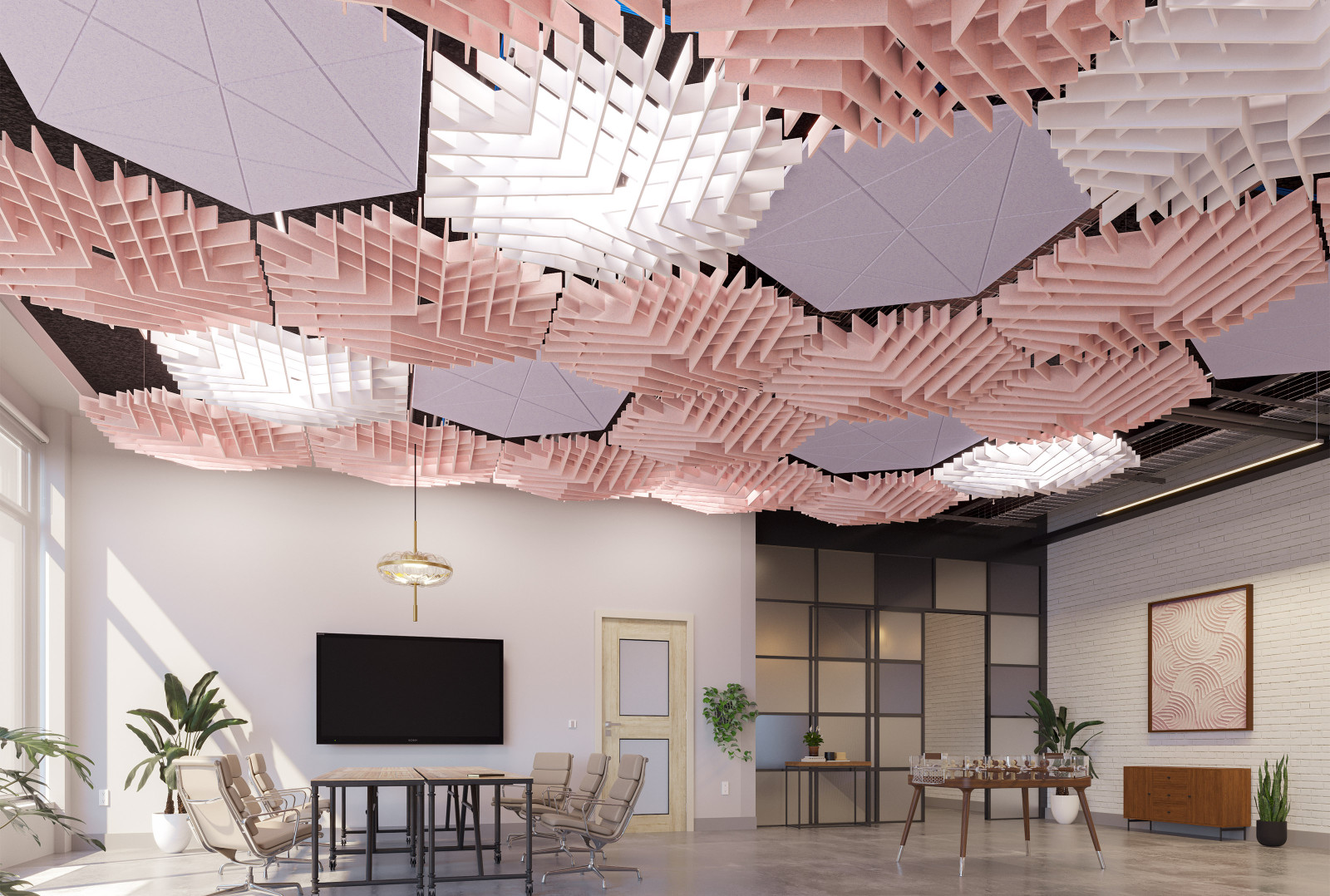 GeoSound™ Diamonds are available in two distinct styles, cable suspended ceiling clouds, and direct mount units for wall attachment. Select the style or mix of styles to suit your layout vision.