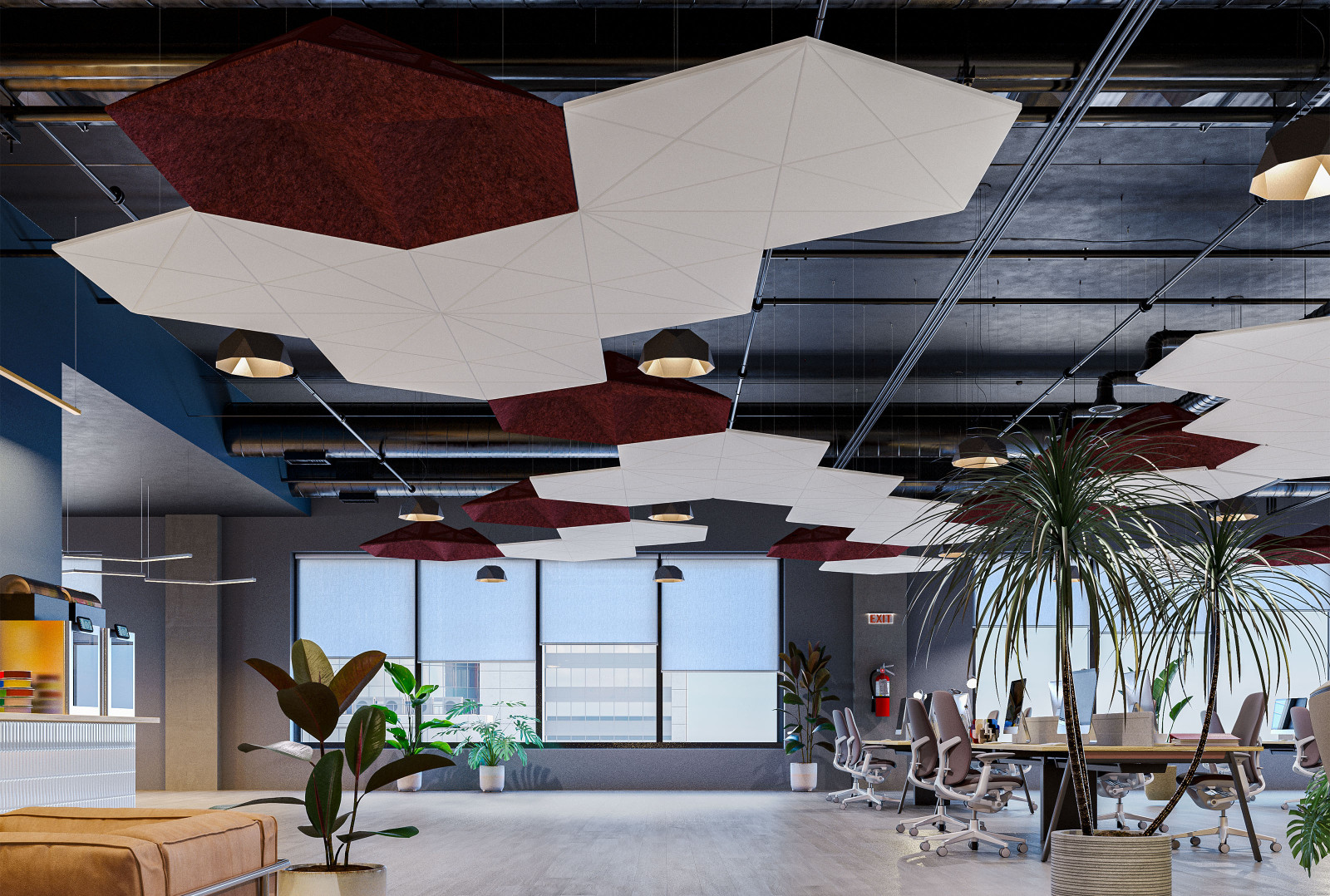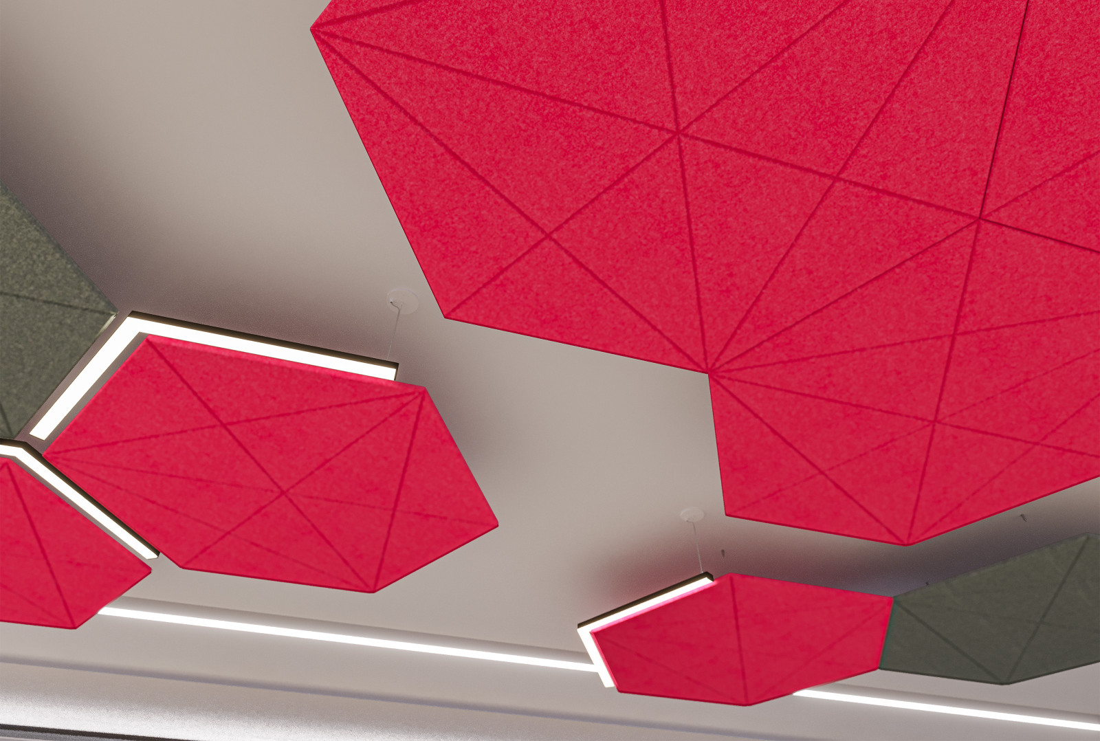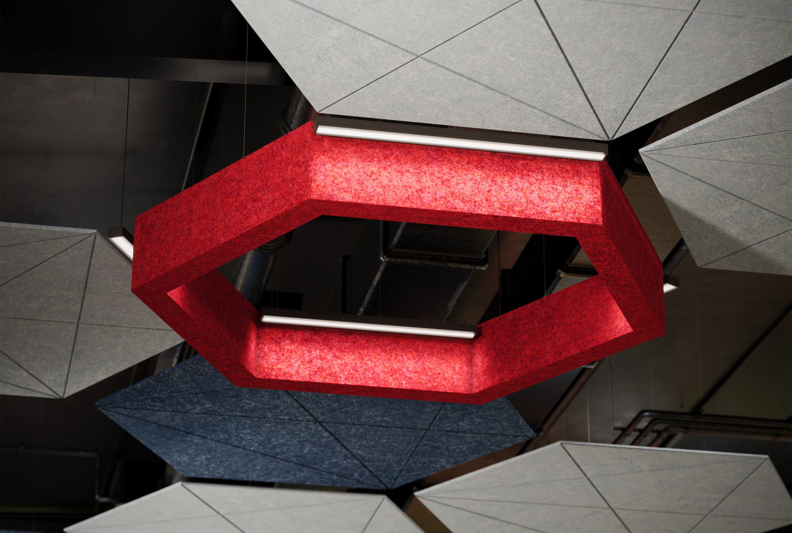 GeoSound™ Diamond is compatible with other hexagonal systems from Arktura, including SoundStar®, SoftGrid® Orbit, and SoftShapes® Hex, to fully immerse any space in acoustic attenuation.