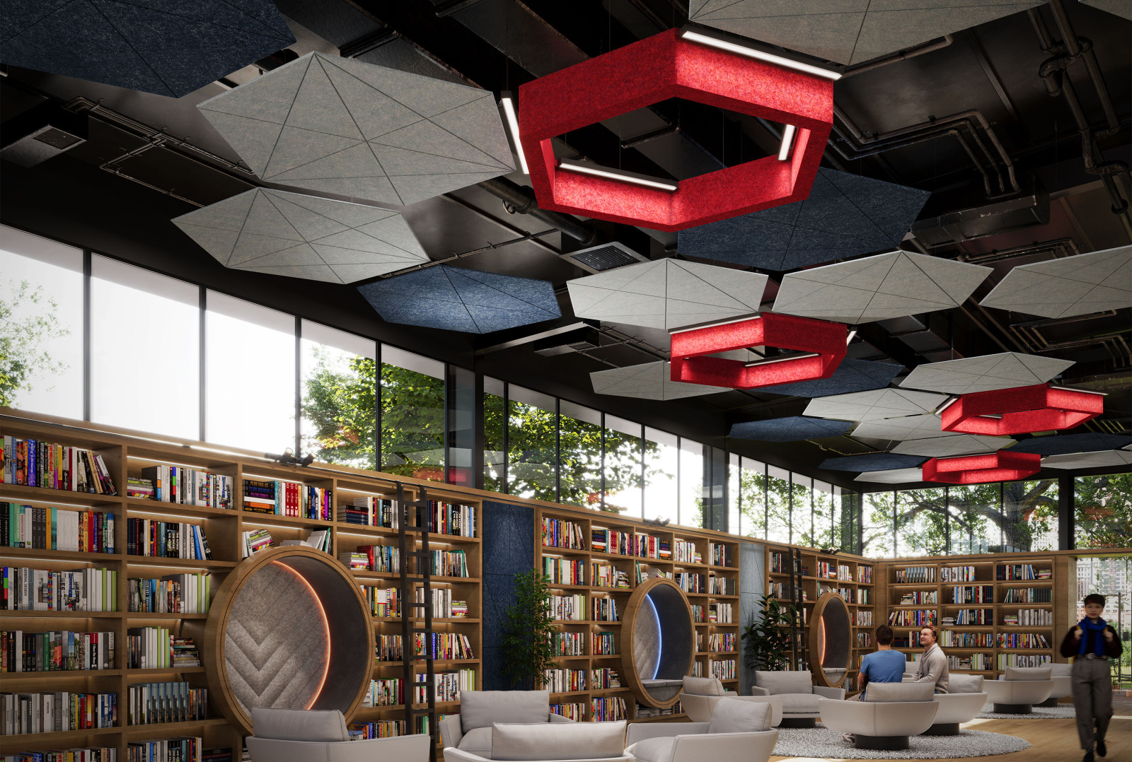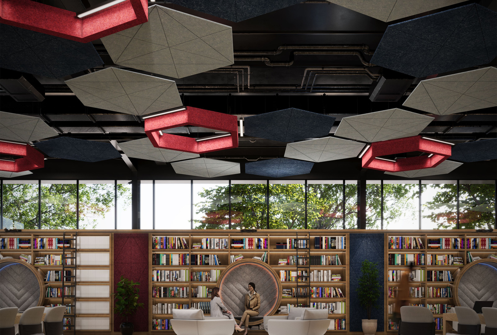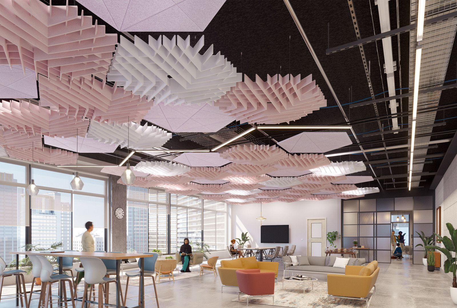 GeoSound™ Diamond is compatible with other hexagonal systems from Arktura, including SoundStar®, SoftGrid® Orbit, and SoftShapes® Hex, to fully immerse any space in acoustic attenuation.