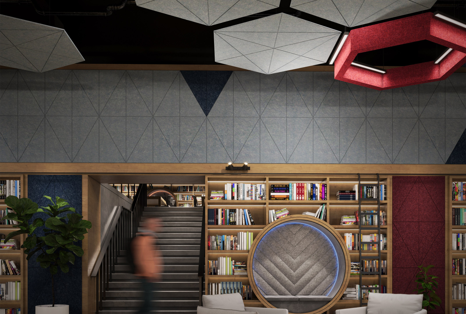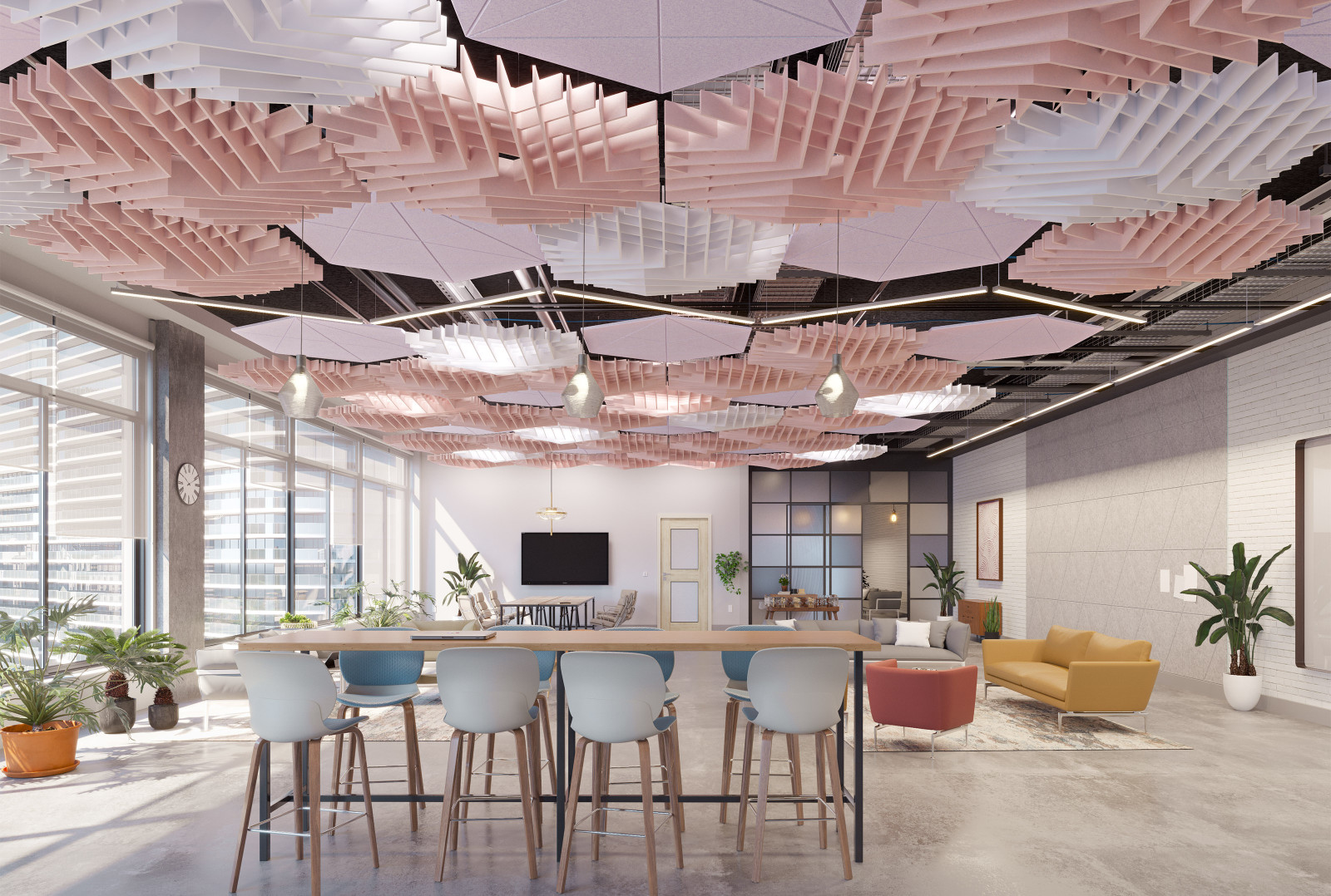 GeoSound™ Diamond’s unique gem-shaped design clusters beautifully in open areas or can be centralized where support is needed most. These geometric modules can be suspended individually as an acoustic cloud or wall mounted to create an immersive visual experience.