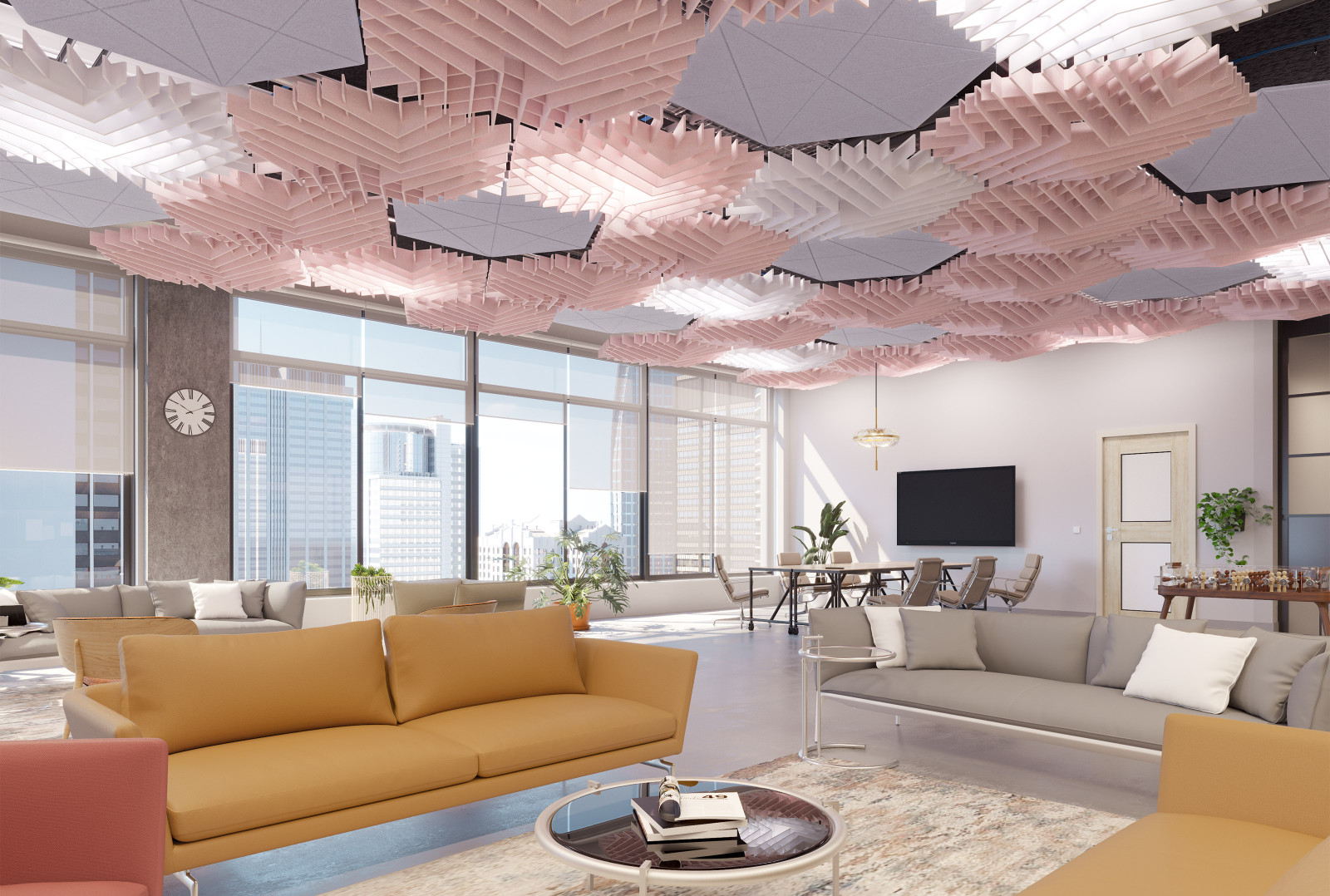 GeoSound™ Diamond’s Soft Sound® material reduces the impact of noise from everyday annoyances like ringing, typing, and chatter, resulting in a more pleasant and productive environment. This material works with a flat design to help reduce and control reverberations and diffuse sound, leaving a lasting impression at scale.
