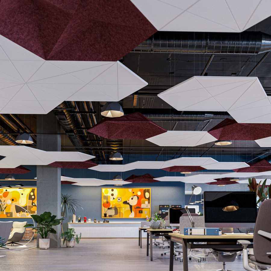 Modern acoustic design as stunning as it is versatile, GeoSound™ Diamond delivers streamlined geometric modularity. Its beveled, diamond-shaped form, inspired by our SoundStar® system, can be used in flat minimalist fields or clustered together to produce dazzling dimensional displays across ceilings or walls. Create hexagonal configurations that easily pair with existing geometric systems from Arktura to bring impressive acoustic coverage to any space. Diamonds can also be used across walls to create immersive installs. Made from our Soft Sound® acoustic material, this angular cloud system can be specified in over 30+ colorful finishes.