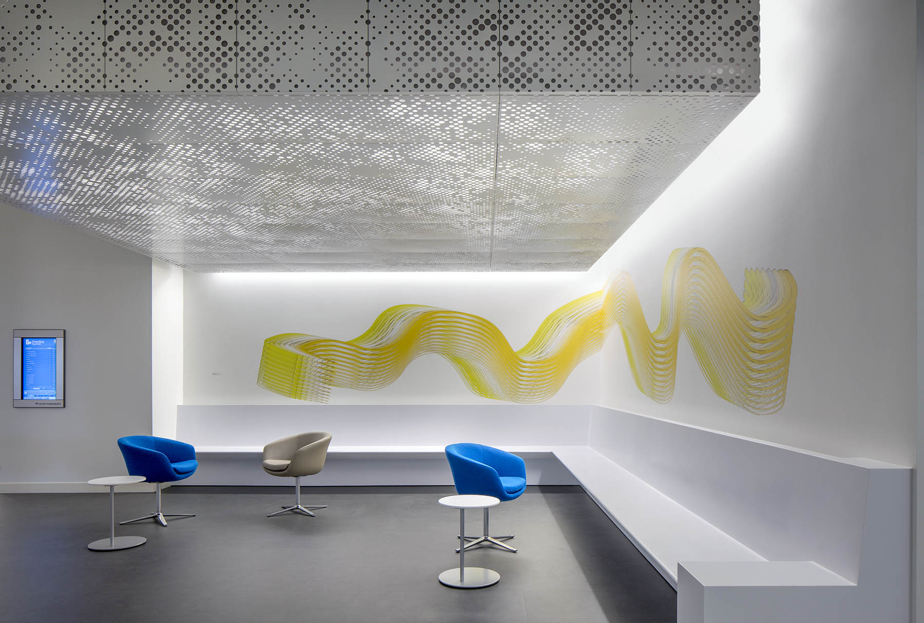 Synthesis Design and Architecture collaborated with Arktura’s Solutions Studio® to design and fabricate custom grooved geometric Soft Sound® through Dr. Ying Peng’s office. The acoustic wall-cladding system was thoughtfully integrated into surrounding windows, cascading into bench-like seating surfaces, and lessening the austere doors of the YPMD Pediatric Neurology Clinic. The grooves in the panels manage the sound of children playing. Simultaneously, the panels’ soothing heather grey color tones and soft tactile quality transform a commonly sterile and uncomfortable medical facility into a protected, inviting, and calming environment while entertaining and encouraging the wonder and creativity of its young patients and their families