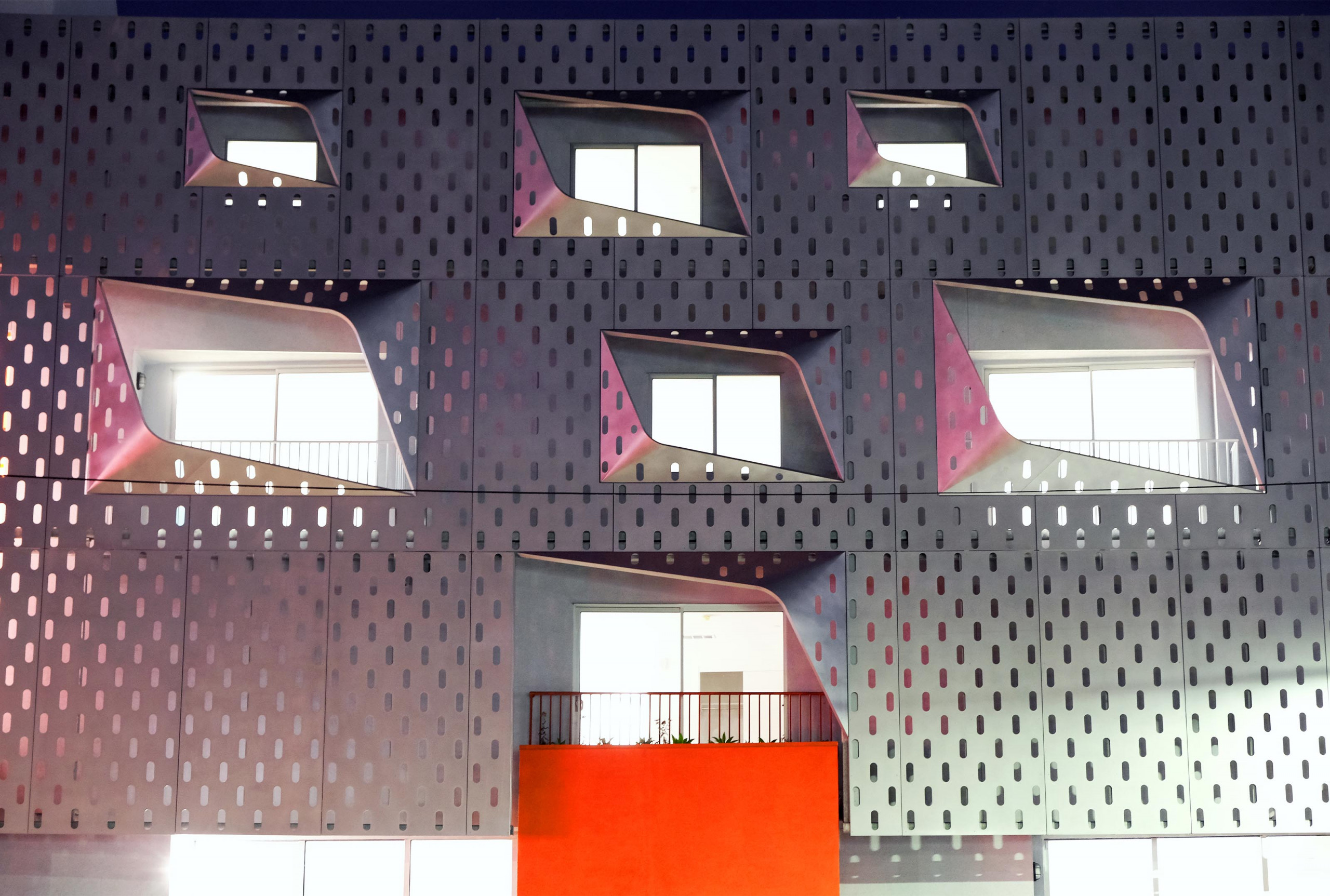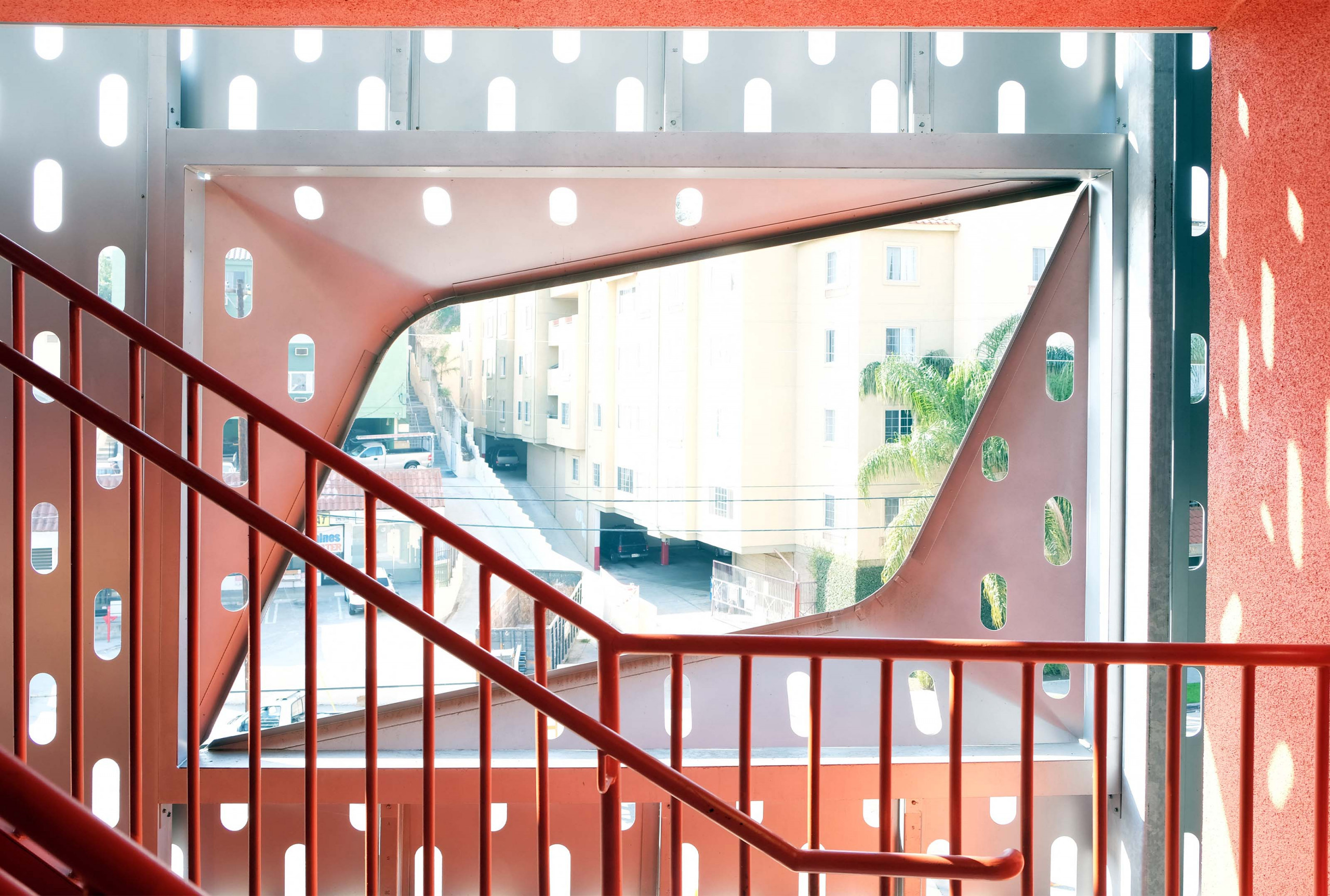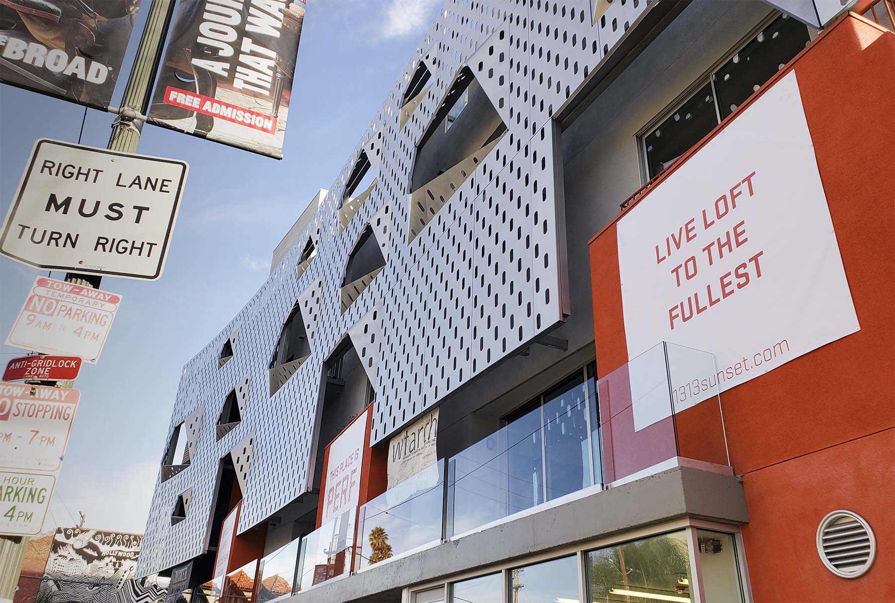 Los Angeles-based firm Warren Techentin Architecture enlisted Arktura to design and manufacture its Elysian Fields Artist Lofts exterior feature façade. The cladding comprised of Exterior Graphic Perf® designed in tandem with Arktura Solutions Studio® inspired by nearby storefronts. The perforated and formed aluminum panels gently curve along Sunset Boulevard providing protection against the harsh sun. It supports flared voids to allow the inclusion of expansive sliding windows for the residences within. In keeping up with the ever-changing eclectic character of Los Angeles, this project provides a parametric poem of perforations to the neighborhood it graciously nests within.