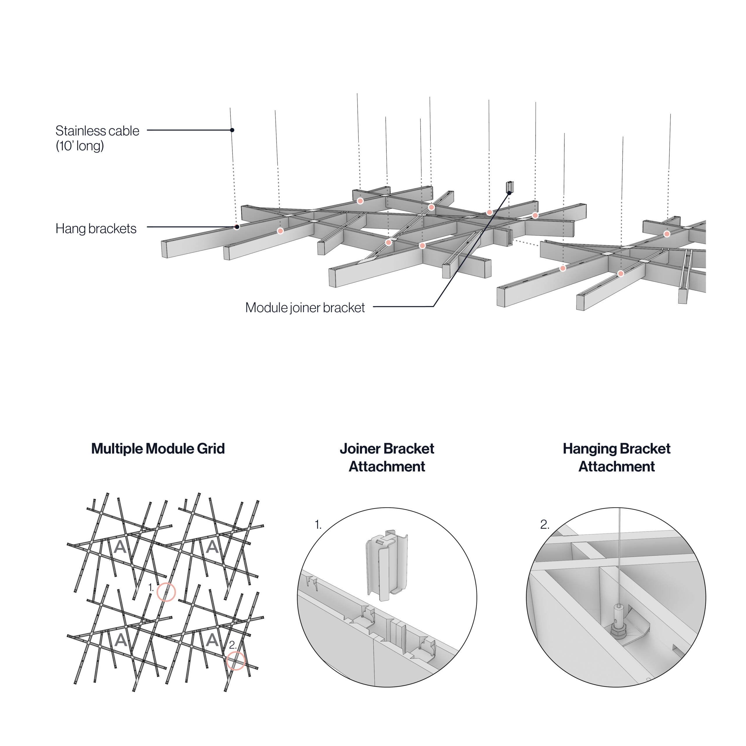 Arborisa’s open grid design makes integrating systems above or below the modules simple and feasible. Easily removable fins and open structure makes accessing lights, HVAC, rigging points, plumbing, AV equipment, and life safety systems easy for your maintenance team.