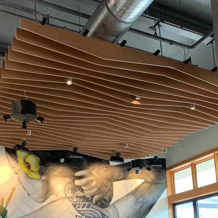 Rise’s ceiling baffles form a faceted series of geometric planes, it’s sharp angles keep your eye engaged along its path as it continues to cut back and forth peeling away new layers. But don’t worry, the path is a quiet one thanks to the Soft Sound® fins which provide acoustic control to any space on Rise’s trail.