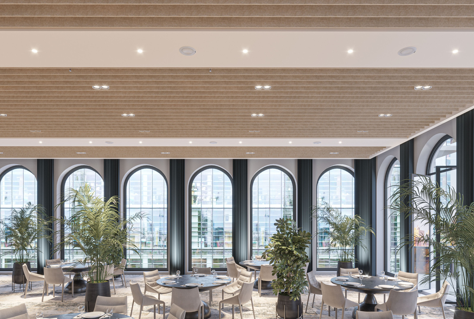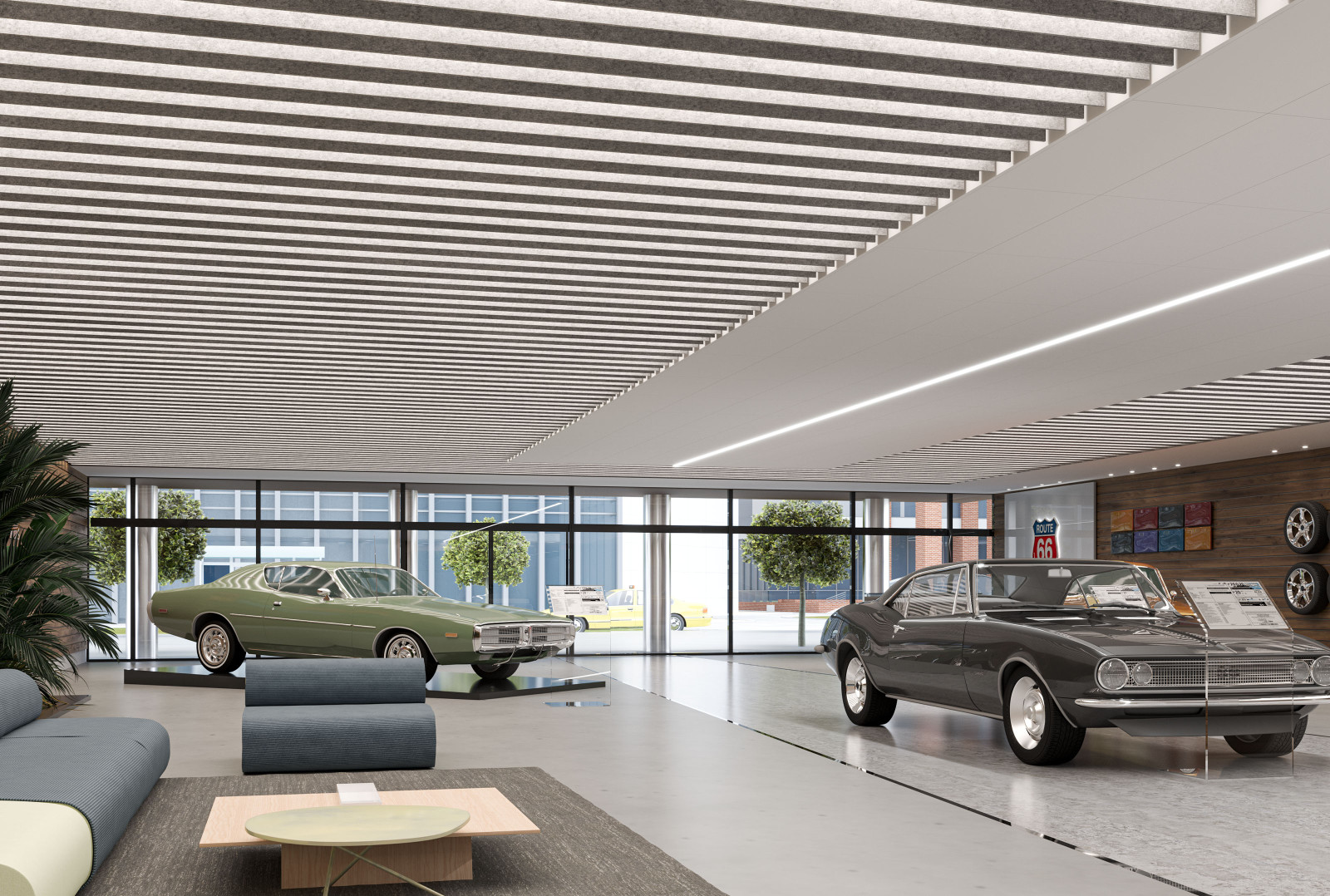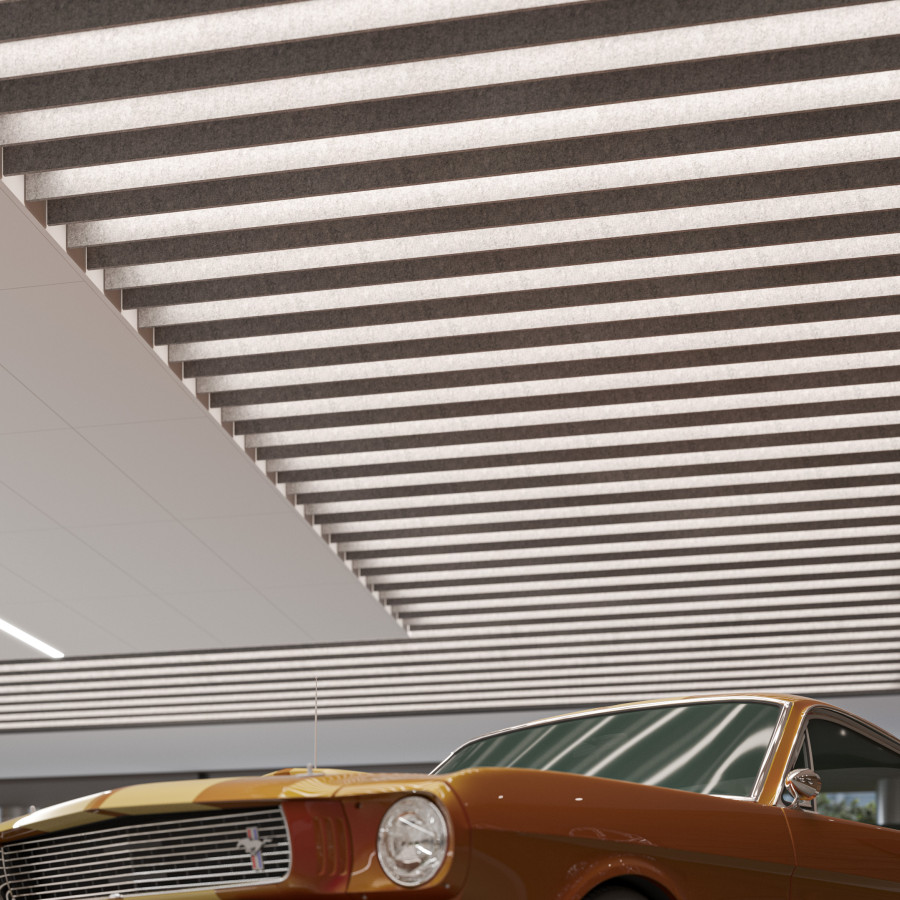 Utilizing a hidden fin and frame alignment system Atmosphera® Versa provides continuity in all directions across your space. Our custom formulated material thickness and density ensures rigidity that limits deflection.
