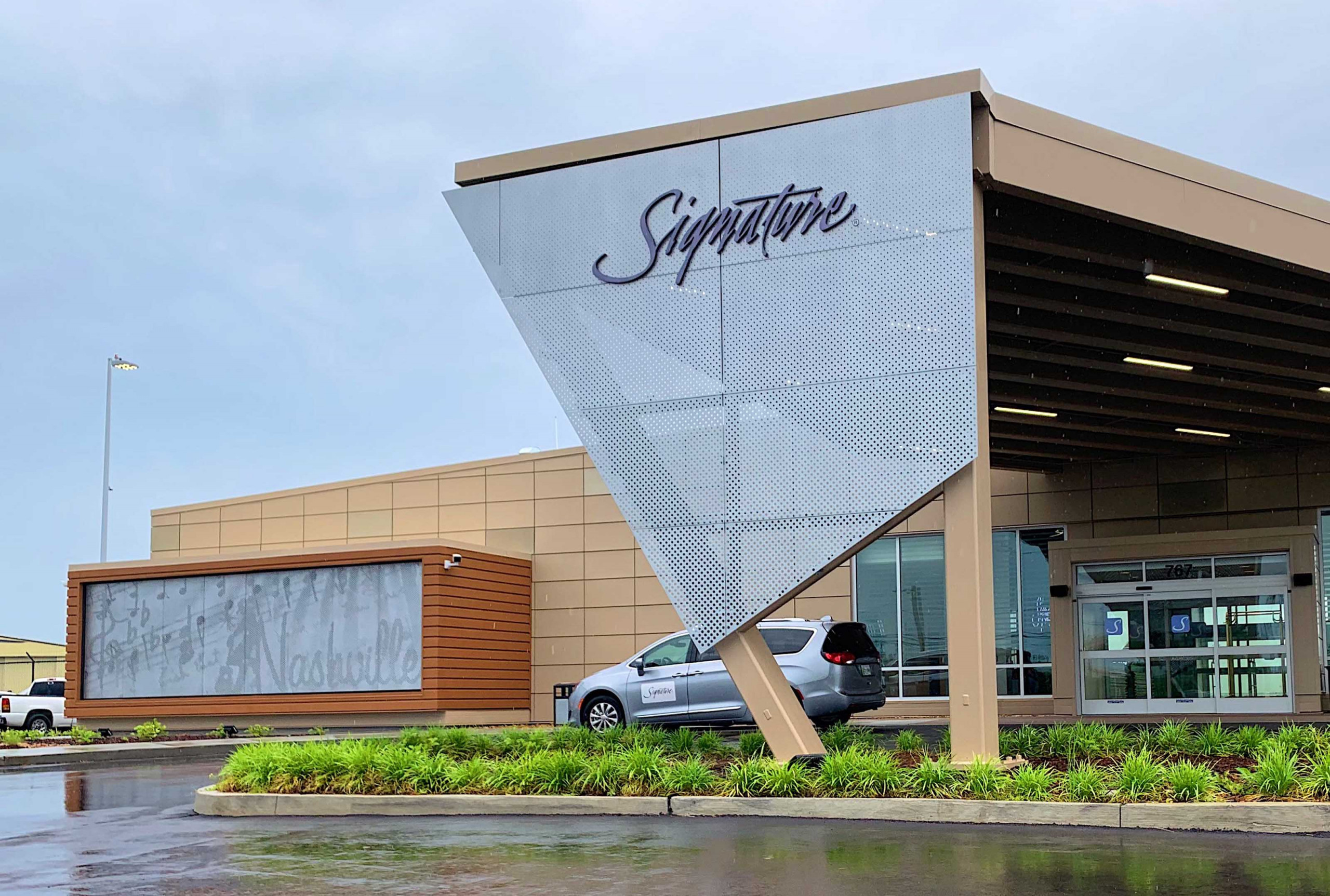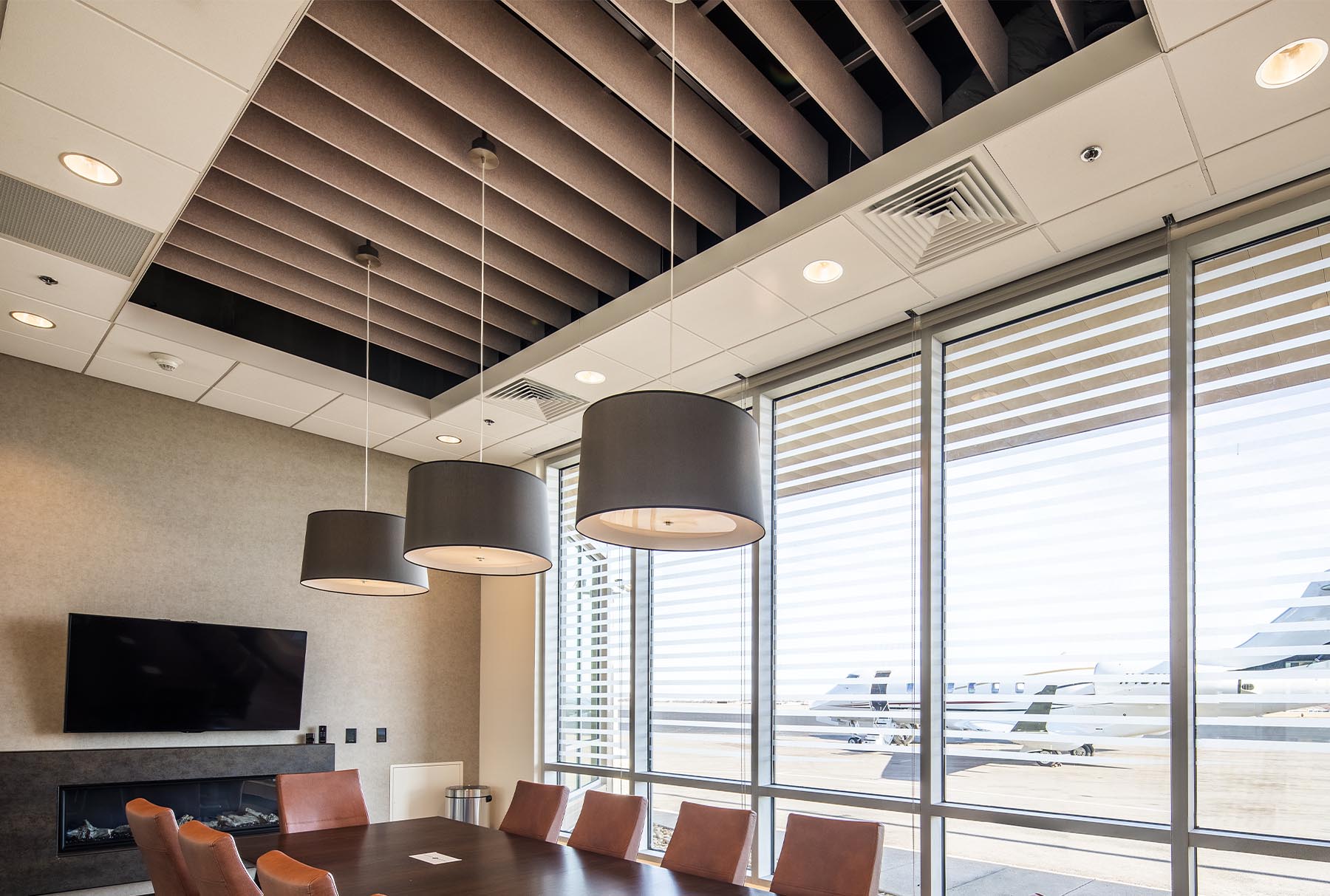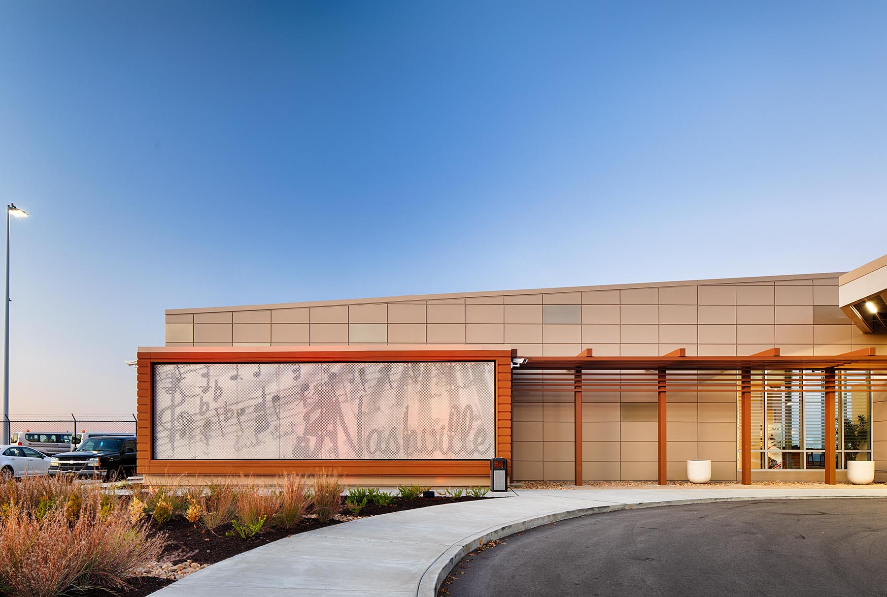 Signature FS unveiled their new FBO terminal at Nashville International Airport, featuring numerous systems and solutions by Arktura. Travelers and pilots are greeted upon arrival with an extensive Graphic Perf® Custom Photoreal Exterior treatment, paying homage to Nashville’s iconic music legacy. For the interior, SoftGrid® Wave system is paired with the subtle, complementary system, Atmosphera® Linea, to communicate an environment acoustically attuned to luxury. The naturally tonal variations of Arktura’s materials compliment Signature’s artifacts, from musicians and celebrities who pass through their gates, prominently displayed through the terminal design.