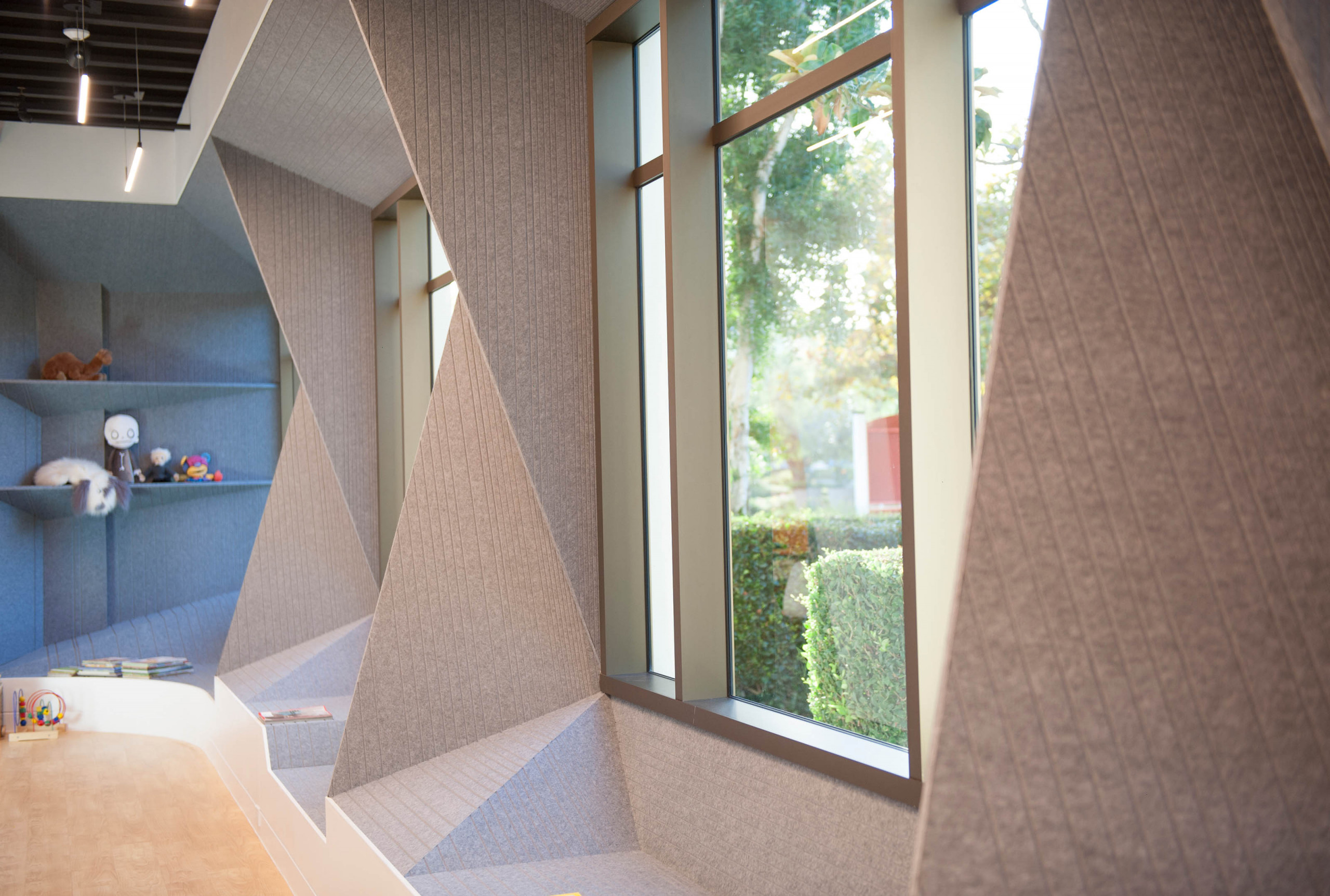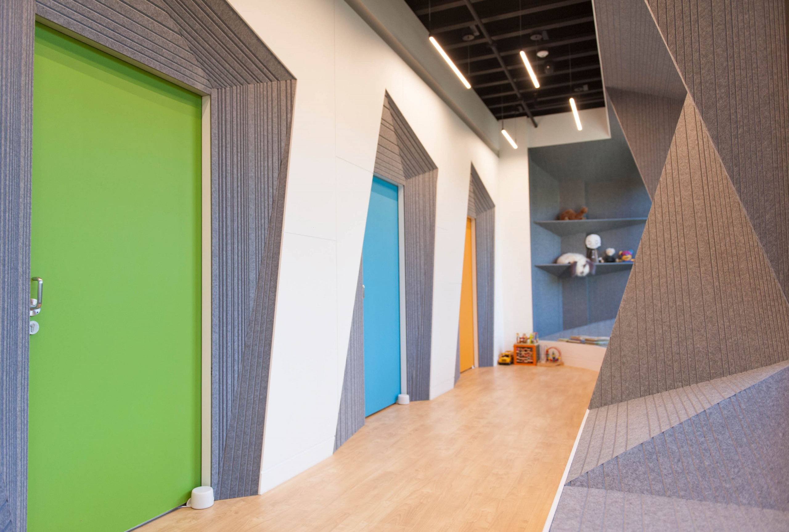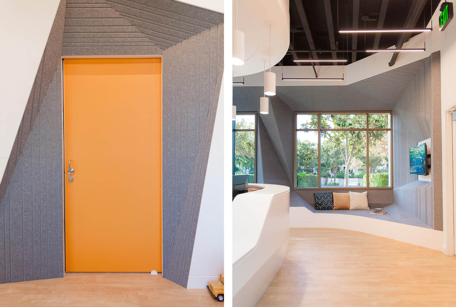 Synthesis Design and Architecture collaborated with Arktura’s Solutions Studio® to design and fabricate custom grooved geometric Soft Sound® through Dr. Ying Peng’s office. The acoustic wall-cladding system was thoughtfully integrated into surrounding windows, cascading into bench-like seating surfaces, and lessening the austere doors of the YPMD Pediatric Neurology Clinic. The grooves in the panels manage the sound of children playing. Simultaneously, the panels’ soothing heather grey color tones and soft tactile quality transform a commonly sterile and uncomfortable medical facility into a protected, inviting, and calming environment while entertaining and encouraging the wonder and creativity of its young patients and their families.