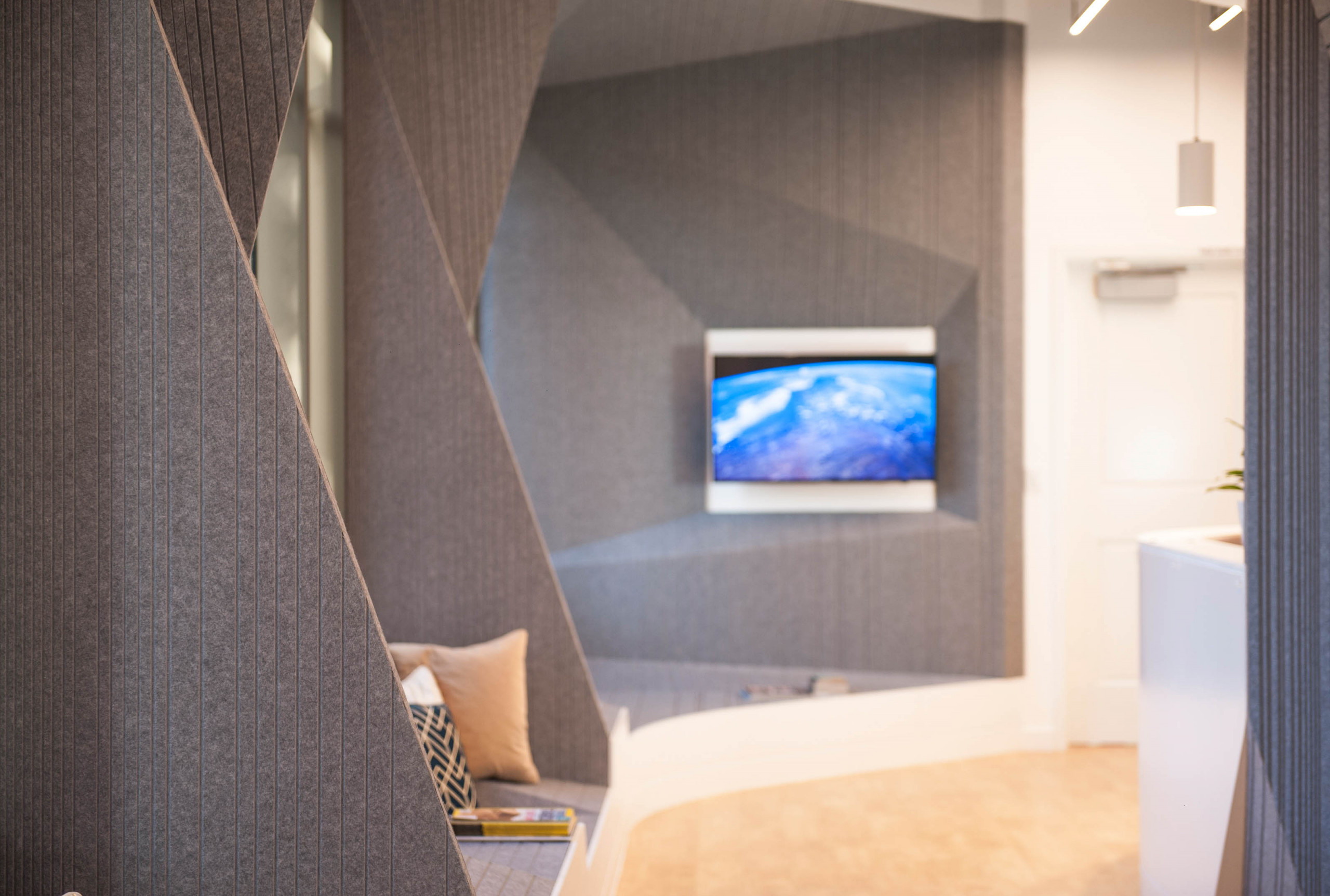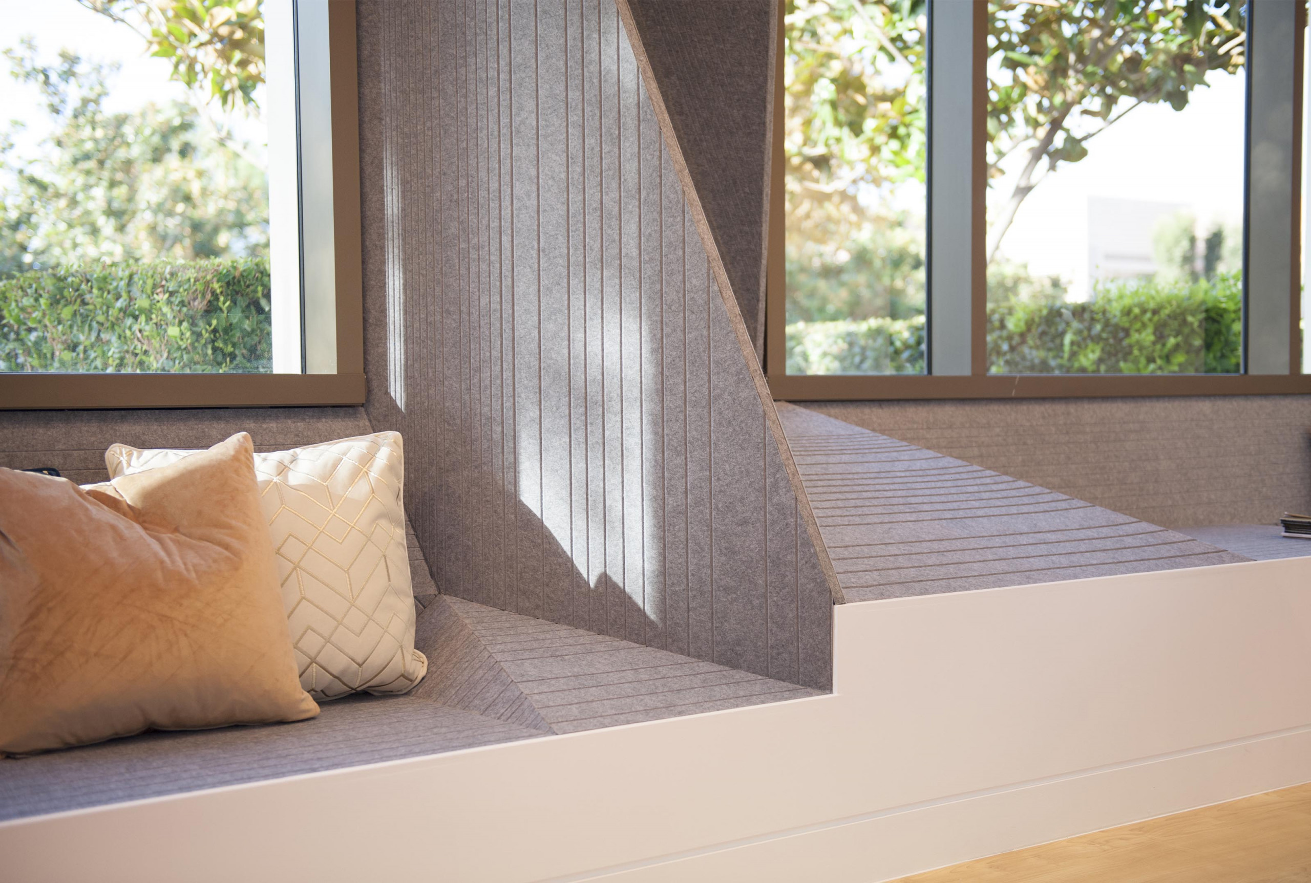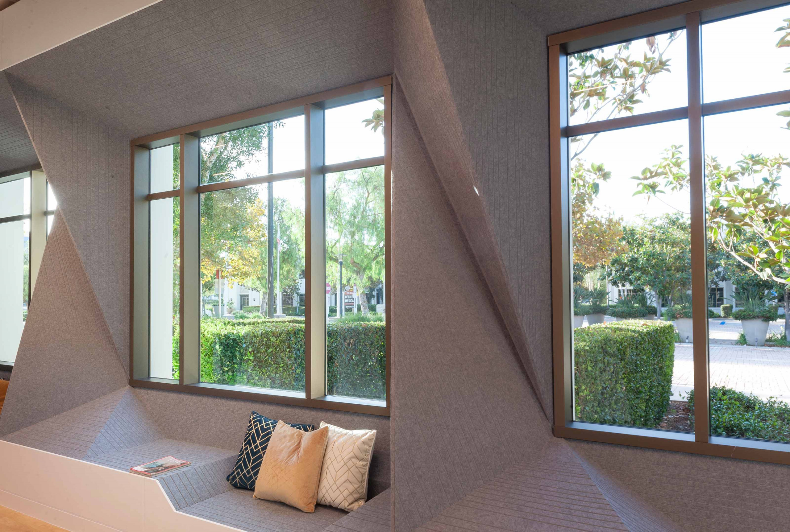 Synthesis Design and Architecture collaborated with Arktura’s Solutions Studio® to design and fabricate custom grooved geometric Soft Sound® through Dr. Ying Peng’s office. The acoustic wall-cladding system was thoughtfully integrated into surrounding windows, cascading into bench-like seating surfaces, and lessening the austere doors of the YPMD Pediatric Neurology Clinic. The grooves in the panels manage the sound of children playing. Simultaneously, the panels’ soothing heather grey color tones and soft tactile quality transform a commonly sterile and uncomfortable medical facility into a protected, inviting, and calming environment while entertaining and encouraging the wonder and creativity of its young patients and their families.