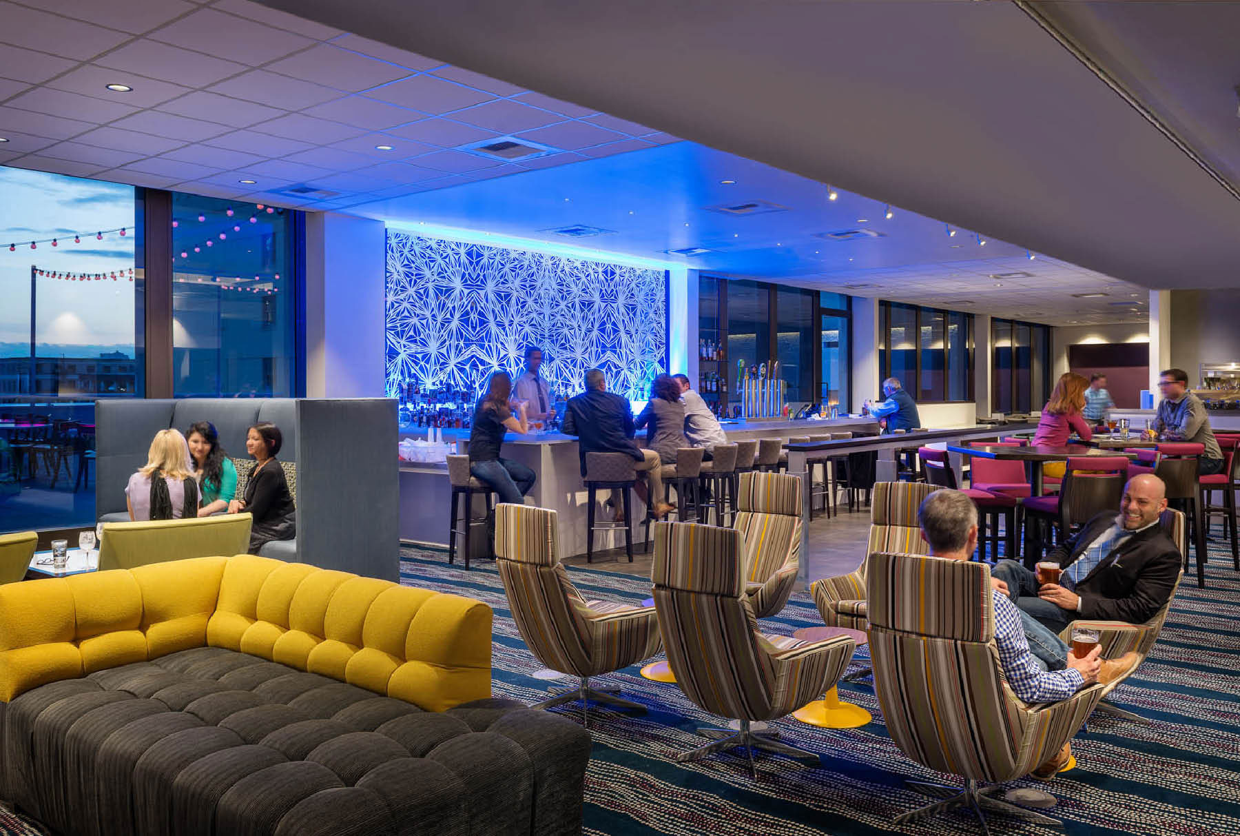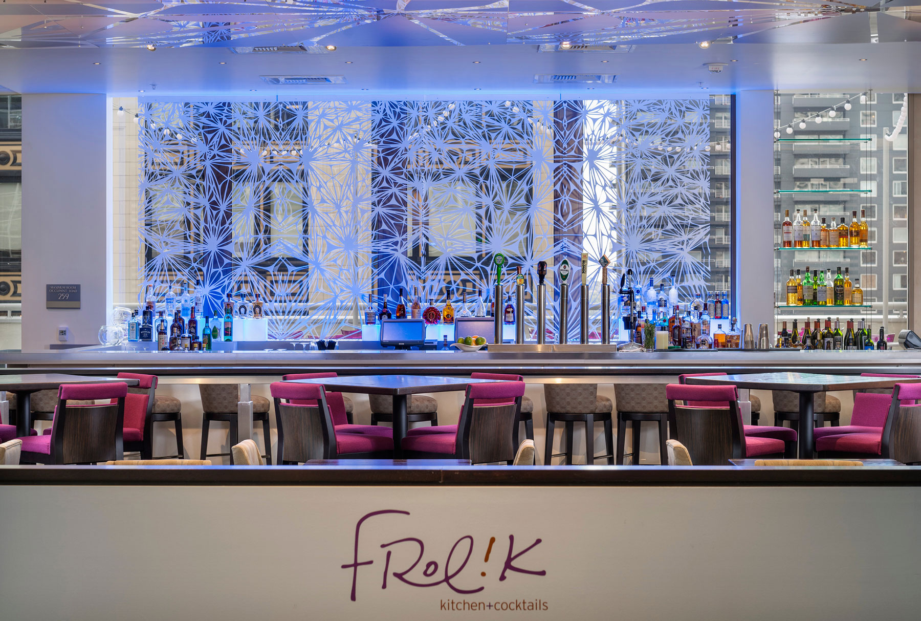 The perforated screens created for Frolik Kitchen + Cocktails in Seattle utilize the pattern from Arktura’s Nebula furniture collection to divide the bar from the patio while permitting visual continuity and engagement between the two spaces. The layering of the laser cut steel panels gives depth to the system and creates an intriguing moiré effect.