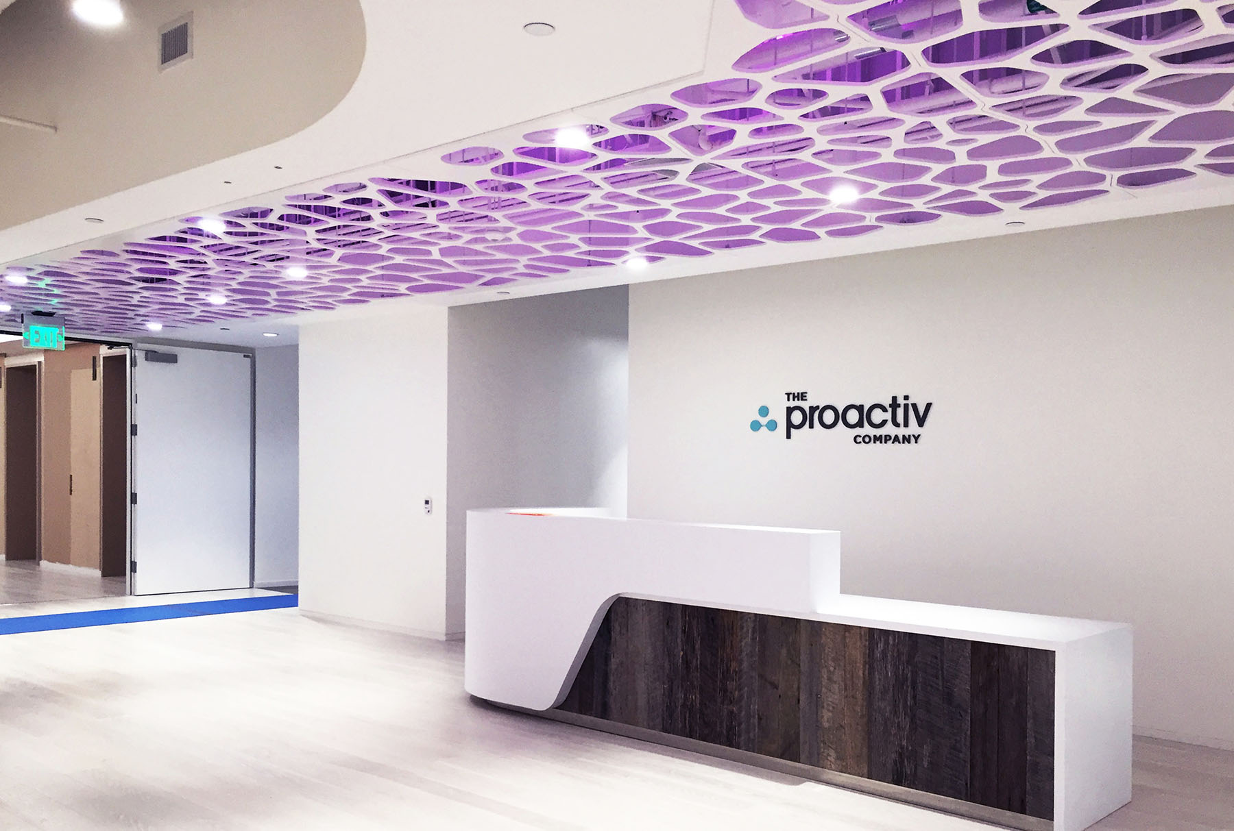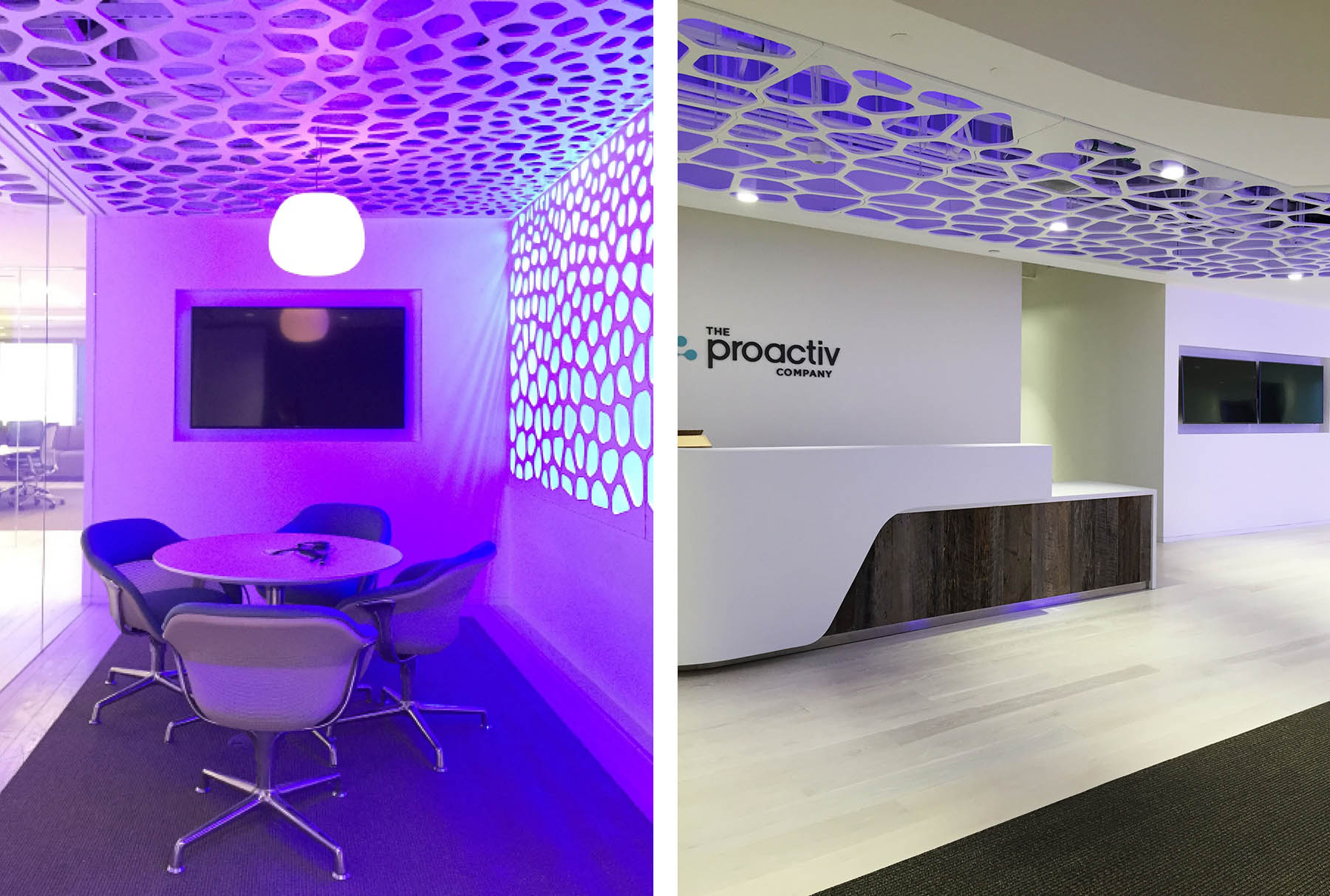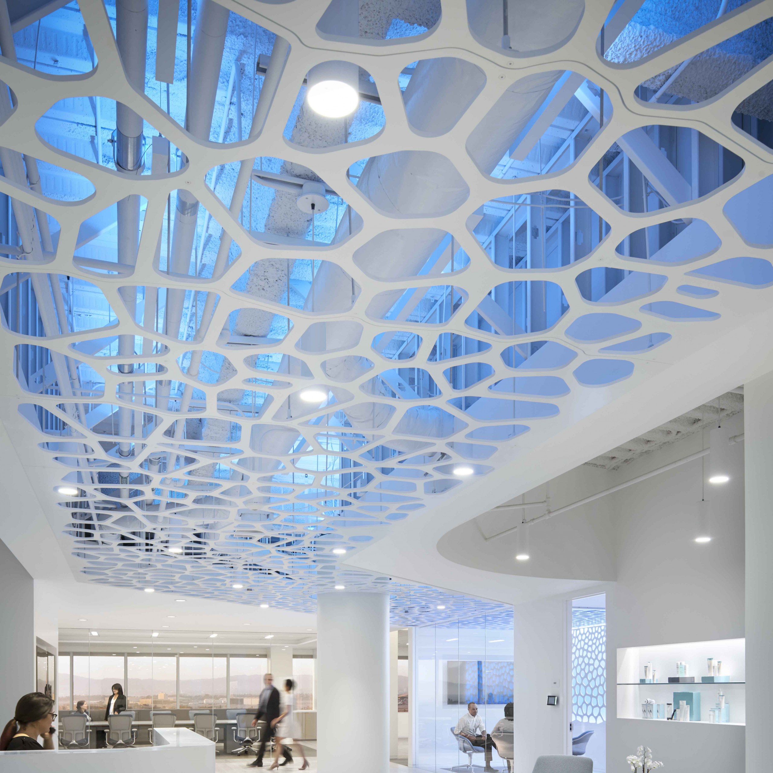 A custom illuminated ceiling system that borrows design cues from cellular and molecular forms.