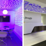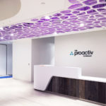 A custom illuminated ceiling system that borrows design cues from cellular and molecular forms.