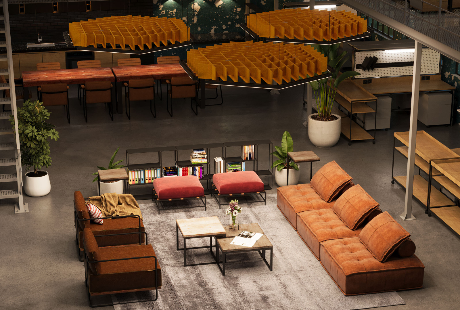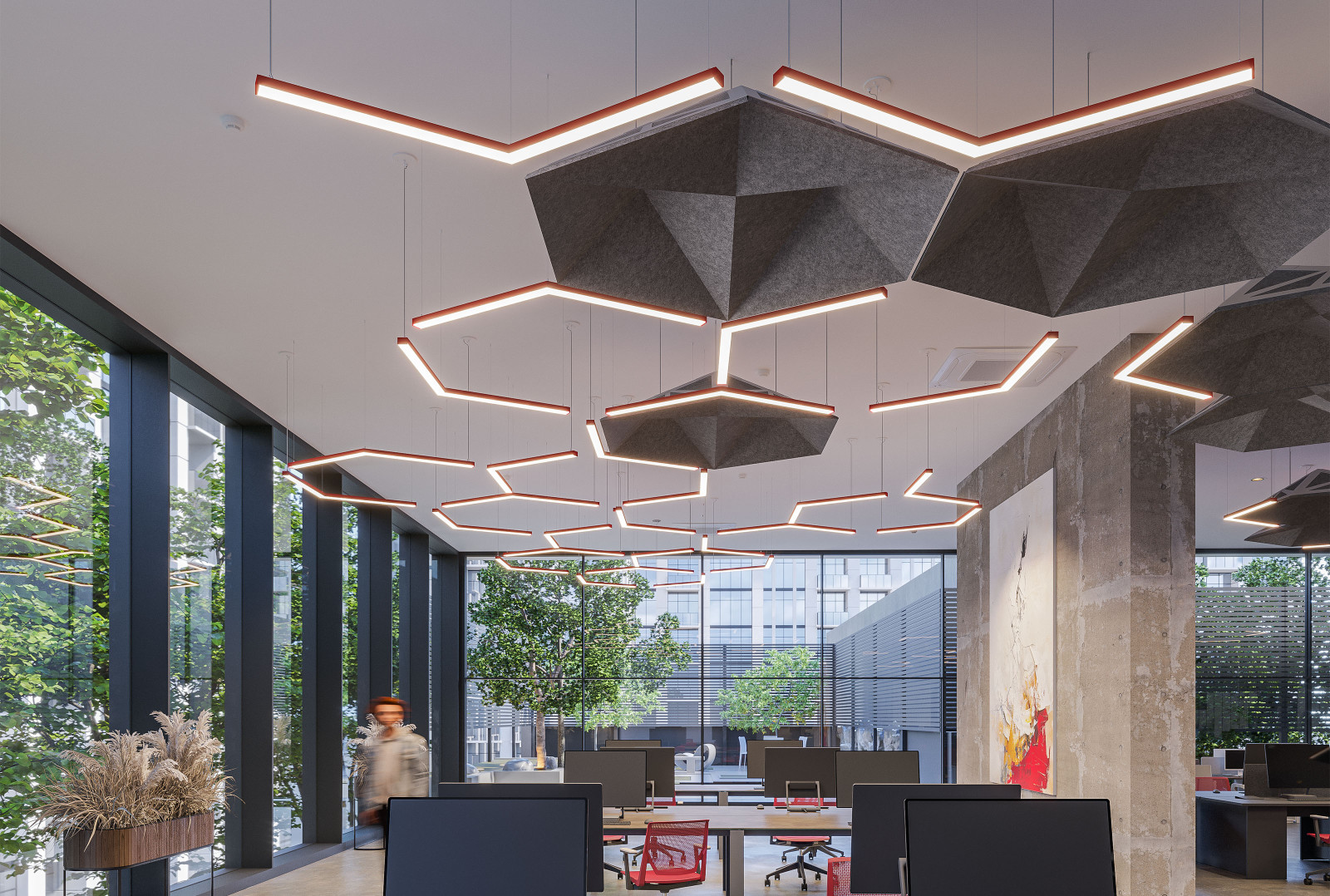 Designed to complement existing Arktura acoustic collections and metal panel systems. LumAngle™ can be installed around the perimeter of select acoustic baffle and cloud systems. LumAngle can be used in tandem with our full range of architectural products but truly shine when used with: (Featured Designs)