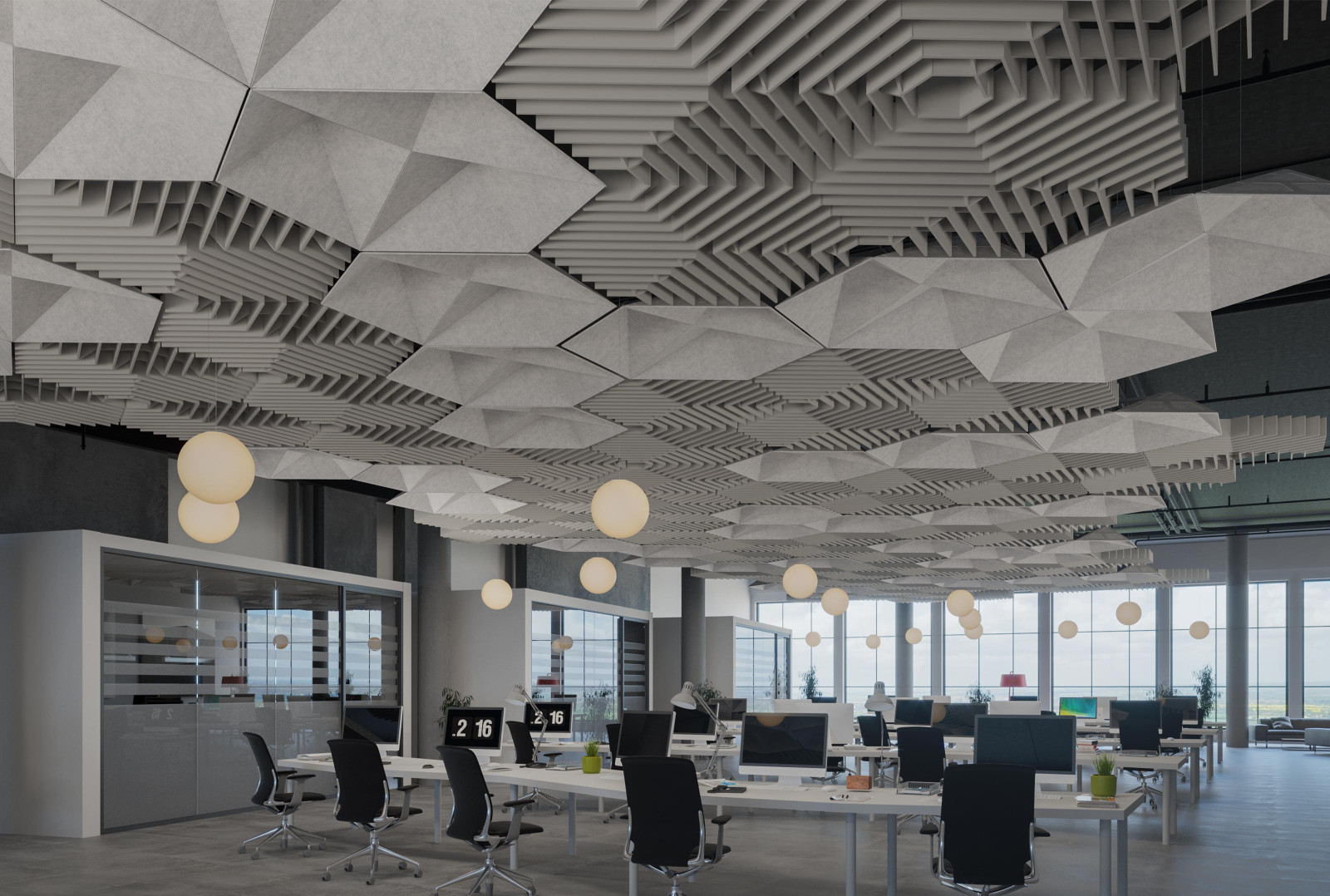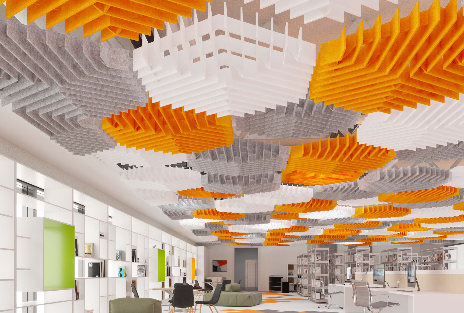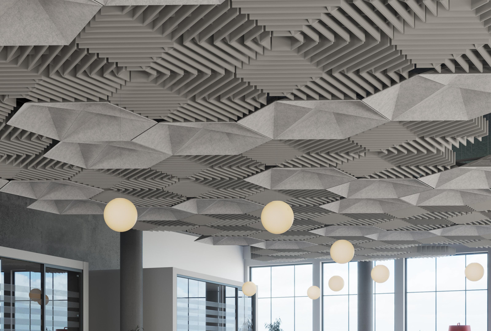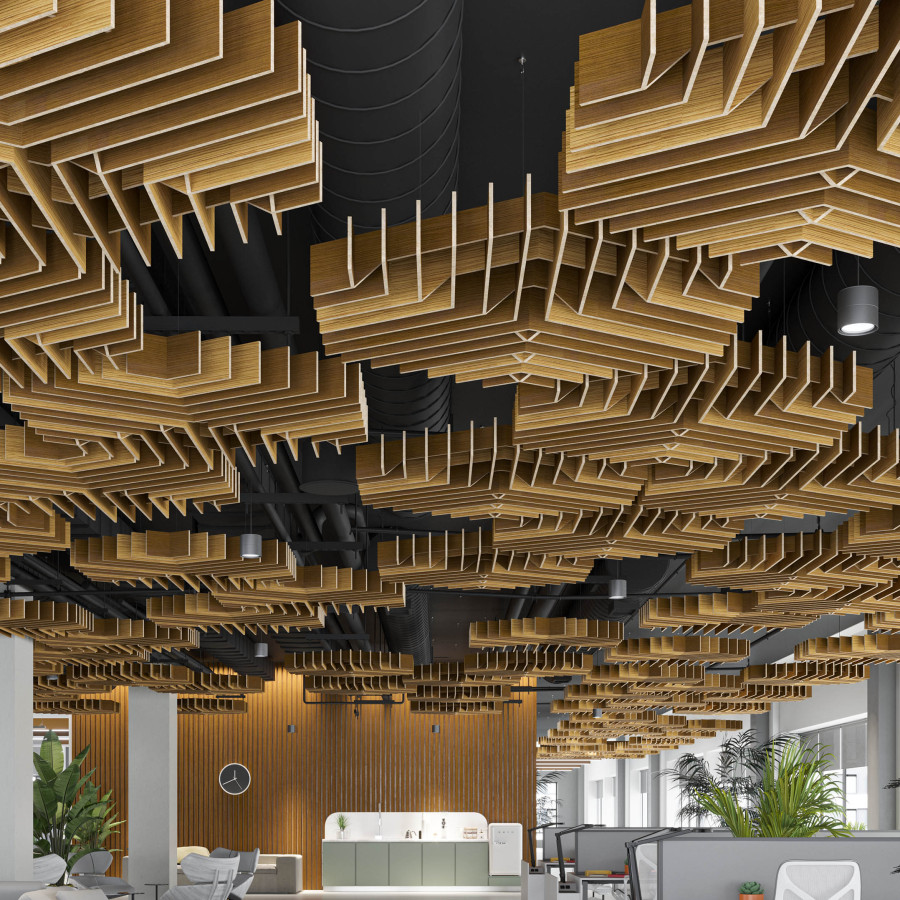 Deca’s acoustic ceiling modules bring faceted, dimensional geometry to your design with its inverted hexagonal shapes. These modules can be combined with other designs for a complex pattern that fills a ceiling or be used individually for a more simple design. Either way, with their Soft Sound® material, Deca will provide you with the acoustic support you need.