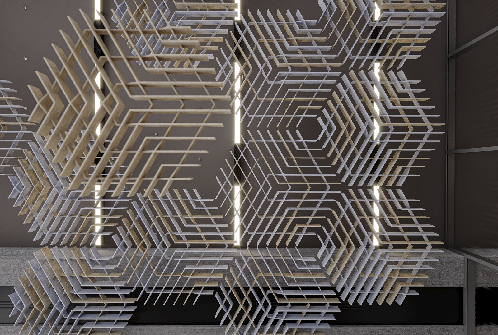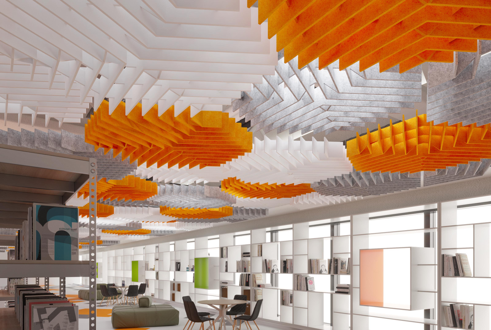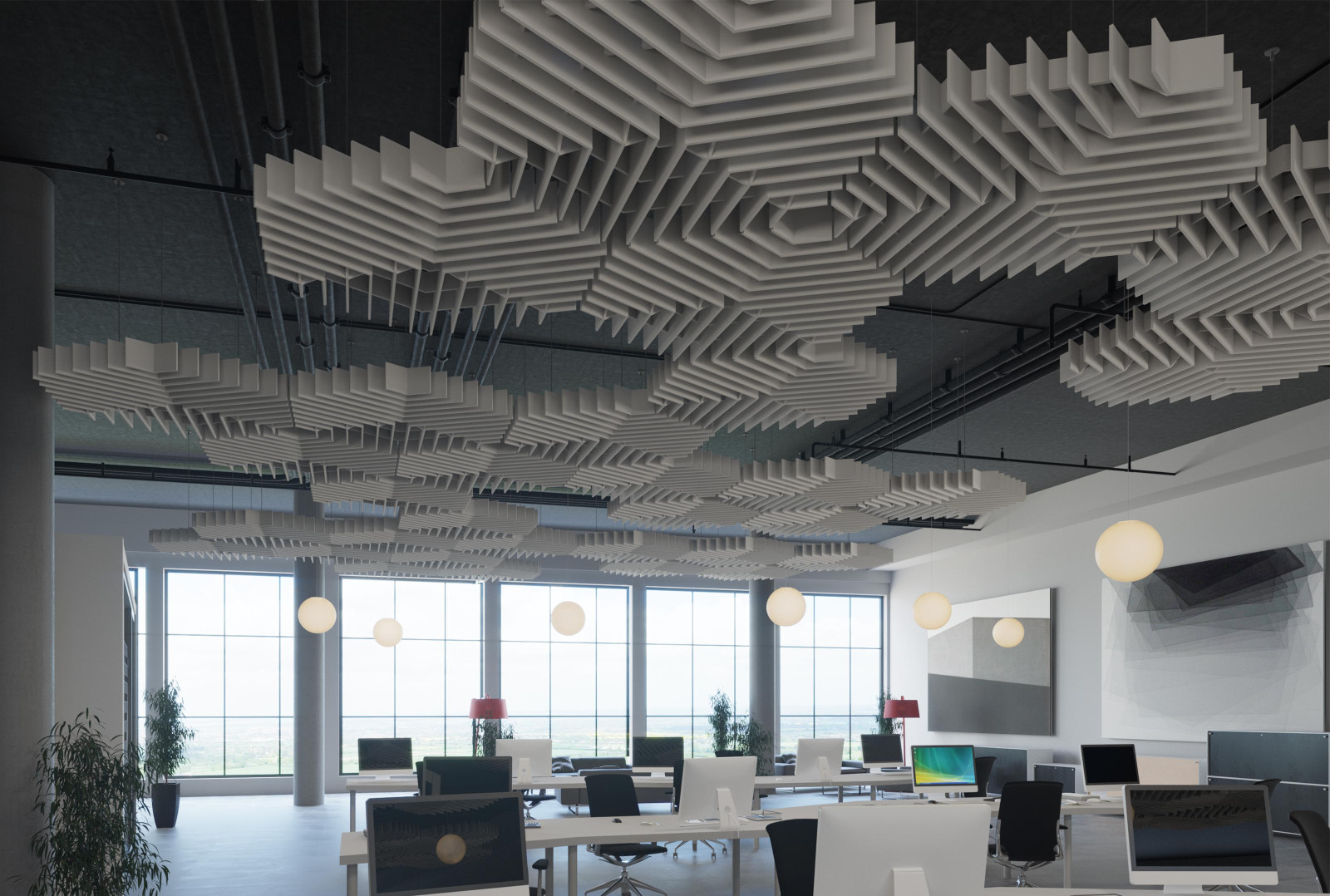Deca’s acoustic ceiling modules bring faceted, dimensional geometry to your design with its inverted hexagonal shapes. These modules can be combined with other designs for a complex pattern that fills a ceiling or be used individually for a more simple design. Either way, with their Soft Sound® material, Deca will provide you with the acoustic support you need.