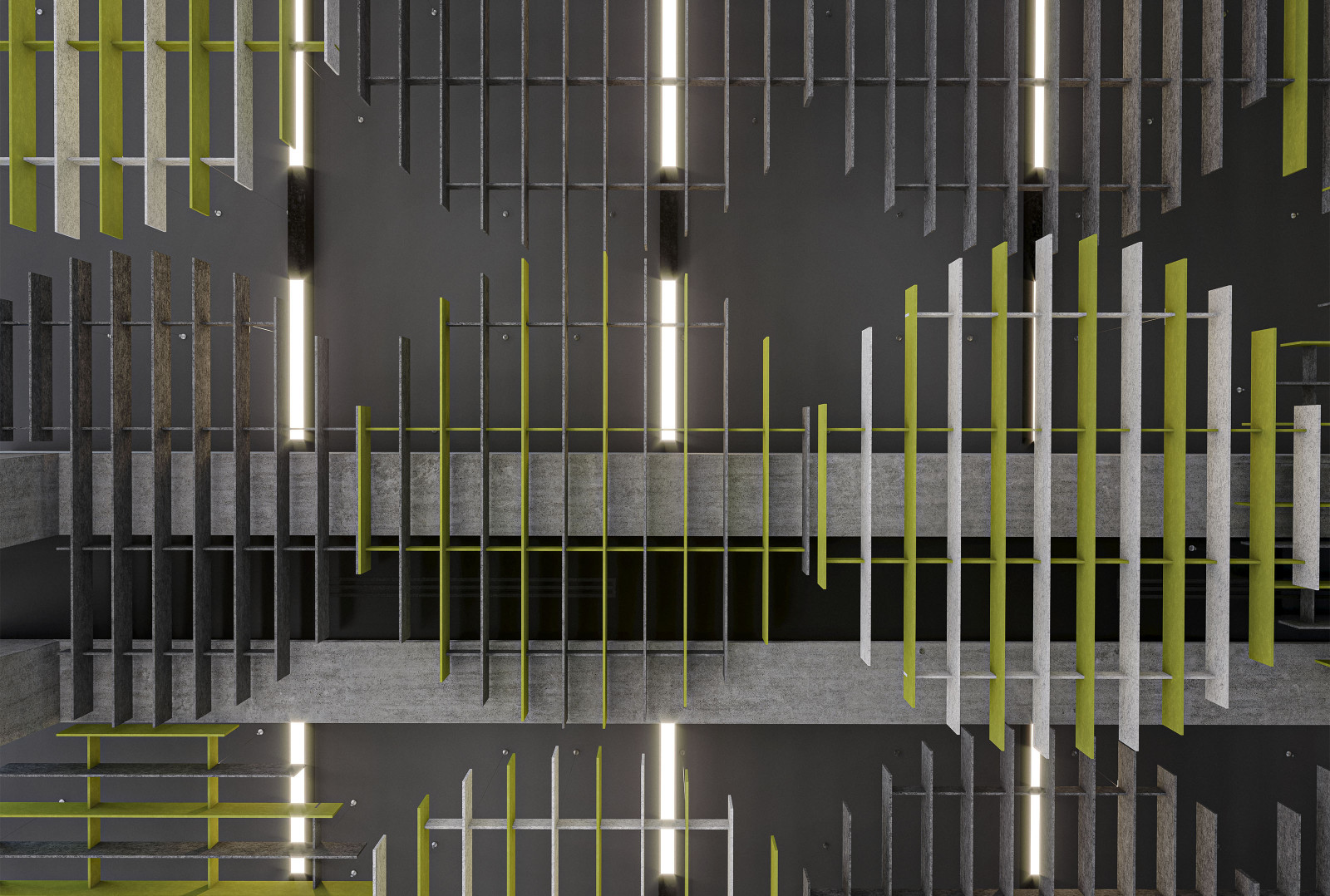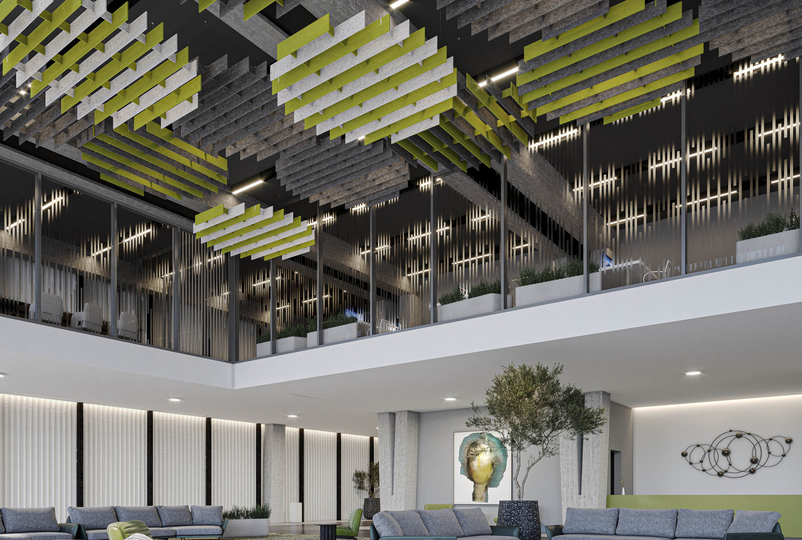 Round’s acoustic ceiling modules create a circular shape using consistently spaced panels at different lengths, for a structural design that’s sure to impress while also providing acoustic support due to the Soft Sound® material. Round’s baffles create a continuous series of rings that can connect together for an intricate design that emcompasses the whole ceiling or can be focused over a singular area for focused acoustic support. And now, for larger jobs, with the addition of SoftGrid® Max options, you can do it all while maximizing value and minimizing the impact on the environment.