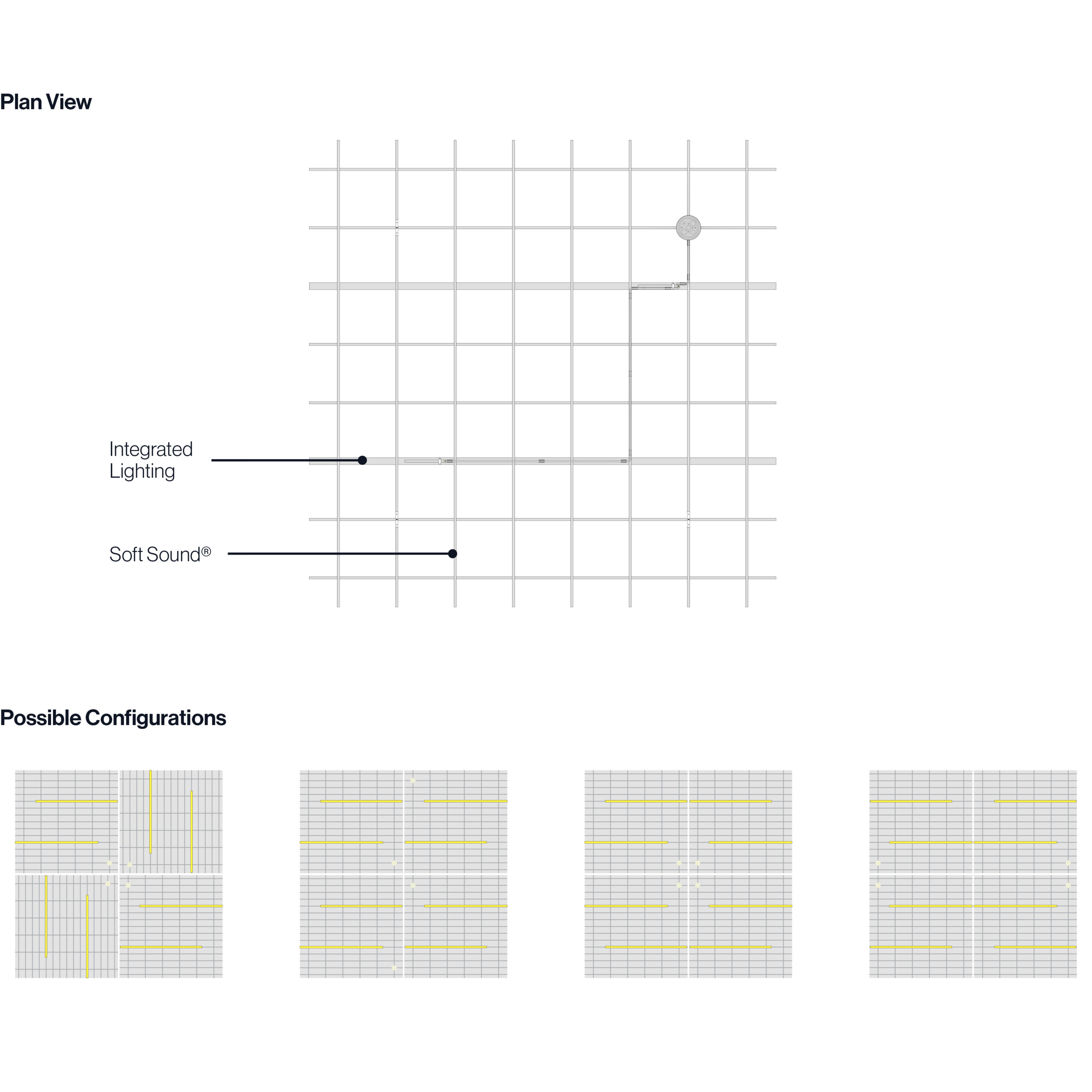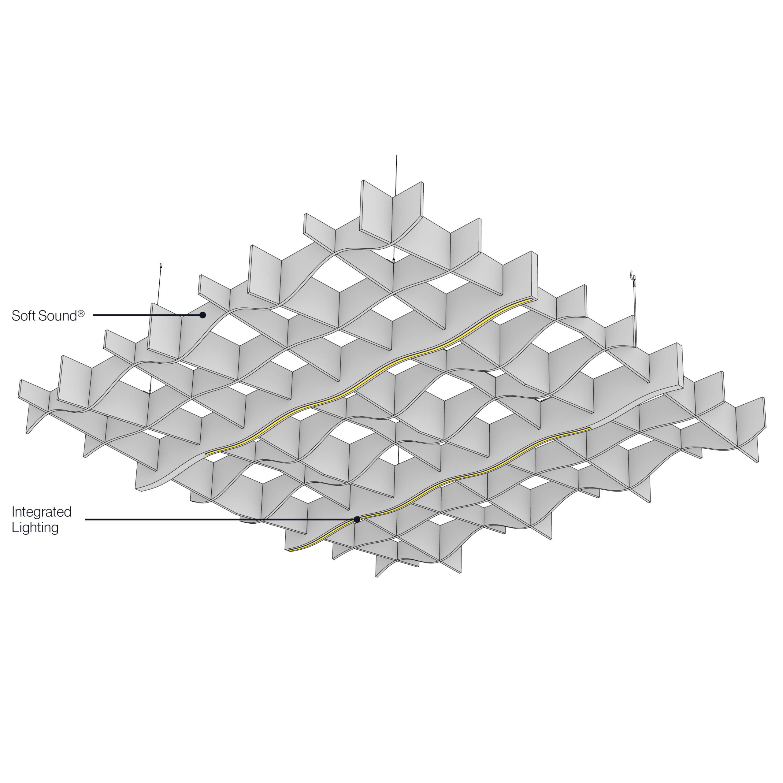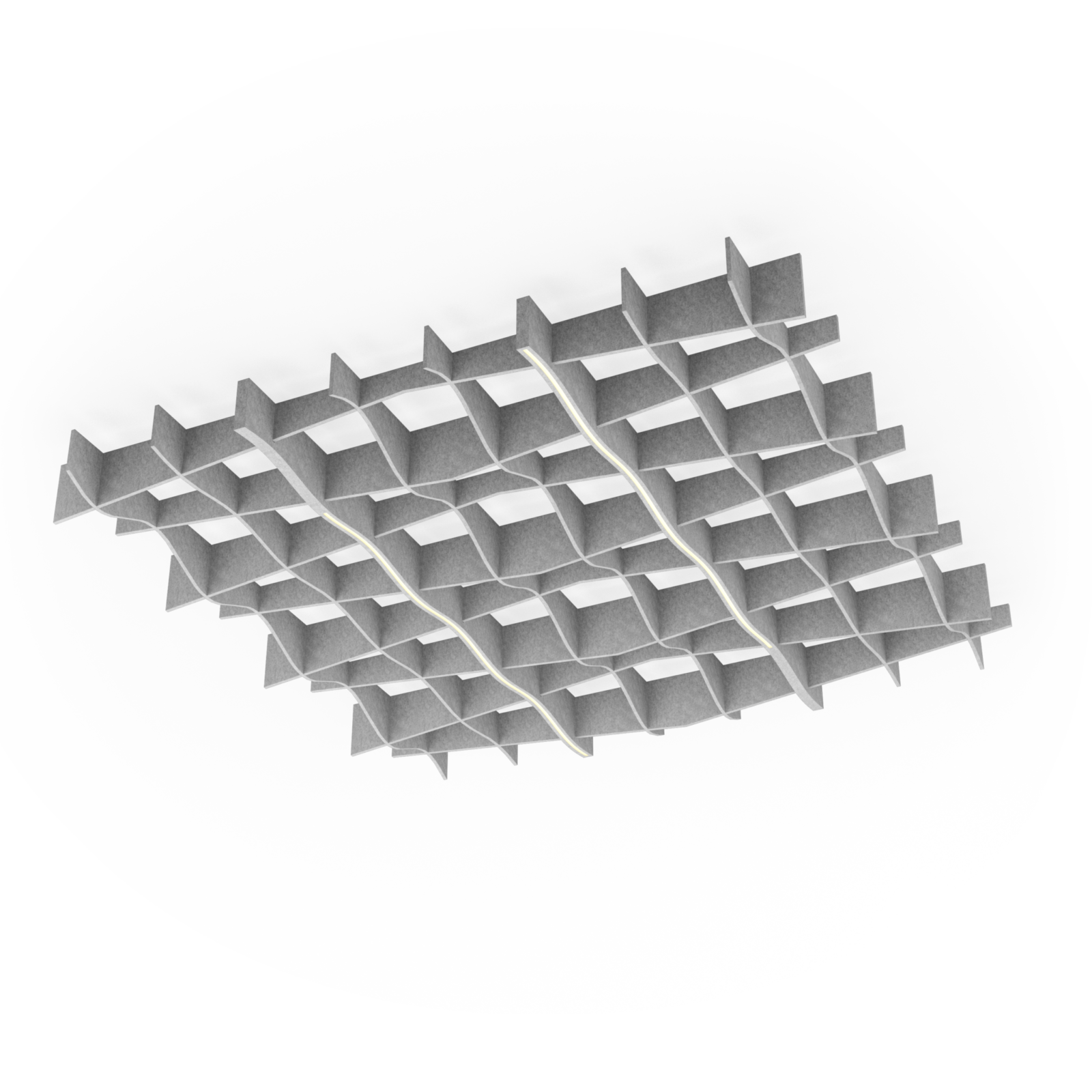 Sine’s acoustic ceiling modules create waves that flow in multiple directions for a truly eye-catching pattern that can either be used individually or connected together in a continuous field. And because it’s made of our Soft Sound® material, you can get acoustic control where you need it most. And now, for larger jobs, with the addition of SoftGrid® Max options, you can do it all while maximizing value and minimizing the impact on the environment. Optional accessories include integrated lighting, bringing acoustics and illumination together in one package.