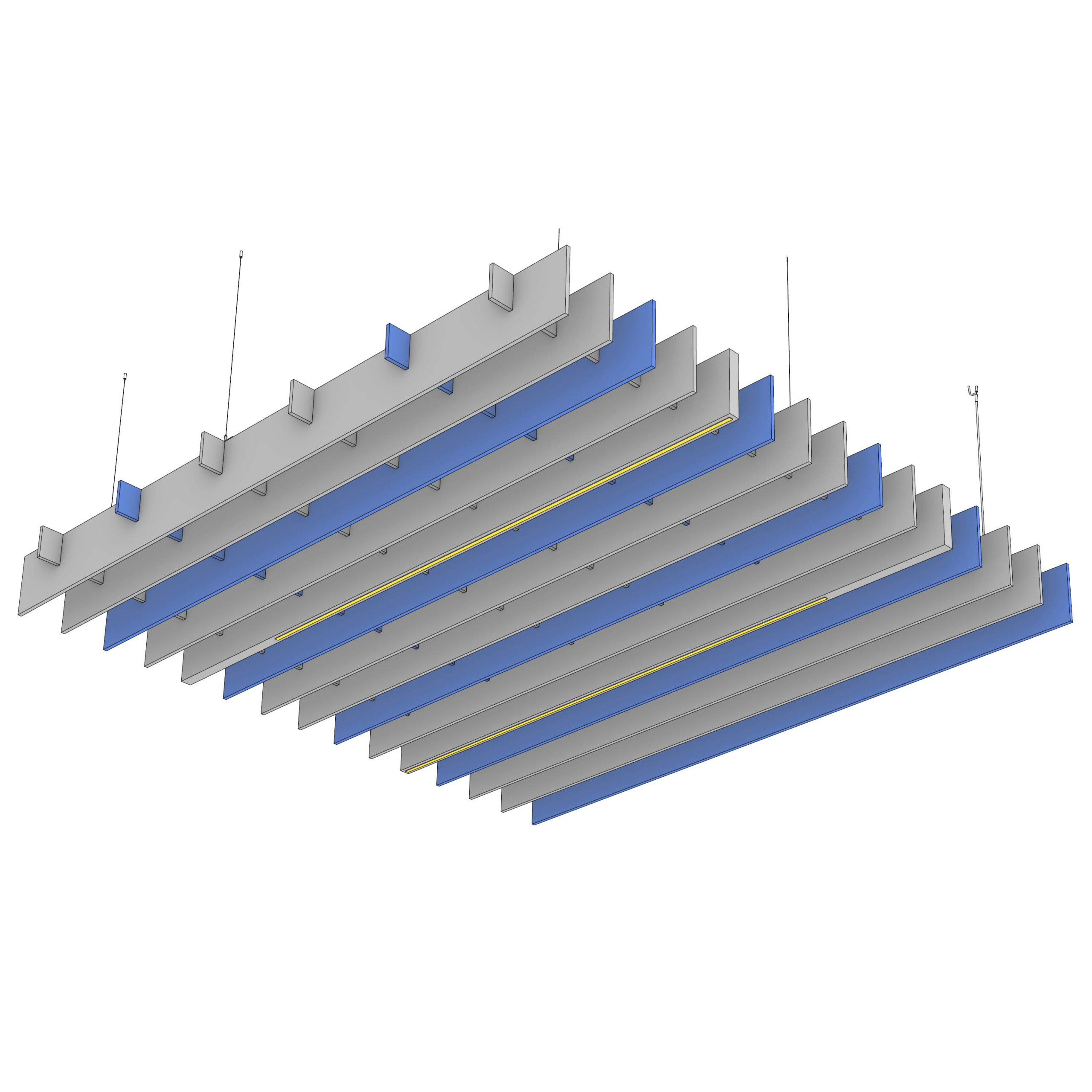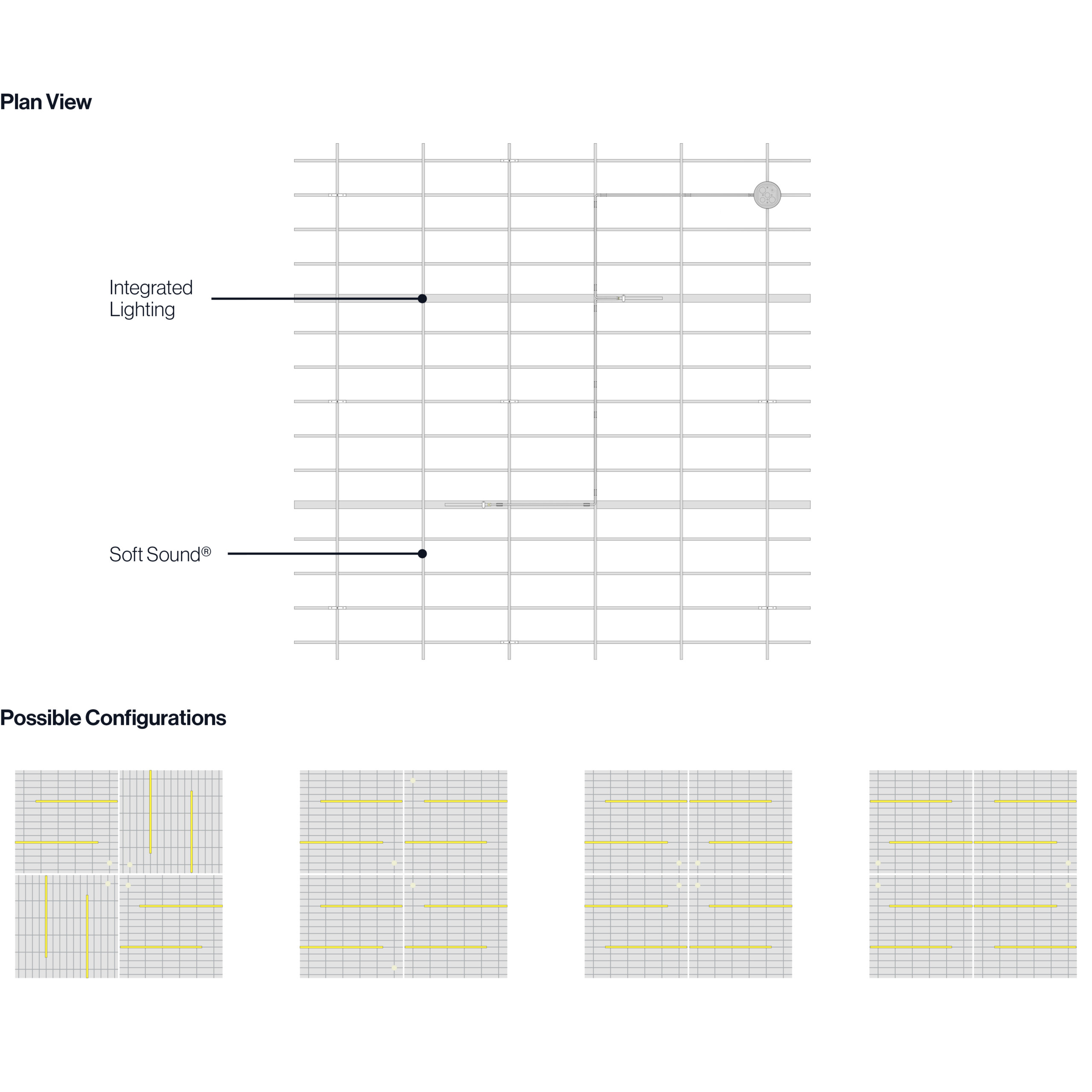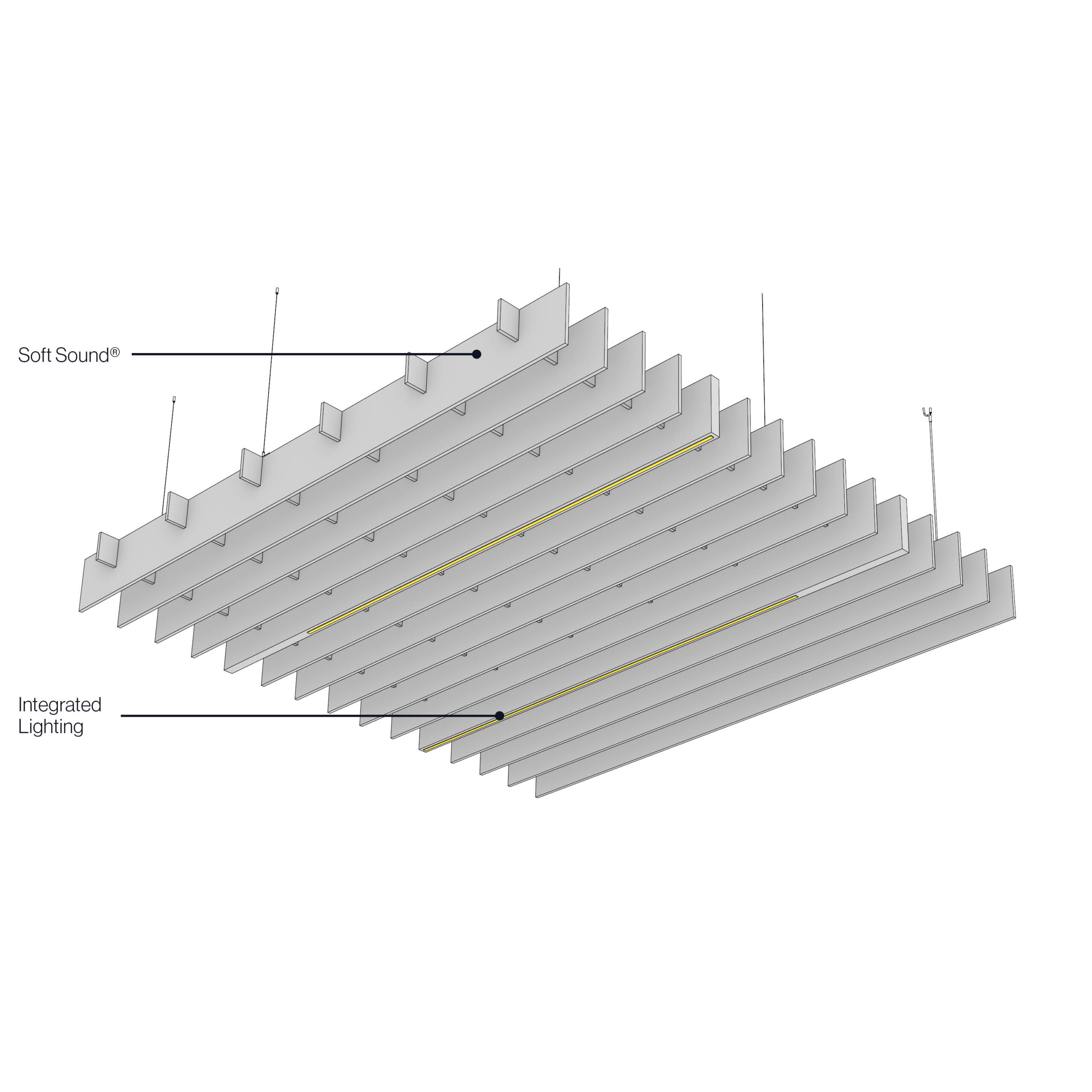 Square’s acoustic ceiling modules create a linear design on your ceiling with perfectly spaced perpendicular panels. You can follow a long hallway by connecting the modules together for a seamless design, or you can use them in a targeted way by placing them in a specific location. No matter how you use them, you’ll get acoustic support thanks to the Soft Sound® material. And now, for larger jobs, with the addition of SoftGrid® Max options, you can do it all while maximizing value and minimizing the impact on the environment. Optional accessories include integrated lighting, bringing acoustics and illumination together in one package.