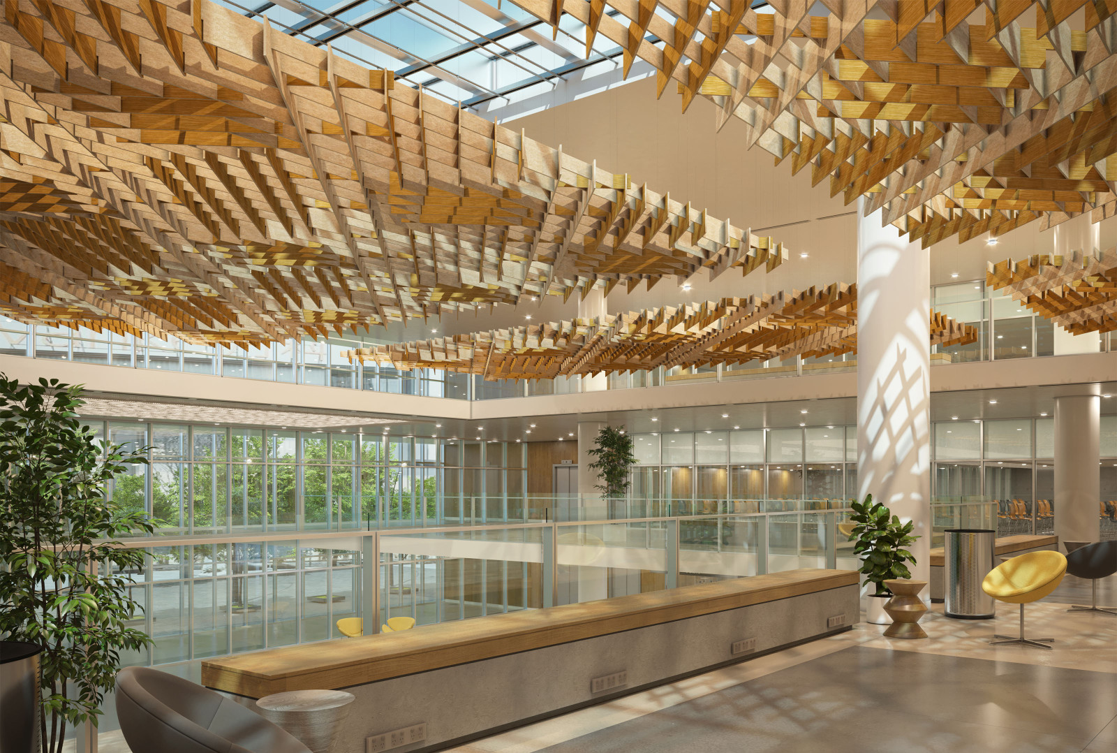 Tilt provides a series of perpendicular acoustic fins that make up this motion-filled acoustic cloud system. Multi-directional slats resembling parquet flooring, made of our Soft Sound® acoustic material, enhance overall aesthetics and functionality. Array multiple modules together, creating a vast array of alluring coverage. Specify SoftGrid® Tilt in a variety of Soft Sound® finishes, including premium wood textures and Duo Tone finishes.