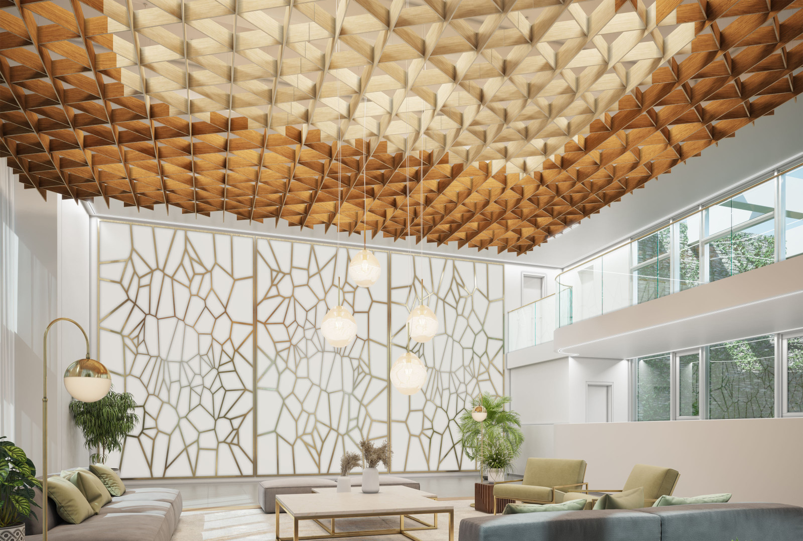 Crisscrossing linear baffles made of our Soft Sound® acoustic material make up the lattice-like structure of SoftGrid® Trella. Connect multiple Trella modules to create a vast trellis across your ceiling, blanketing a room in auditory serenity. To further customize your acoustic experience, these cloud systems are available in a wide variety of Soft Sound® finishes, including premium wood textures, and Duo Tone finish, unlocking new design possibilities.