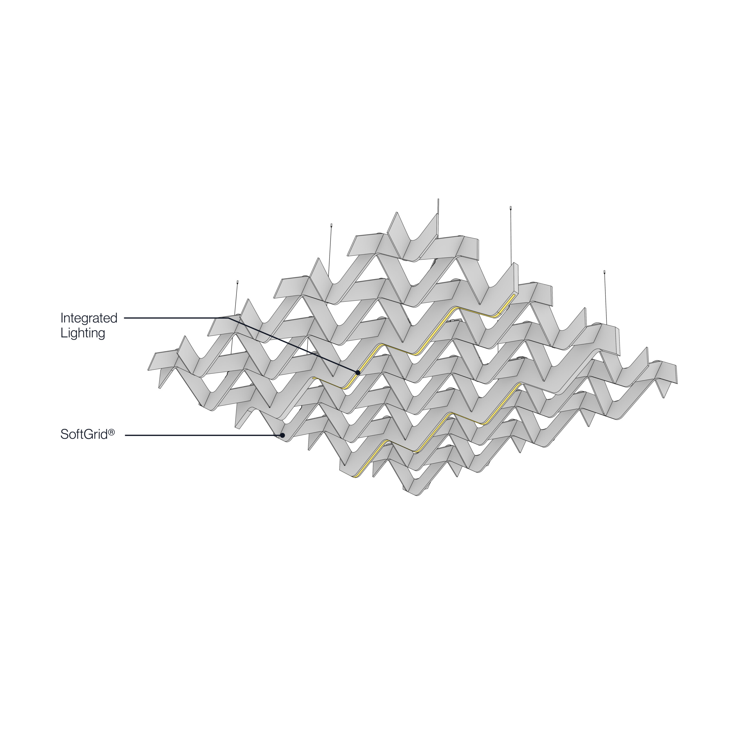 SoftGrid®'s Soft Sound® material reduces the impact of noise from everyday annoyances like ringing, typing, and chatter resulting in a more pleasant and productive environment. SoftGrid®'s material works in concert with the design to help reduce and control reverberations leaving a lasting impression at scales ranging from assembly halls to conference rooms.