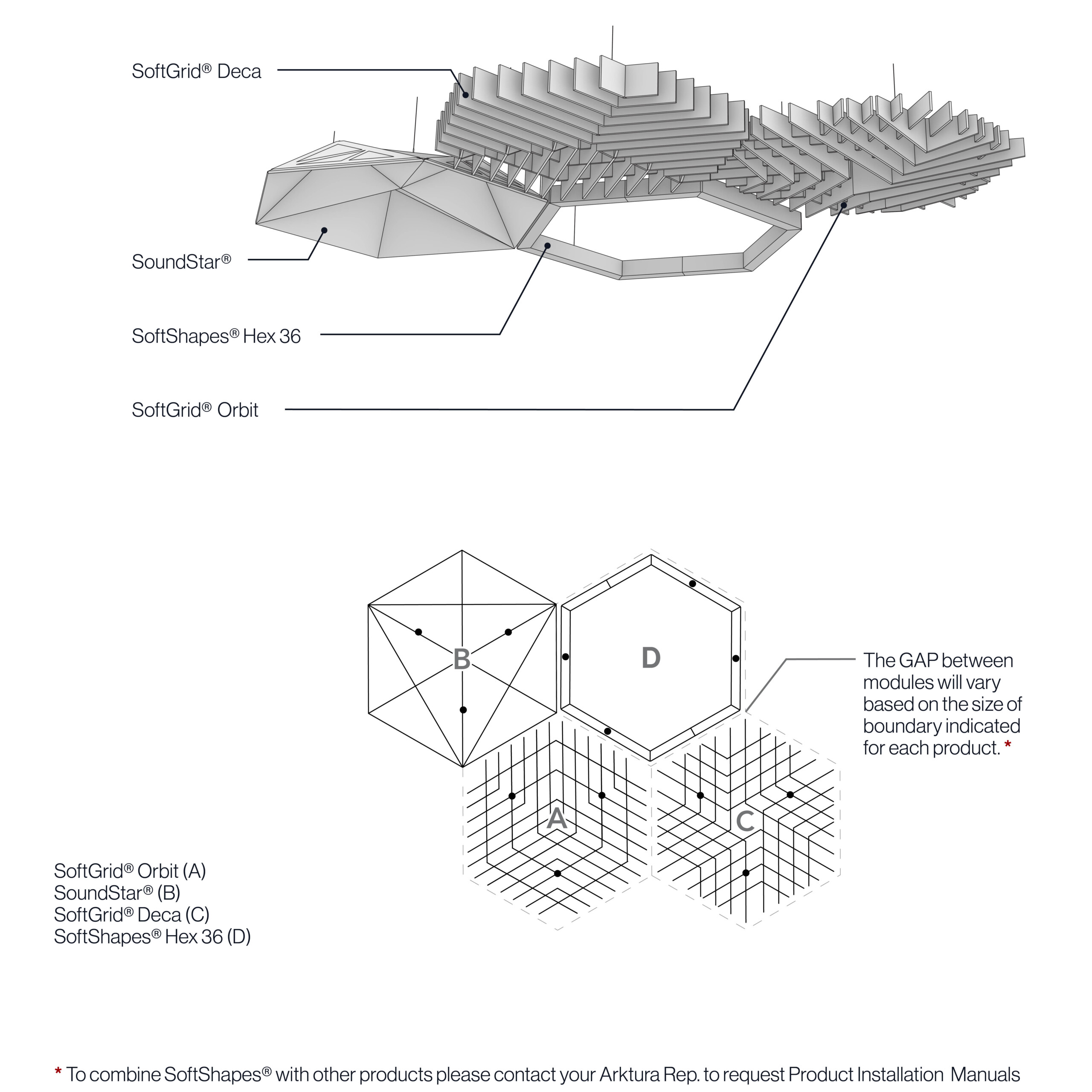 Select SoftShapes® Hex modules are compatible with Arktura‘s modular hexagonal acoustic cloud systems. Use together to bring transformative design variation to any space.