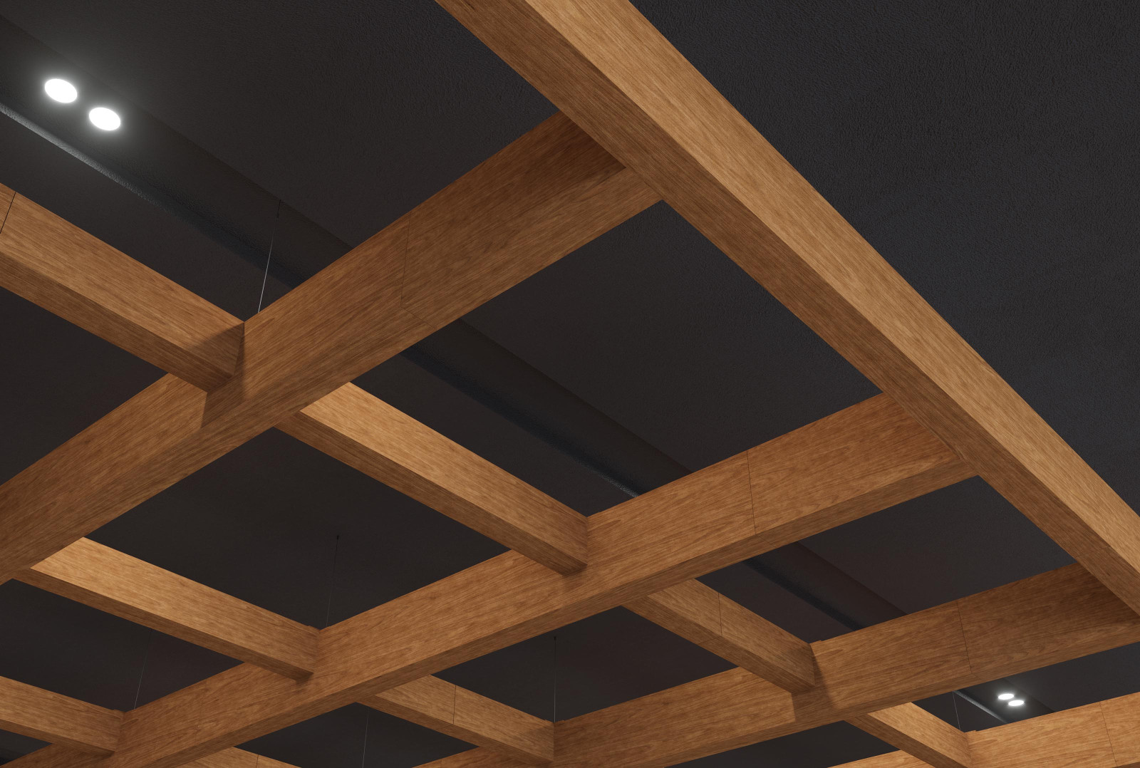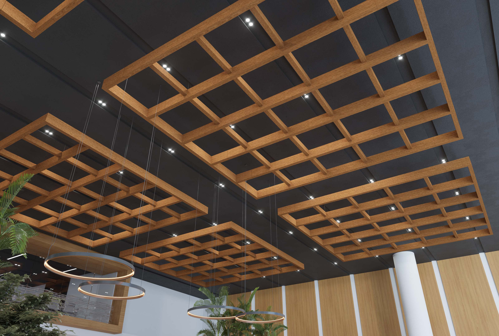 SoftSpan® in Soft Sound® Wood Texture brings the aesthetics of a timber trellis into your space without the weight while also adding acoustic performance.