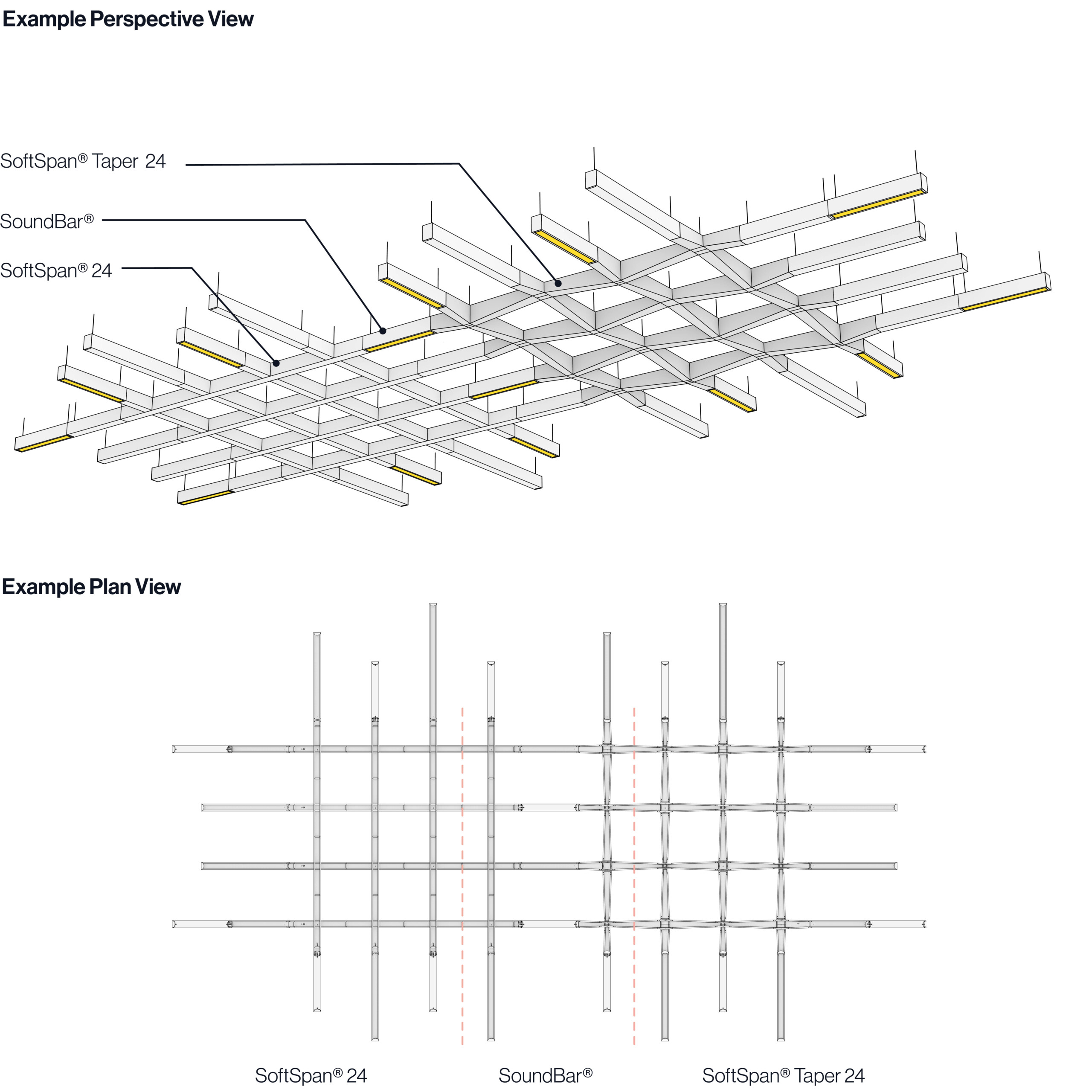 SoftSpan® Taper 24 offers connectivity with SoundBar® acoustic baffles, to create a multitude of unique layouts with visual continuity across as space, incorporating linear lighting as desired.