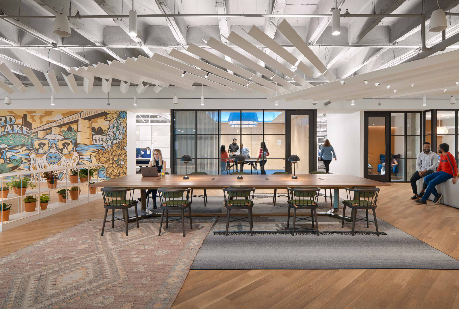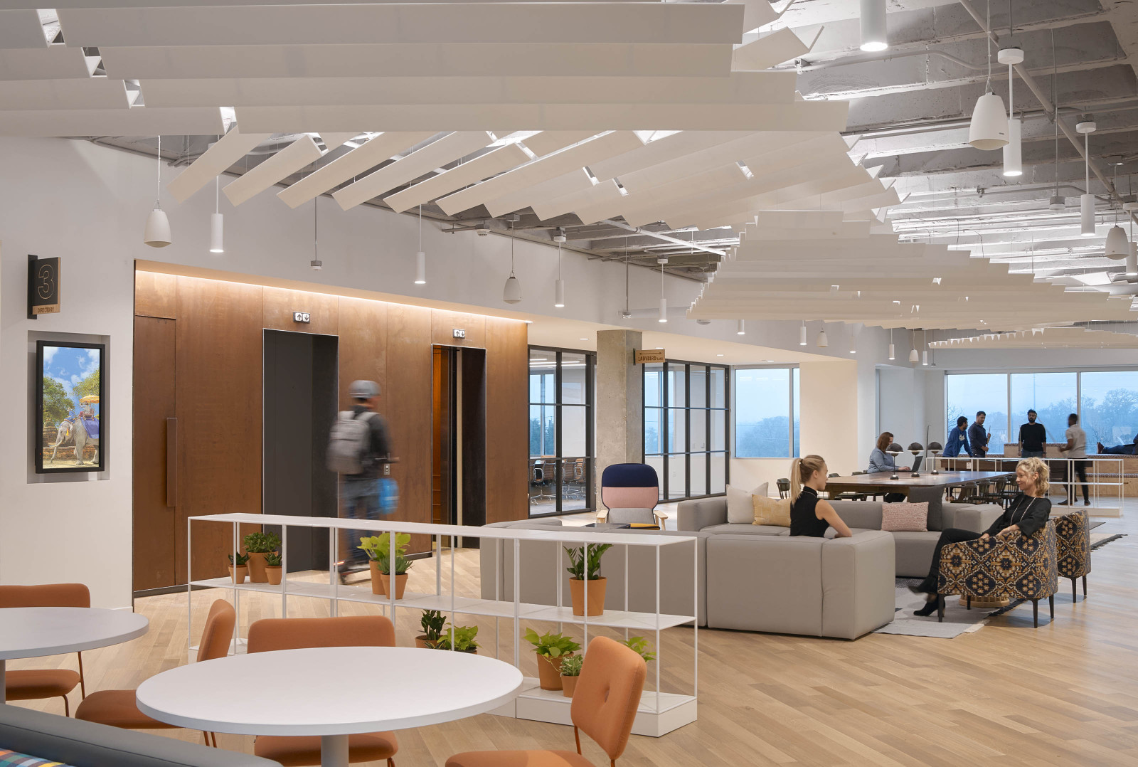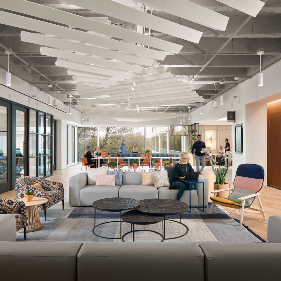 SoundAngle® ceiling system’s V-shaped baffles offer a scalable way to add dimensionality and decrease acoustical reverberations across spaces. Its angled face design and construction from our Soft Sound® acoustical material combine to dramatically reduce noise from all directions. SoundAngle® can be configured in numerous ways to adapt to existing structural elements and fit your design vision. Choose from two depths and a range of lengths, all available in a variety of colors and finishes, including wood-grain textures.