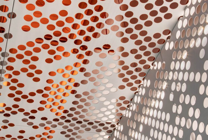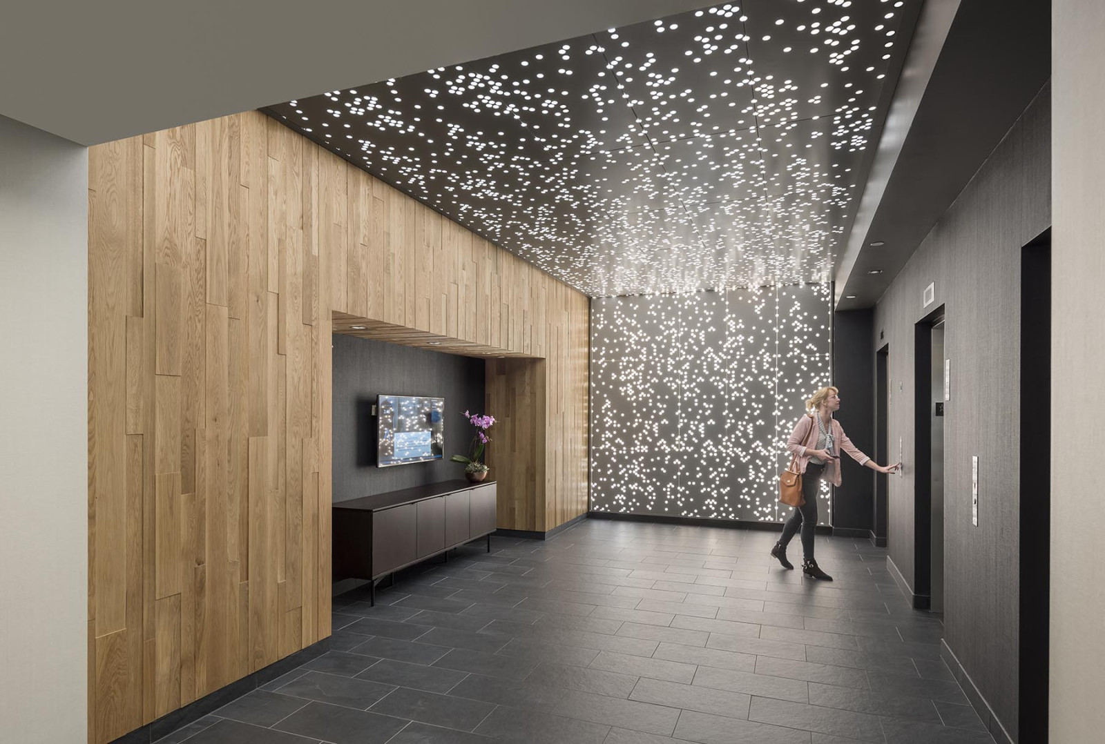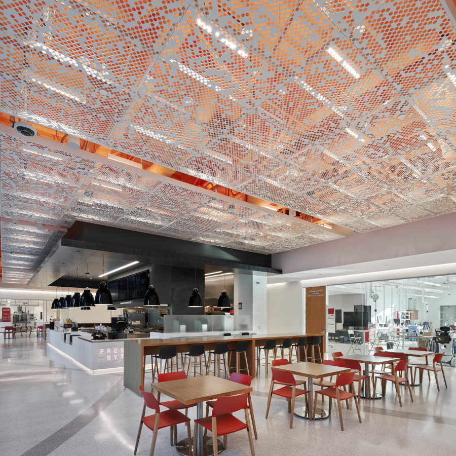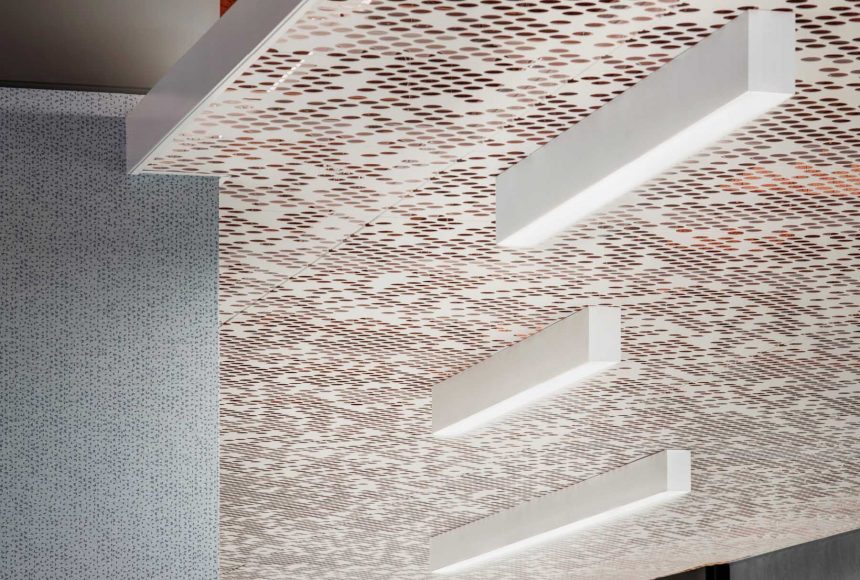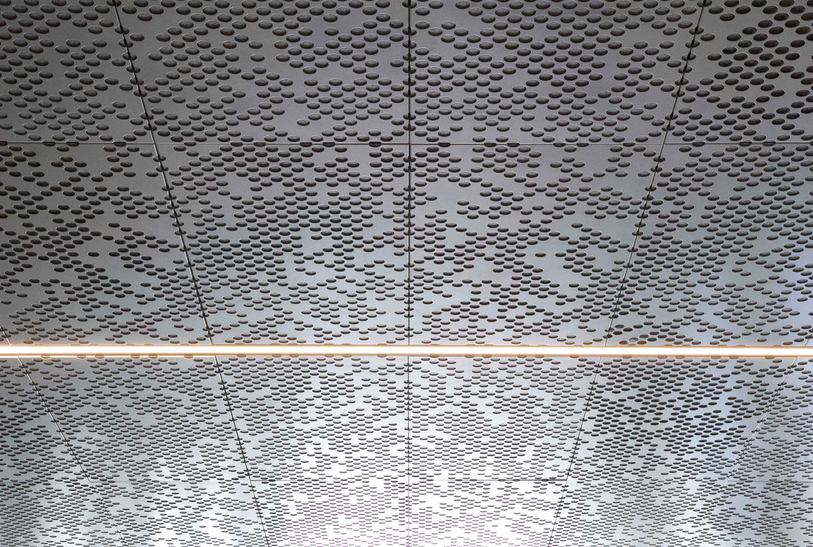 With Cluster, we’ve transformed perforated torsion spring panels into an elegant ceiling-scape. By staggering the location of the holes, we’ve upgraded a standard grid into an eye-catching design that will get viewers talking. Choose from two levels of perforation density: Cluster Dense and Cluster Sparse. Cluster also works with both our optional integrated lighting and Soft Sound® acoustic backer to help you get the right aesthetic — and sound — for your design.