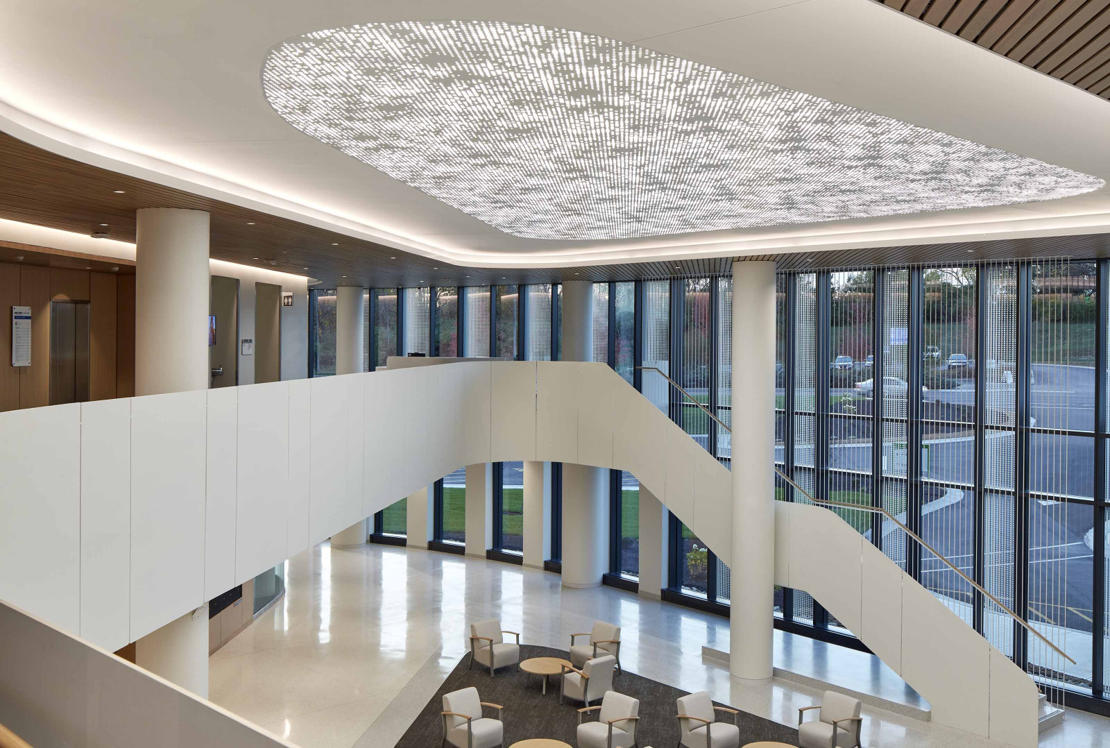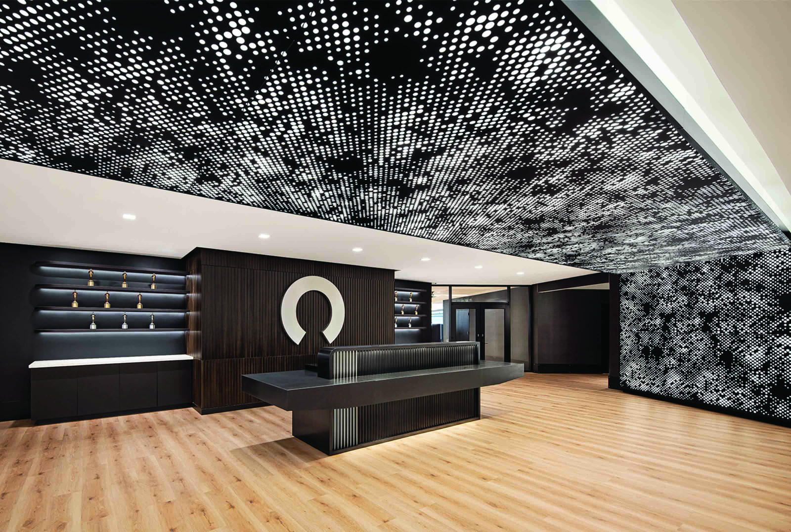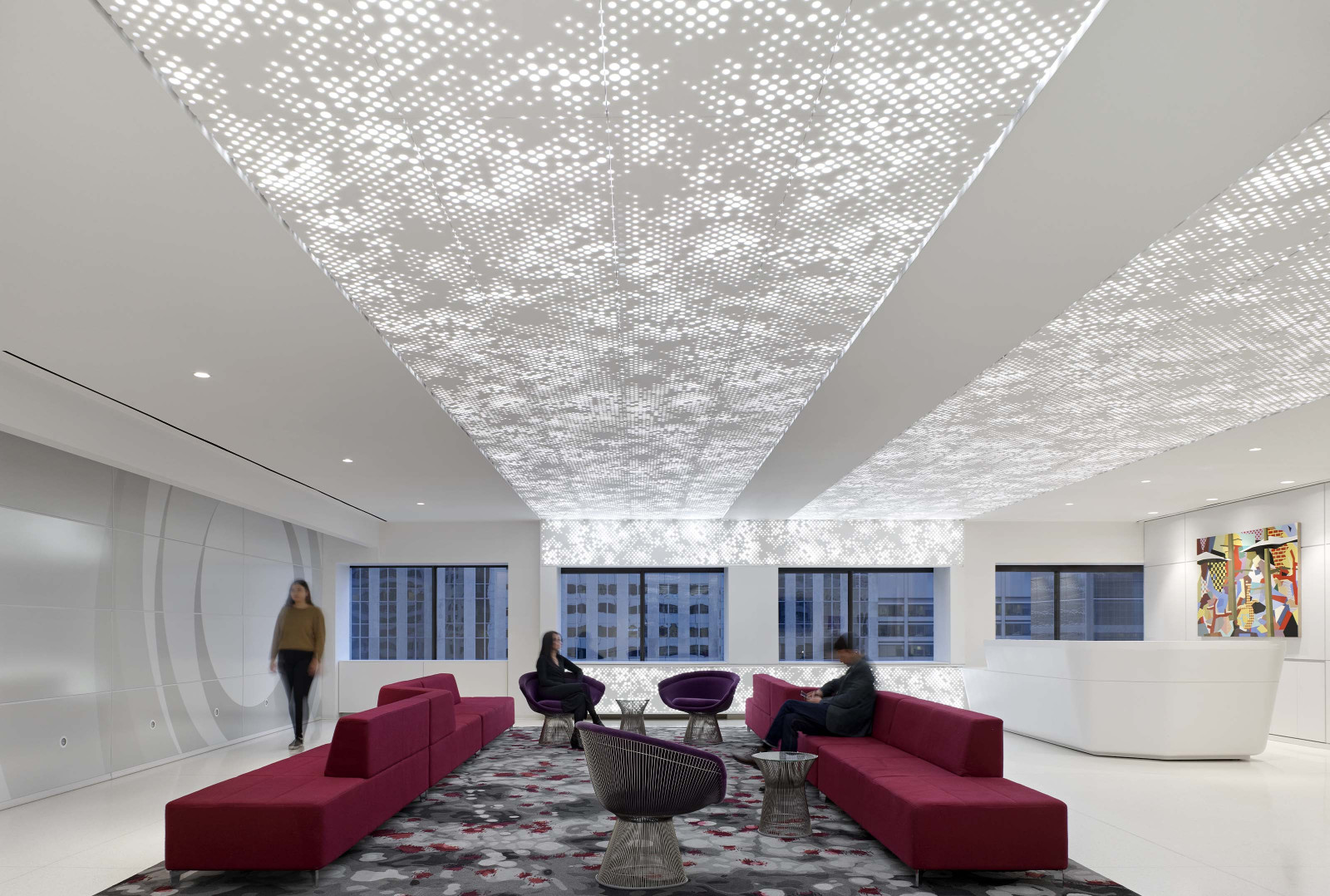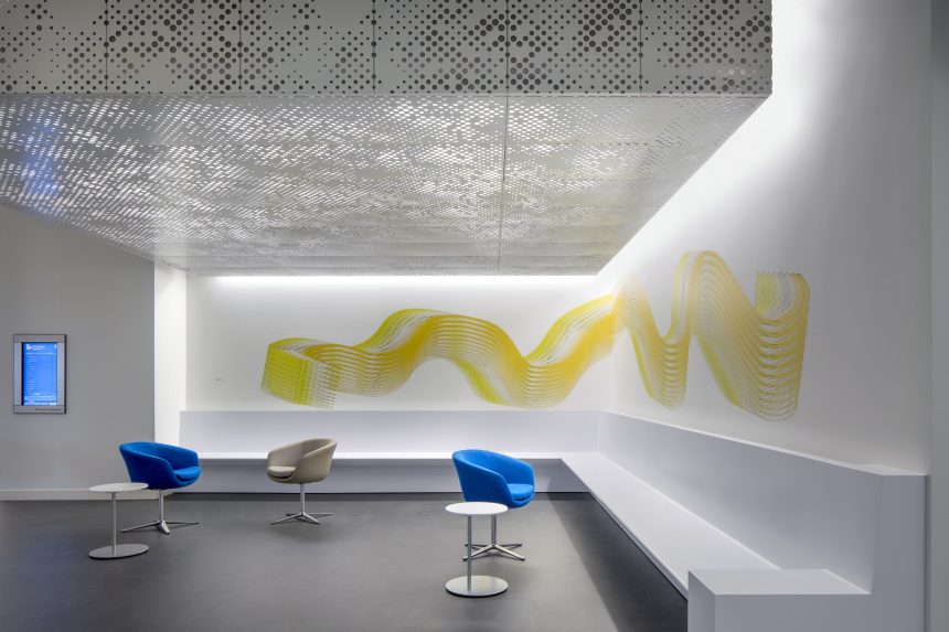Cumula powder-coated aluminum torsion spring panels take inspiration from a beautiful spring day, giving your design the ephemeral feeling of a cloudy sky. The pattern continues seamlessly from panel to panel, and with the addition of our Soft Sound® backer, you can also reduce the amount of ambient noise. Or try our integrated lighting backer if you want a design that shines.