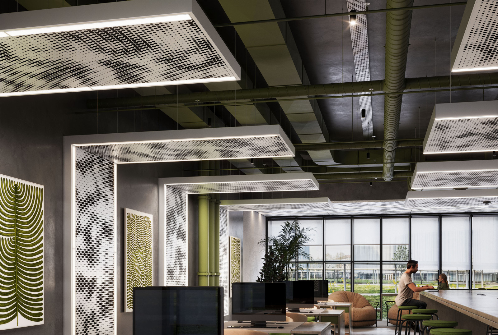 Incorporate available backers of frosted acrylic, for diffused lighting and other visual effects, or Arktura’s Soft Sound® acoustical material, to reduce the impact of noise across spaces.