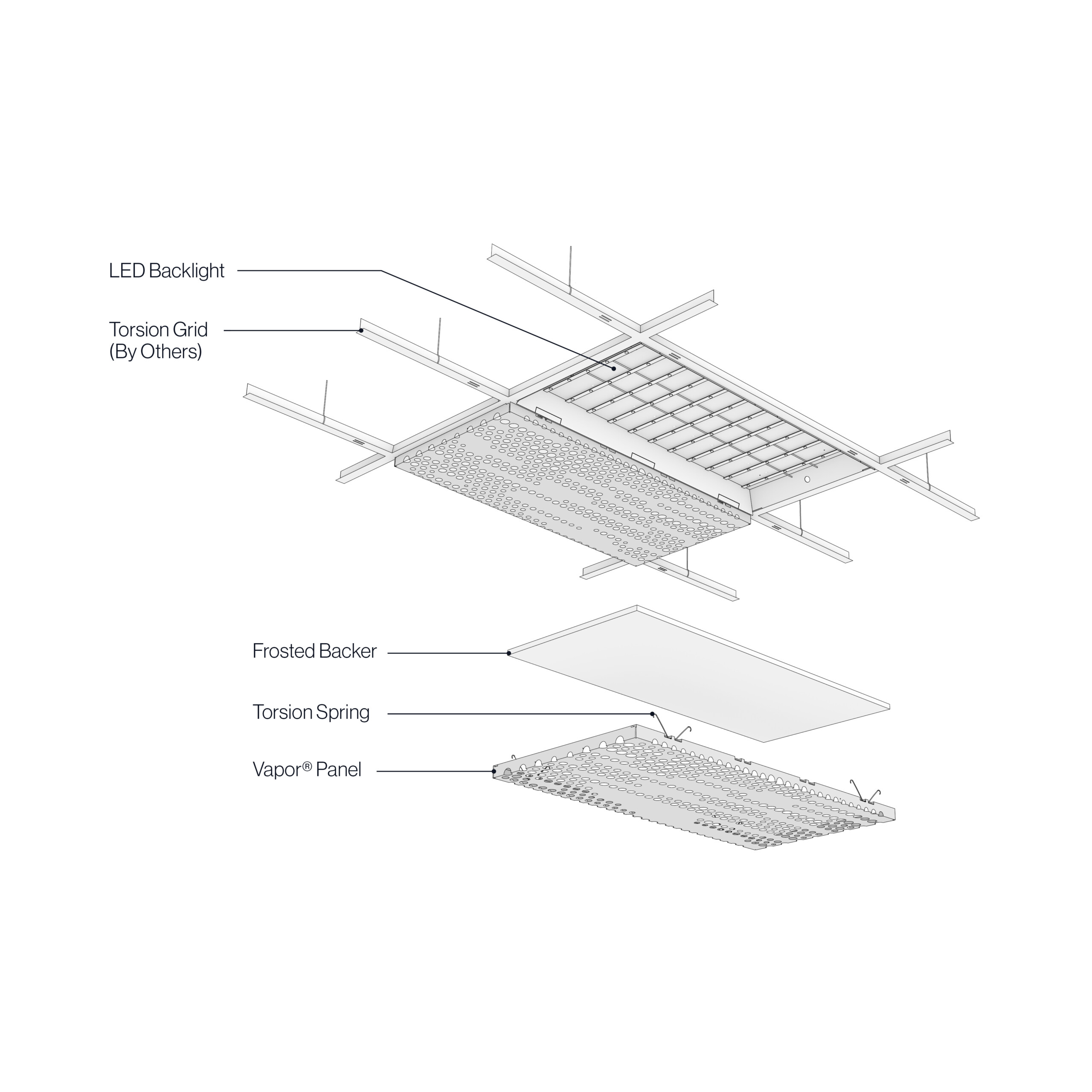 Vapor® panels offer easy install, using quick torsion spring attachment across standard ceiling grid systems or simple wall attachment using our Vertika™ channel system.
