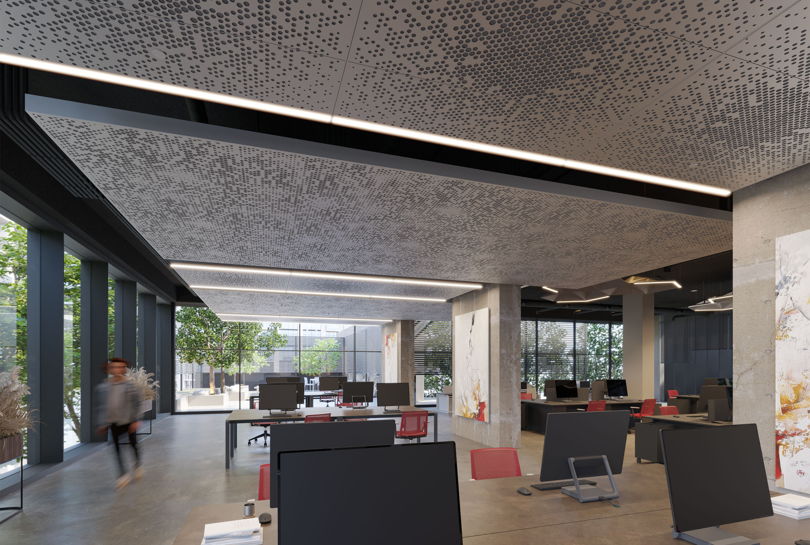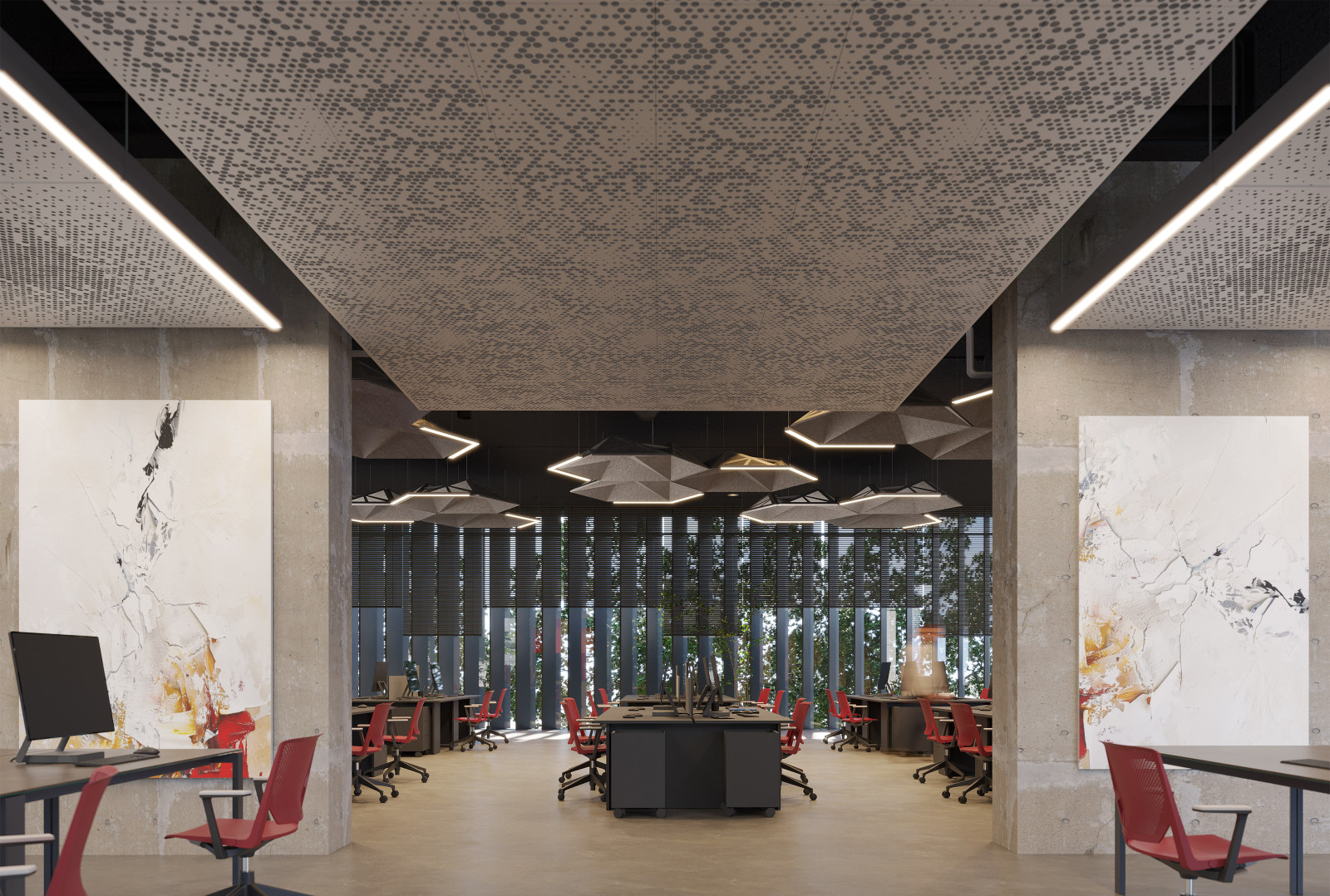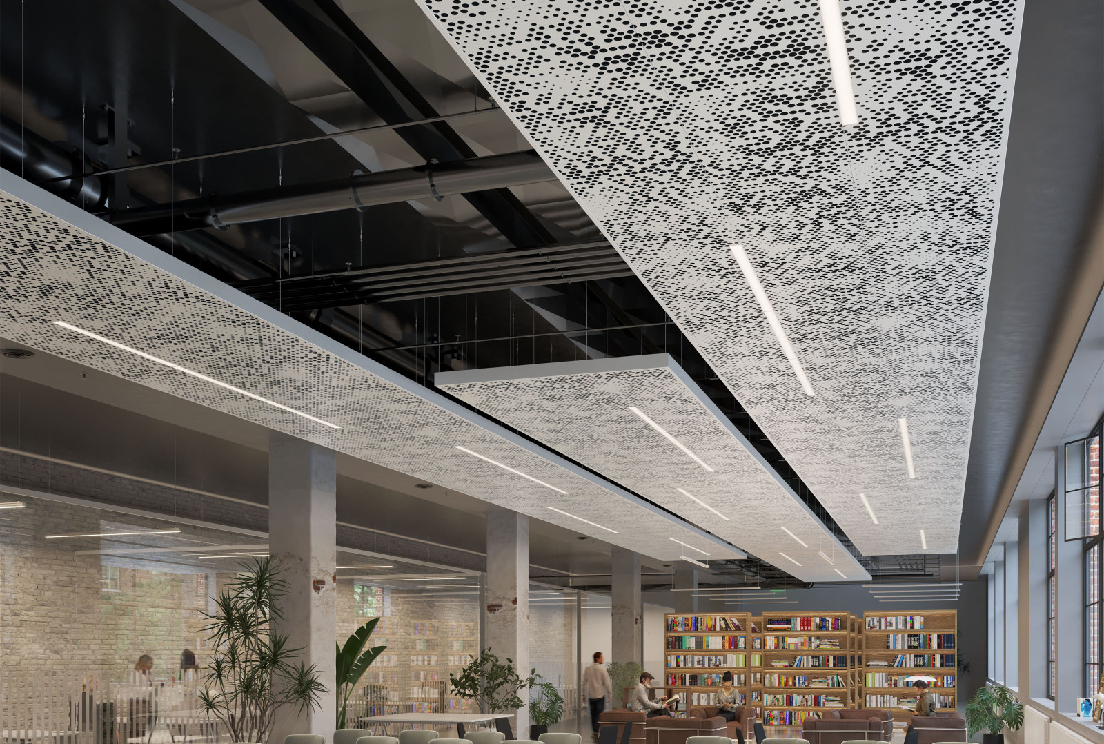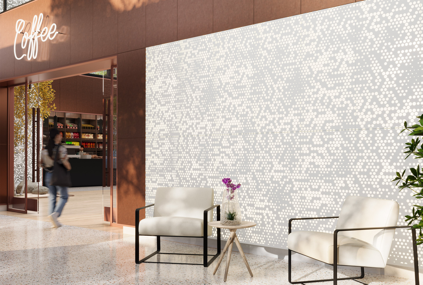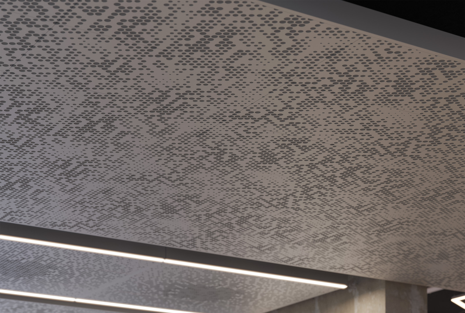 Vapor ® Radia features a unique pattern that adds scattered dimension to your space. A series of perforated circles radiate throughout the panel, creating a burst of impactful design. This distinctive pattern creates a mesmerizing interplay of light and shadow instantly capturing the viewer’s attention. Choose from various powder coat finishes and optional lighting or Soft Sound® acoustic backers.