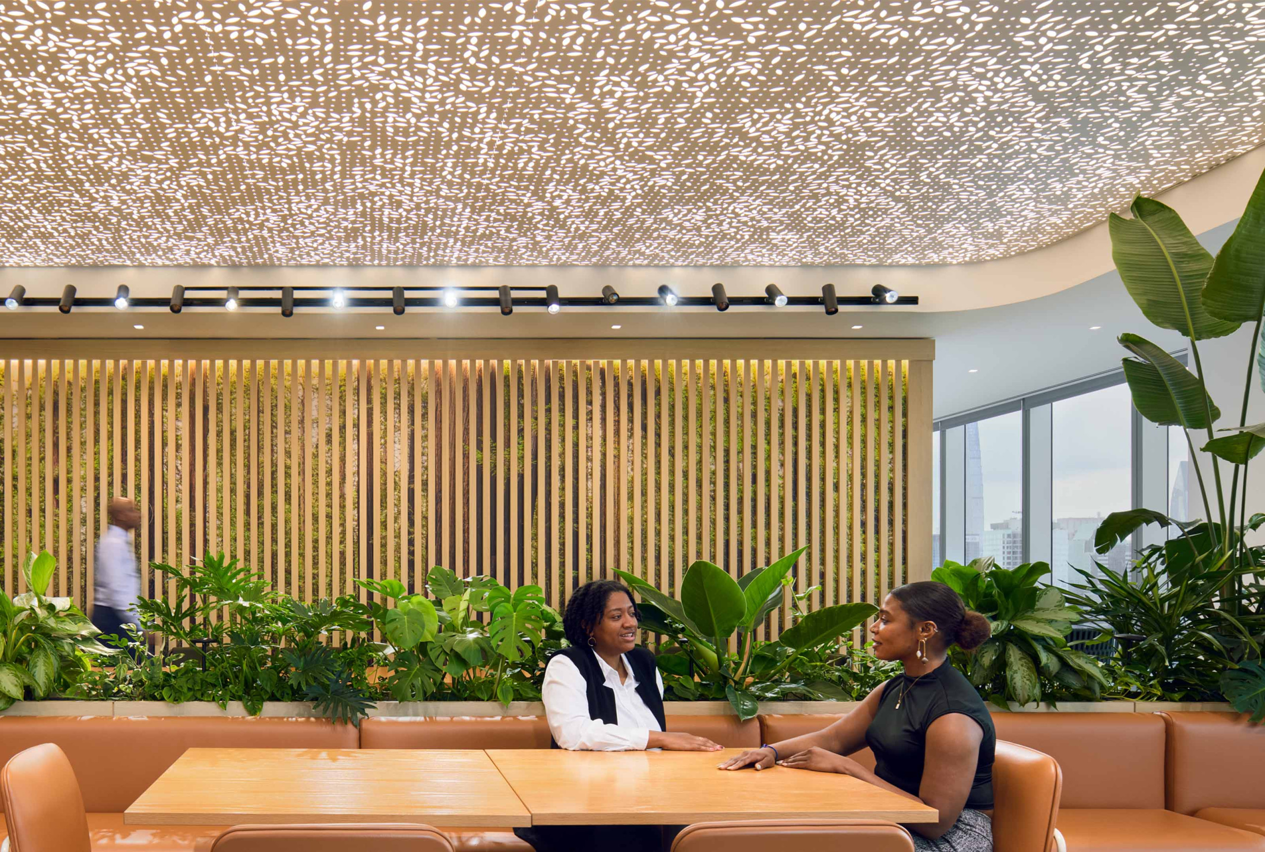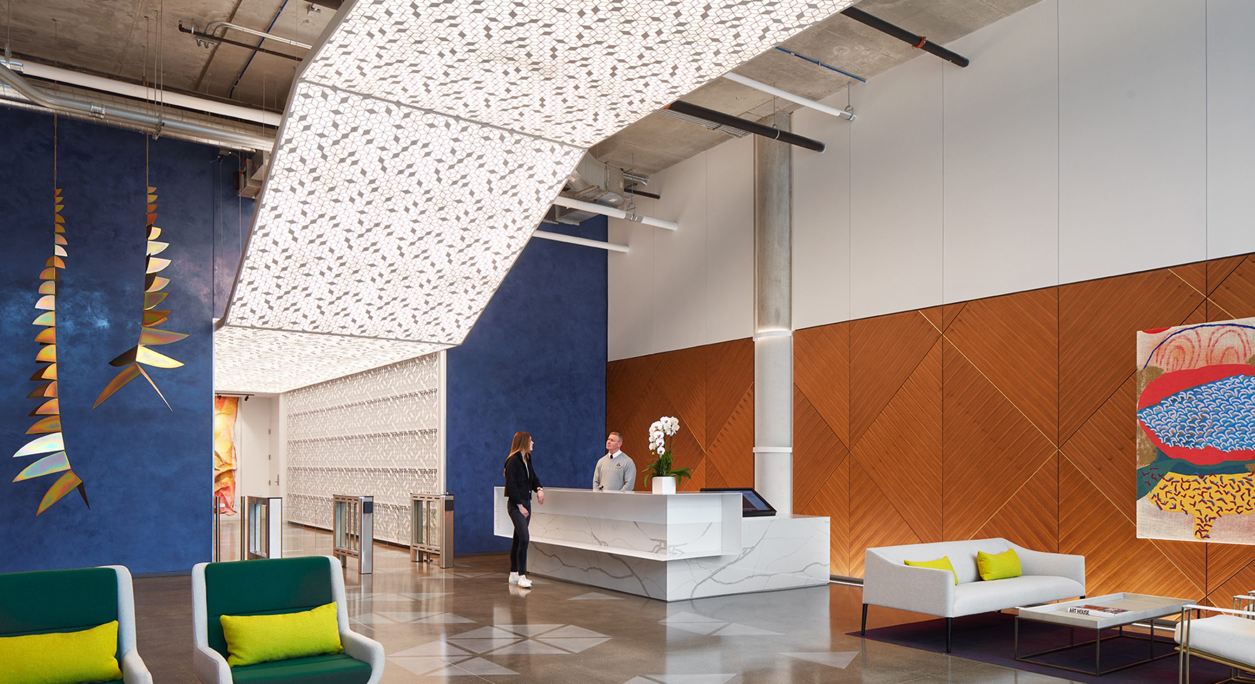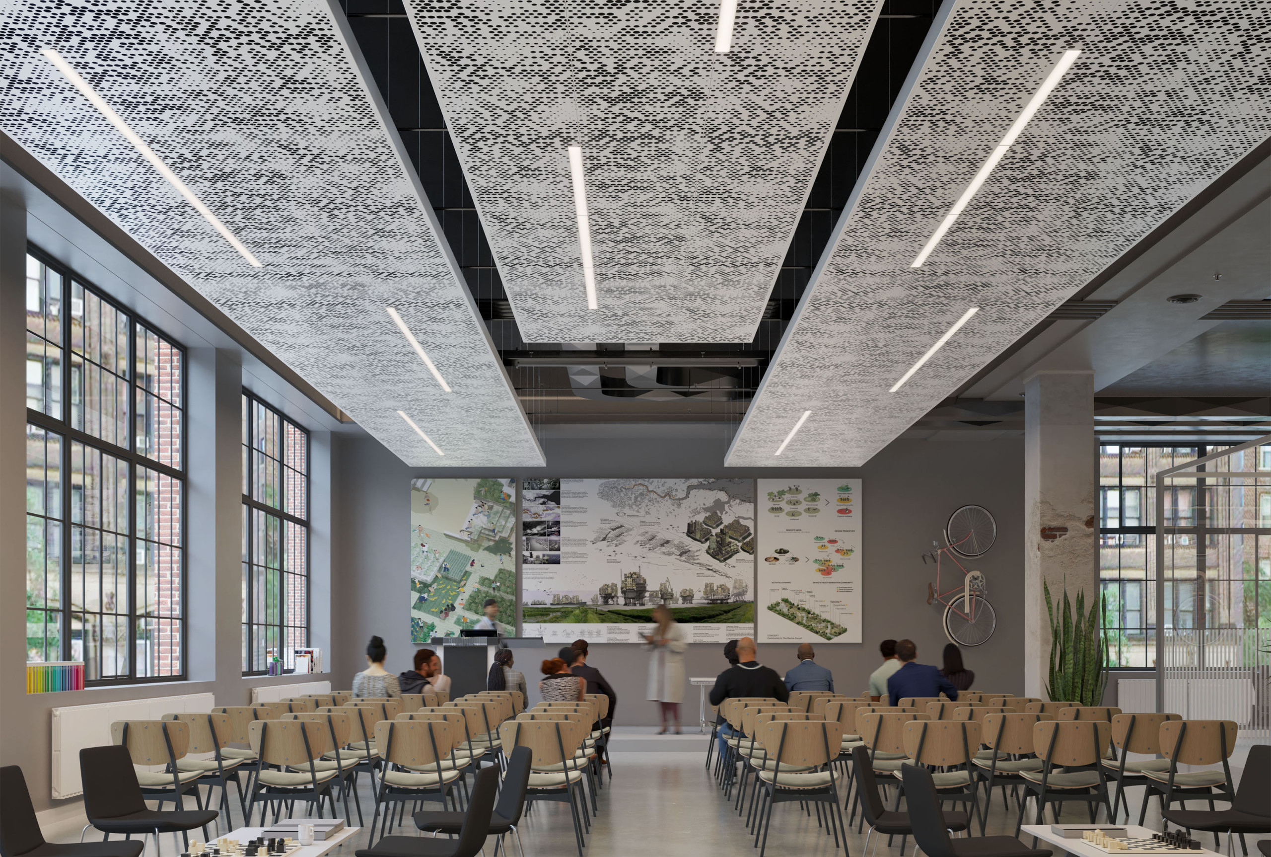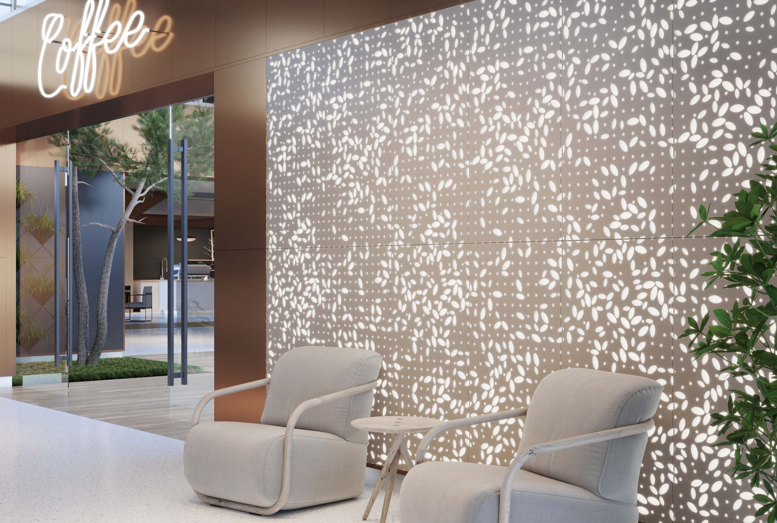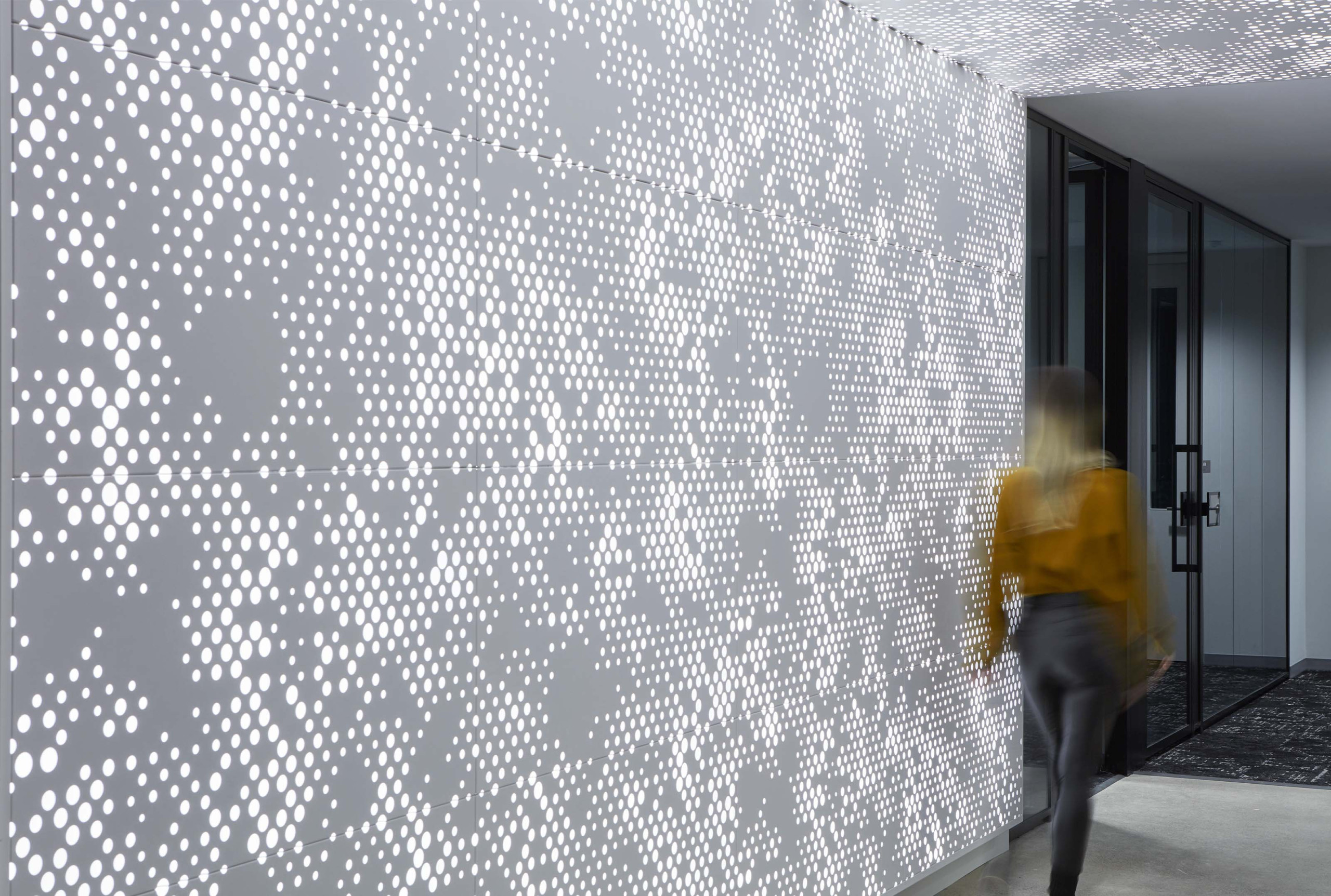 Vapor® wall and ceiling panel system achieves modern expression through abstract patterns. Its subtle complexity lends visual interest across large spans and multiple spaces. Add an optional backer, select from our acoustically performative and beautiful Soft Sound® material or close off the system with our light-transmitting frosted polycarbonate backer.