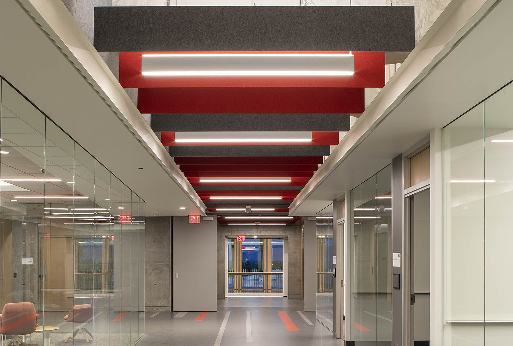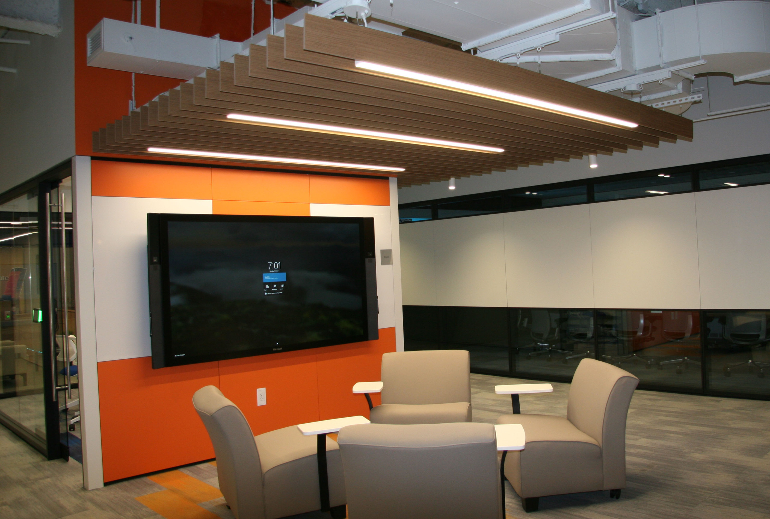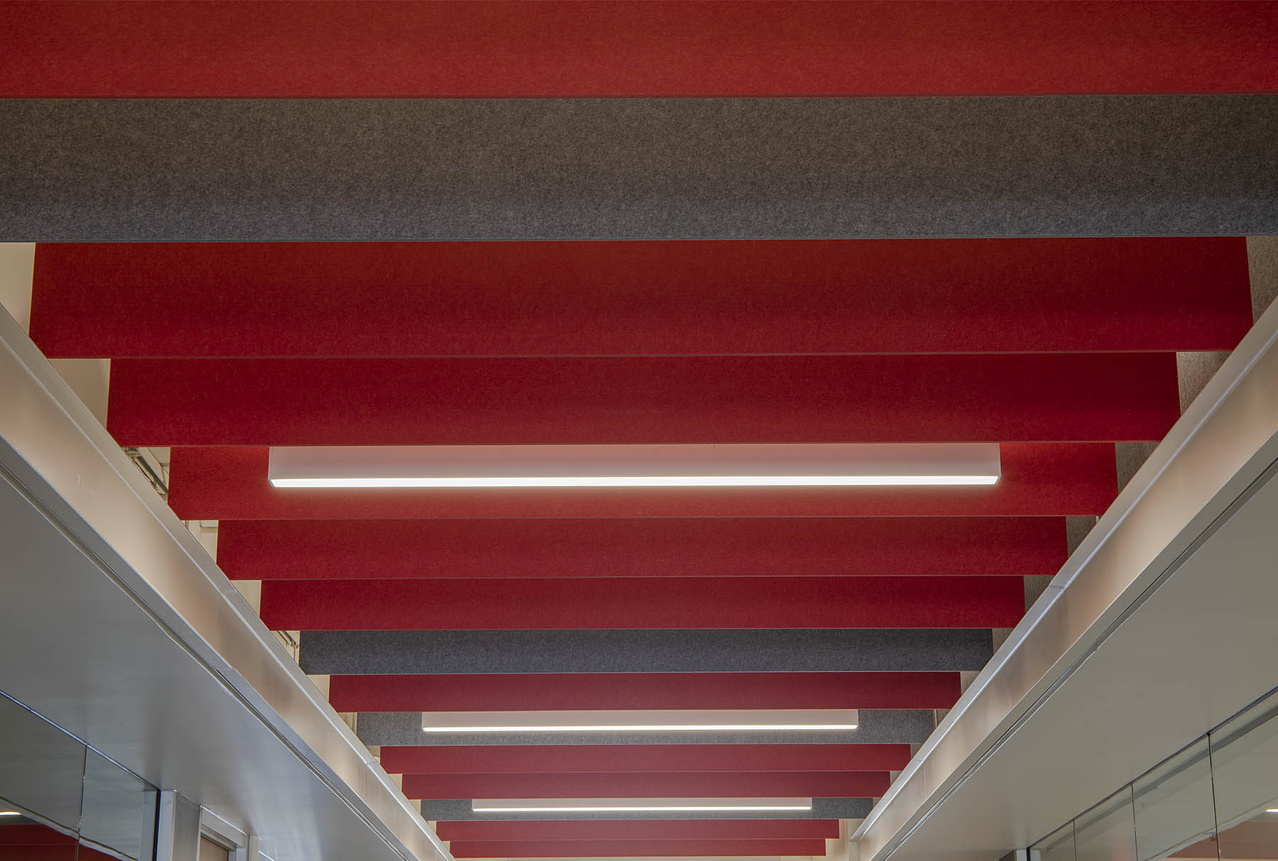 SoundEdge® ceiling system offers flexible building blocks to easily achieve enhanced acoustical performance and design effects. Its modular single fin design, available in a multitude of lengths and depths, is easy to install, and can be mixed and matched in numerous configurations. SoundEdge® is constructed from our Soft Sound® acoustical material (100% PET plastic with up to 60% recycled content) to drastically reduce sound reverberation.