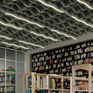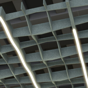 Sine’s acoustic ceiling modules create waves that flow in multiple directions for a truly eye-catching pattern that can either be used individually or connected together in a continuous field. And because it’s made of our Soft Sound® material, you can get acoustic control where you need it most. And now, for larger jobs, with the addition of SoftGrid® Max options, you can do it all while maximizing value and minimizing the impact on the environment. Optional accessories include integrated lighting, bringing acoustics and illumination together in one package.