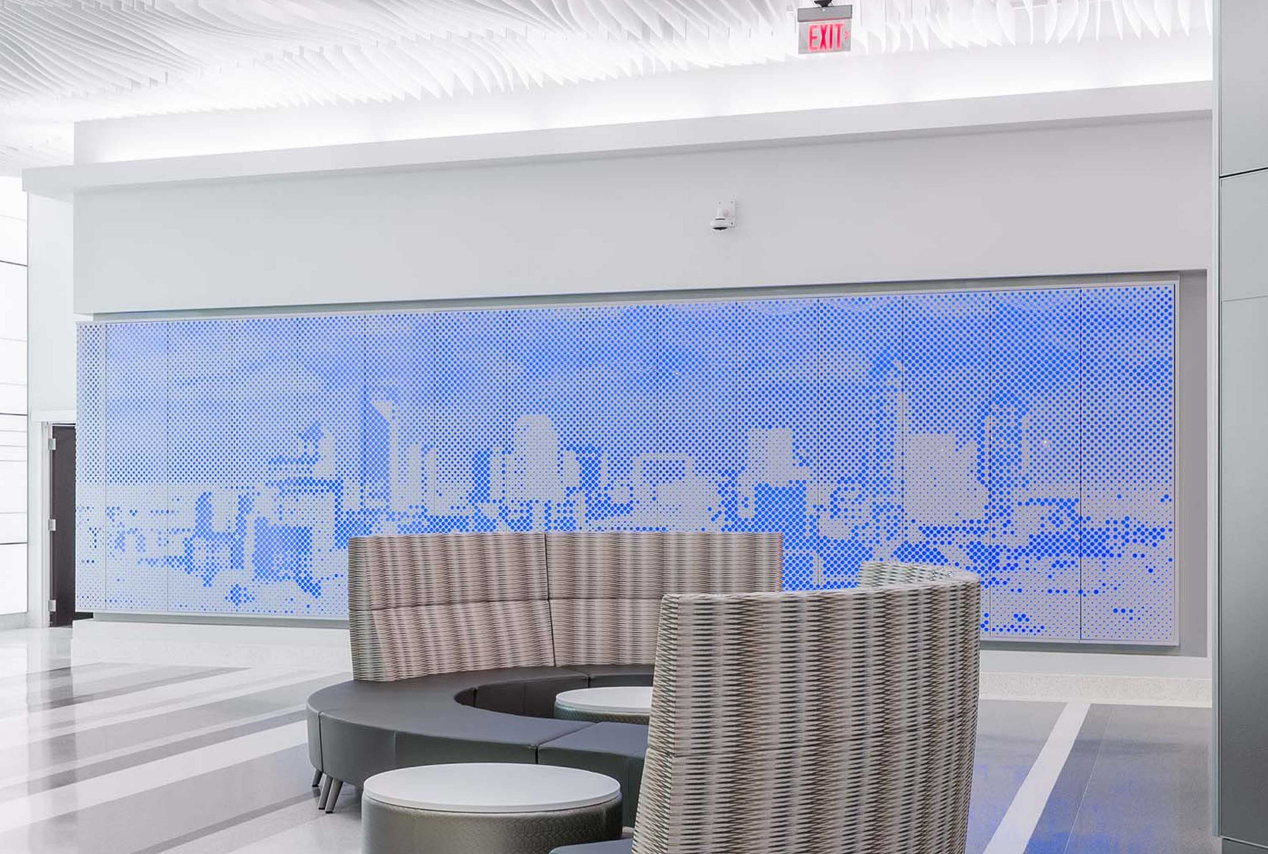 Vapor® Graphic Perf® turns wall and ceiling tiles into a limitless canvas, combining the best aspects of two of Arktura’s most popular offerings – Vapor® and Graphic Perf® – into one versatile system. Let Arktura apply its proprietary, algorithmic software and manufacturing expertise to transfer any image or pattern into perforated metal torsion spring panels. Like our Vapor® Family of Products, these are fully compatible with Arktura’s Vertika® wall channel and standard grid systems, to make installation across walls and ceilings effortless. Add available custom color, Soft Sound® acoustic backer panels, and Arktura’s integrated lighting, and the opportunities are truly endless.
