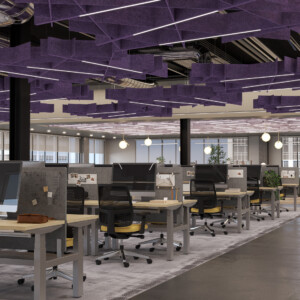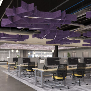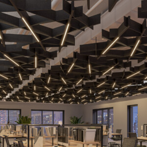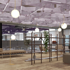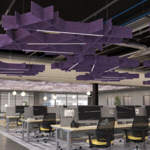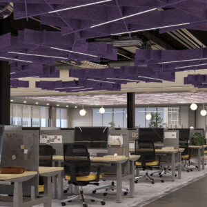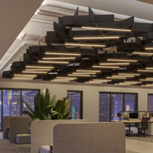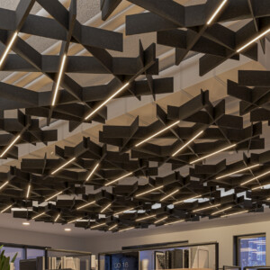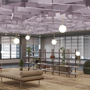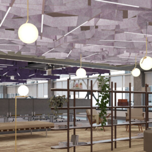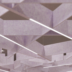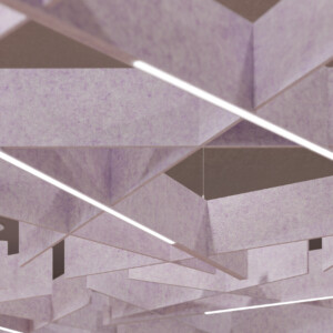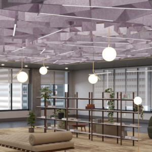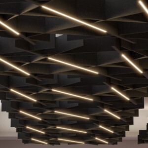 Switch’s acoustic ceiling modules may look like a random pattern of panels but they have been perfectly designed to create an intricate web on your ceiling. With seamless connection, you can make your web as large or as small as you want. Either way, you’ll still get acoustic support thanks to the Soft Sound® material it’s designed from. And now, for larger jobs, with the addition of SoftGrid® Max options, you can do it all while maximizing value and minimizing the impact on the environment. Optional accessories include integrated lighting, bringing acoustics and illumination together in one package.