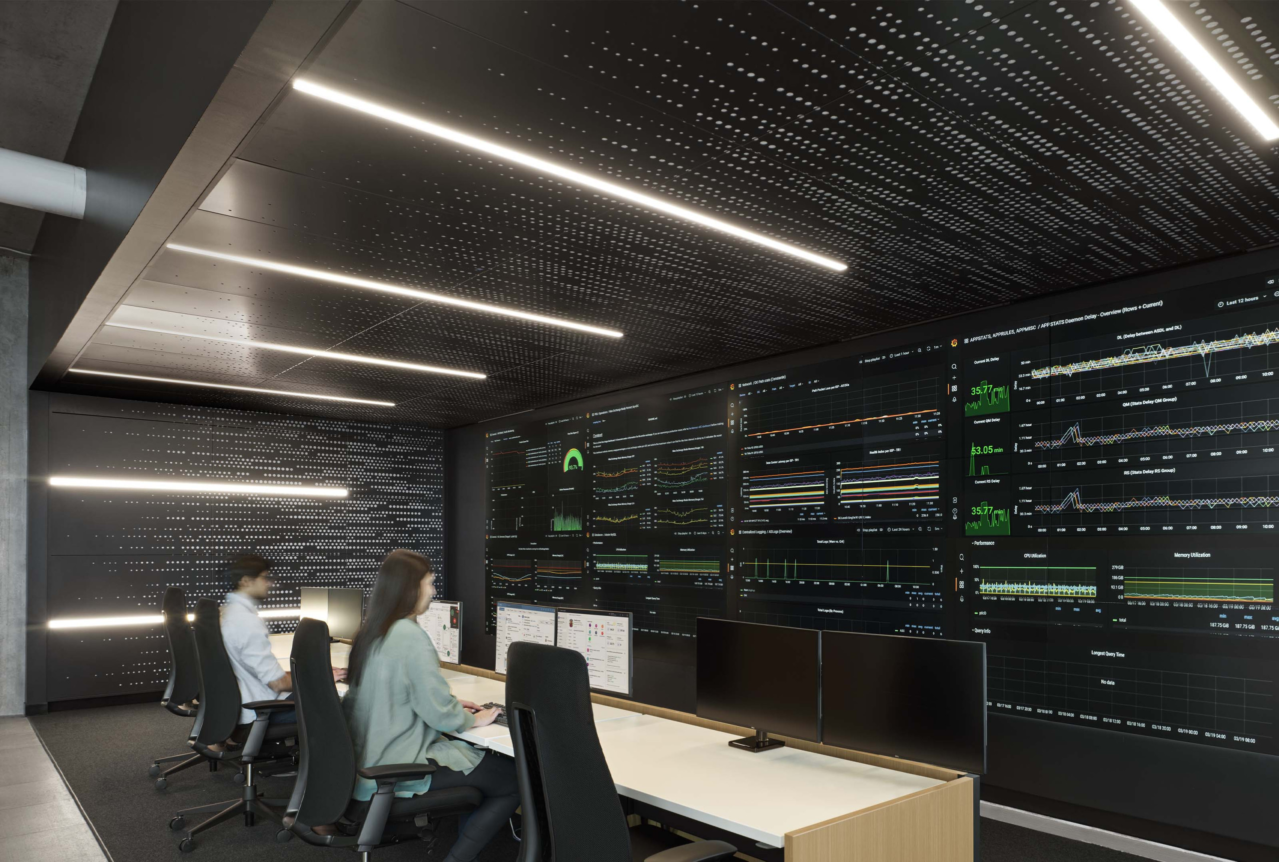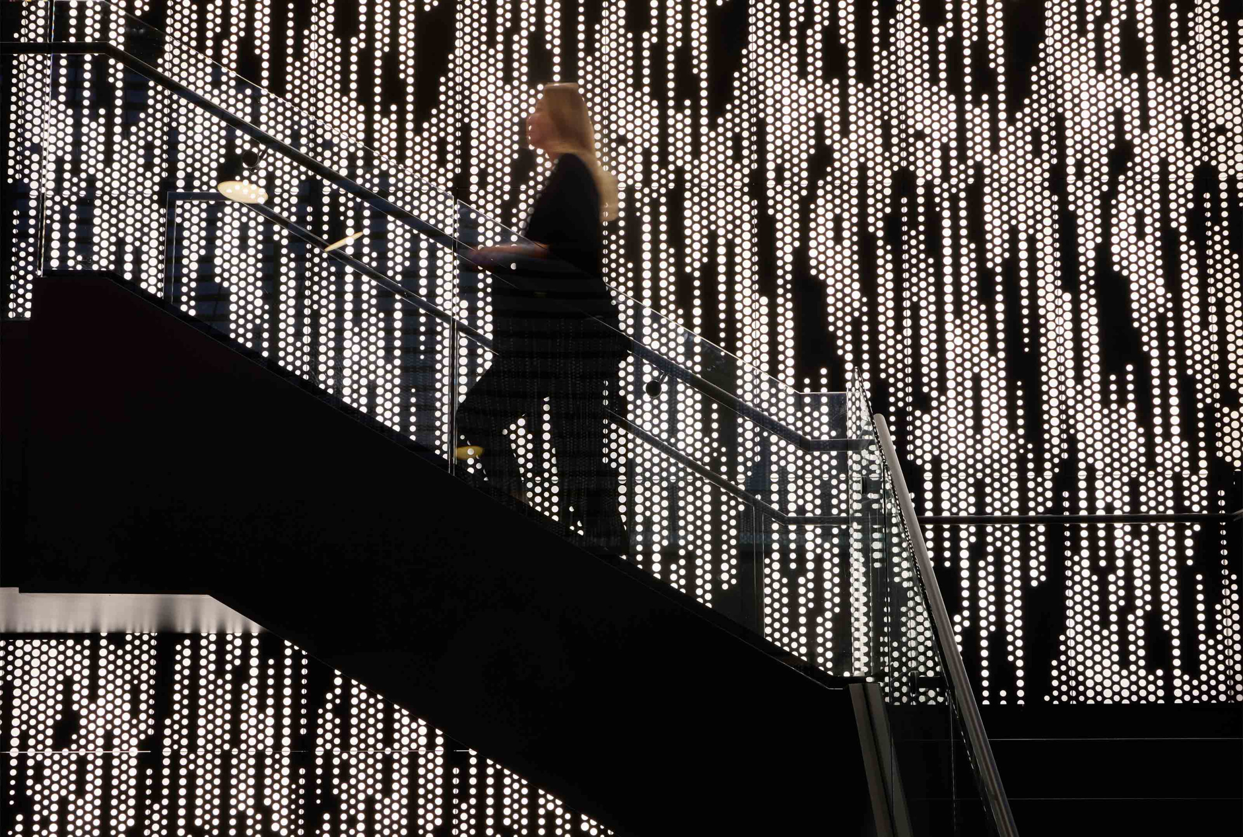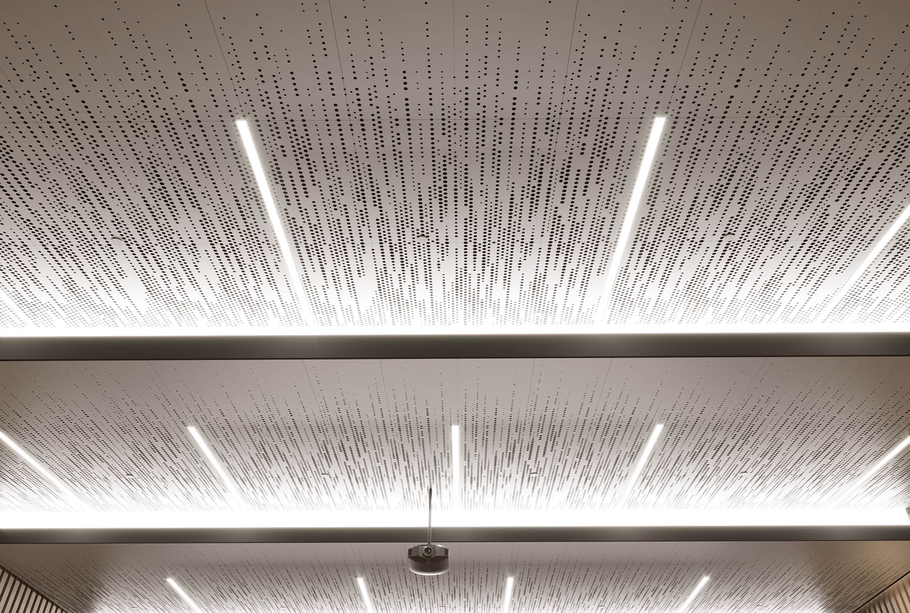 Frequency powder-coated aluminum torsion spring panels bring the digital world into reality. With a design that starts off intense and fades away, you can create a path for people to follow, while reducing the sound of their steps thanks to our Soft Sound® backer. Or add our integrated lighting backer to take the digital feel to another level.