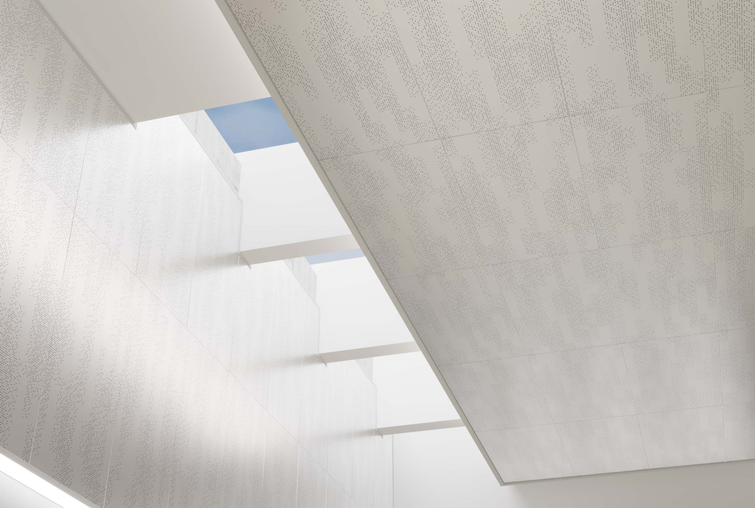 Particle® micro-perforated ceiling and wall panel system offers the same ease of install, scalability, you’ve grown to expect from Arktura’s torsion spring panel systems, with finer detail than ever before. Its intricate yet subtle complexity lends visual interest to spaces big and small and will have people looking twice. Add depth and performance with our sound attenuating non-woven acoustic fabric or light-transmitting frosted polycarbonate backers, or seamlessly integrate Arktura InLine or Backlight illumination to make your design truly shine.