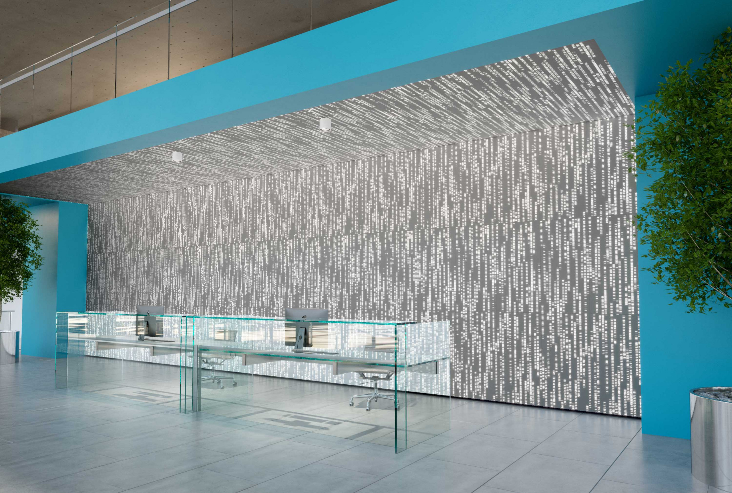 Particle® Code affects a tech-focused aesthetic to your space with linear micro-perforations inspired by genome sequencing and lines of digital code. Similar to our Vapor® Products, this panel system is fully compatible with Arktura’s Vertika® wall channel and standard grid systems, to make installation across walls and tiled ceiling systems effortless. Add available custom colors, non-woven acoustic fabric backers, to reduce noise, and Arktura’s integrated lighting, and the possibilities are truly endless.
