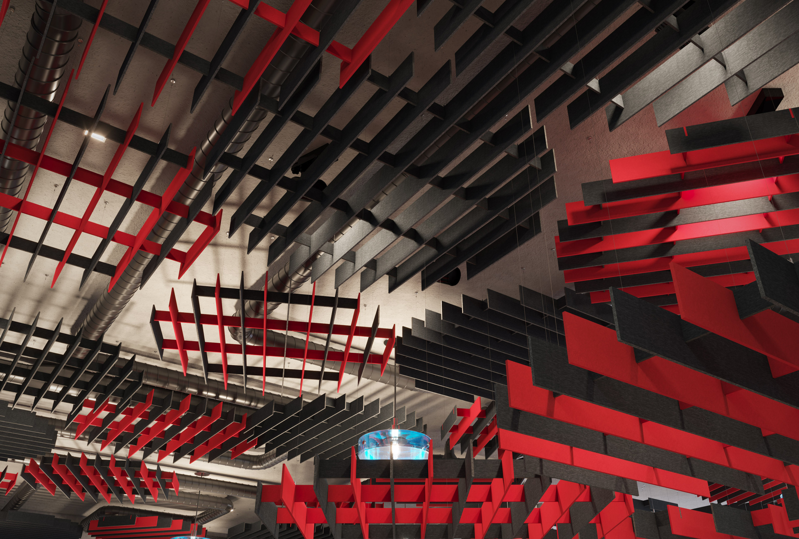 Round’s acoustic ceiling modules create a circular shape using consistently spaced panels at different lengths, for a structural design that’s sure to impress while also providing acoustic support due to the Soft Sound® material. Round’s baffles create a continuous series of rings that can connect together for an intricate design that emcompasses the whole ceiling or can be focused over a singular area for focused acoustic support. And now, for larger jobs, with the addition of SoftGrid® Max options, you can do it all while maximizing value and minimizing the impact on the environment.
