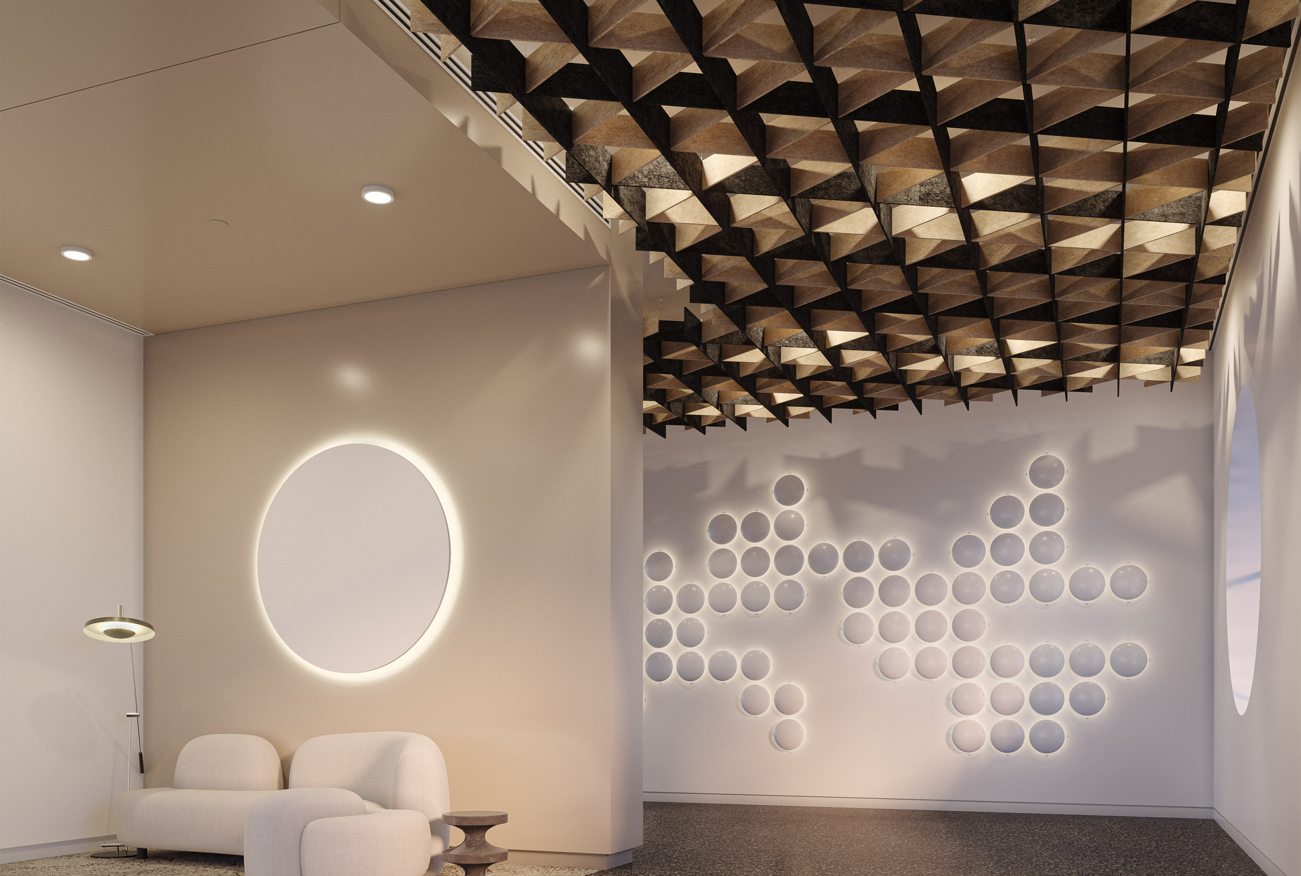 Crisscrossing linear baffles made of our Soft Sound® acoustic material make up the lattice-like structure of SoftGrid® Trella. Connect multiple Trella modules to create a vast trellis across your ceiling, blanketing a room in auditory serenity. To further customize your acoustic experience, these cloud systems are available in a wide variety of Soft Sound® finishes, including premium wood textures, and Duo Tone finish, unlocking new design possibilities.