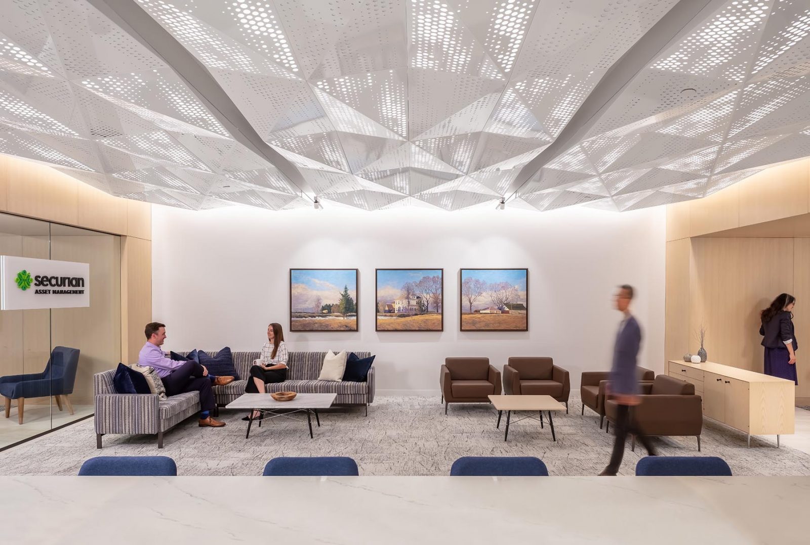 TriSoft® ceiling system makes it easy to add faceted dimensionality and quiet elegance to interiors. Its triangular faceted pyramid faces are composed of our Soft Sound® acoustical material (100% PET…