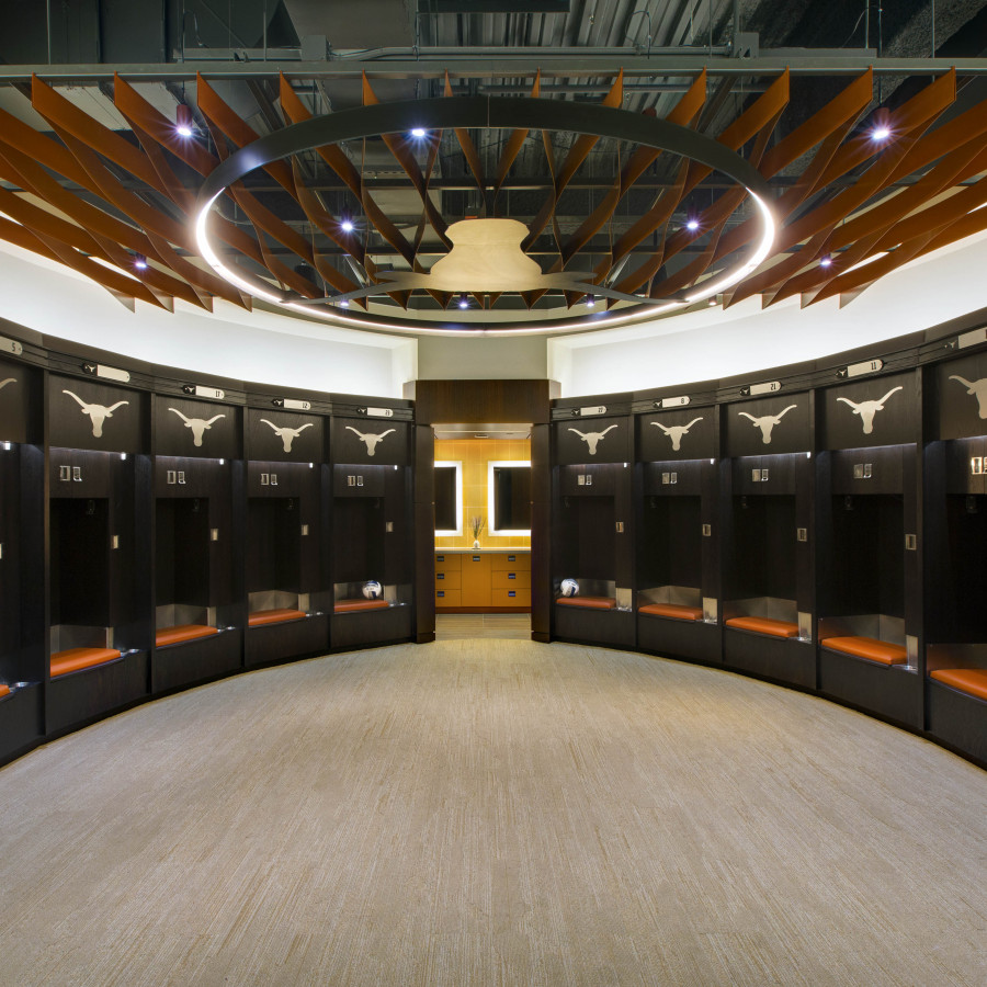 CBRE | Heery worked to imbue the two story, 26,749 sqft women’s volleyball practice facility of University of Texas with the spirit of the school and its team. The materials and finishes chosen were selected with that in mind. Atmosphera® Ripple in a custom burnt orange color to match the school colors was used to help bring team spirit and energy to the locker room and lounge.
