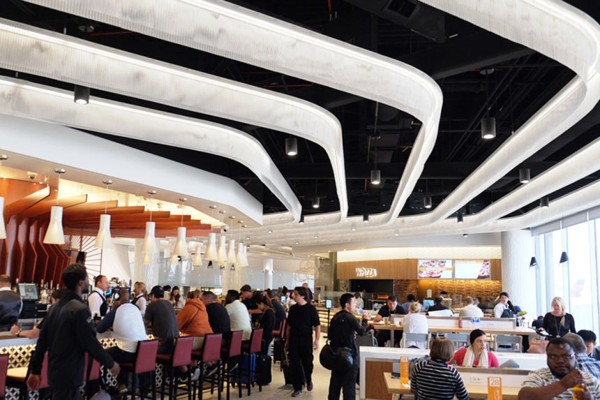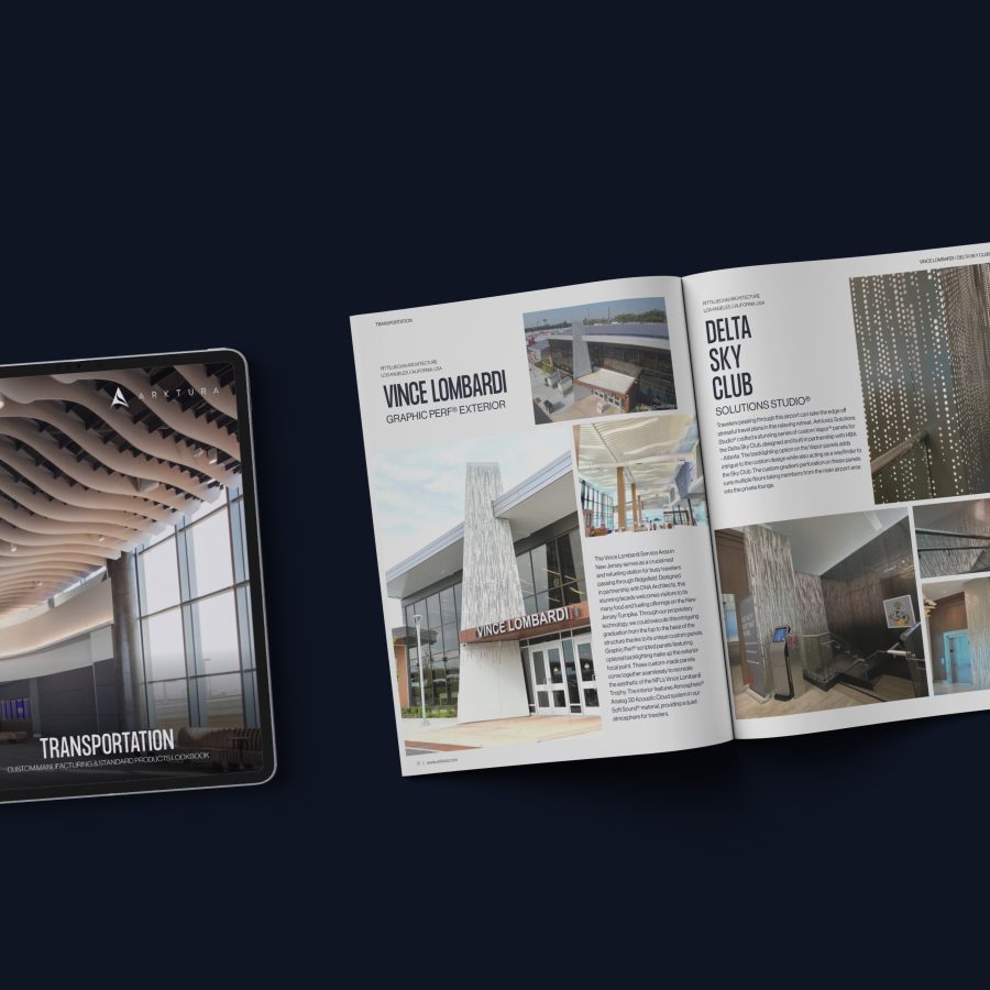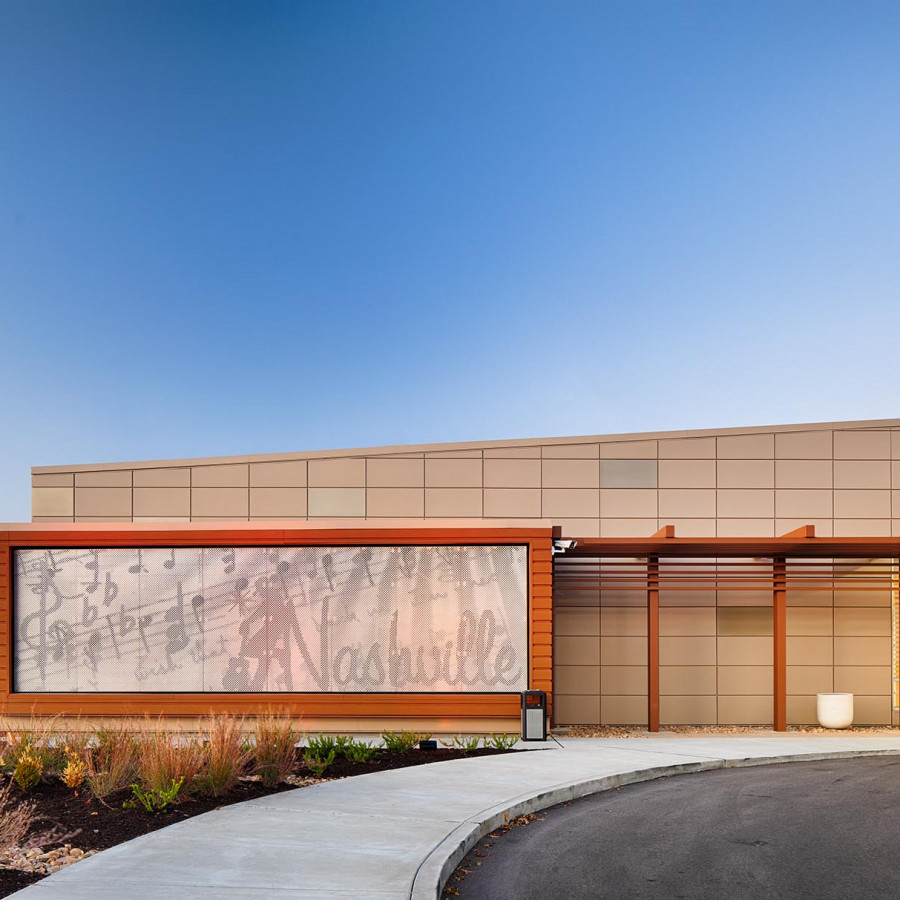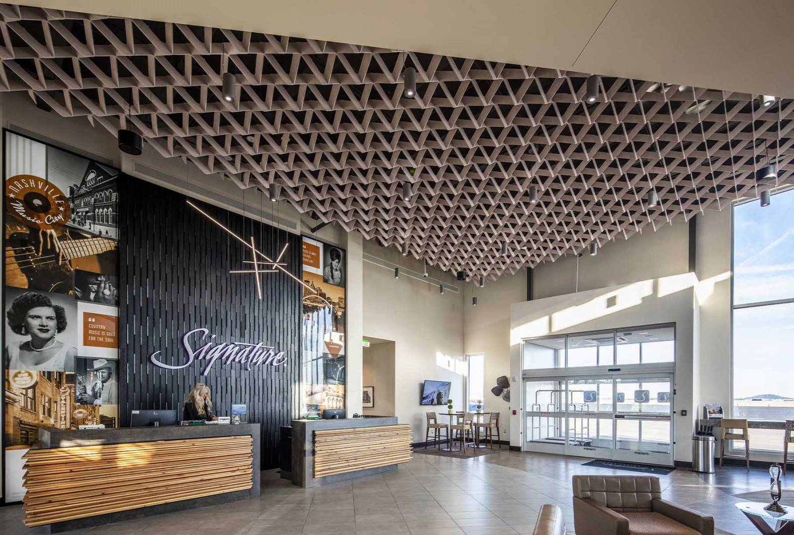 Signature FS unveiled their new FBO terminal at Nashville International Airport, featuring numerous systems and solutions by Arktura. Travelers and pilots are greeted upon arrival with an extensive Graphic Perf® Custom Photoreal Exterior treatment, paying homage to Nashville’s iconic music legacy. For the interior, SoftGrid® Wave system is paired with the subtle, complementary system, Atmosphera® Linea, to communicate an environment acoustically attuned to luxury. The naturally tonal variations of Arktura’s materials compliment Signature’s artifacts, from musicians and celebrities who pass through their gates, prominently displayed through the terminal design.